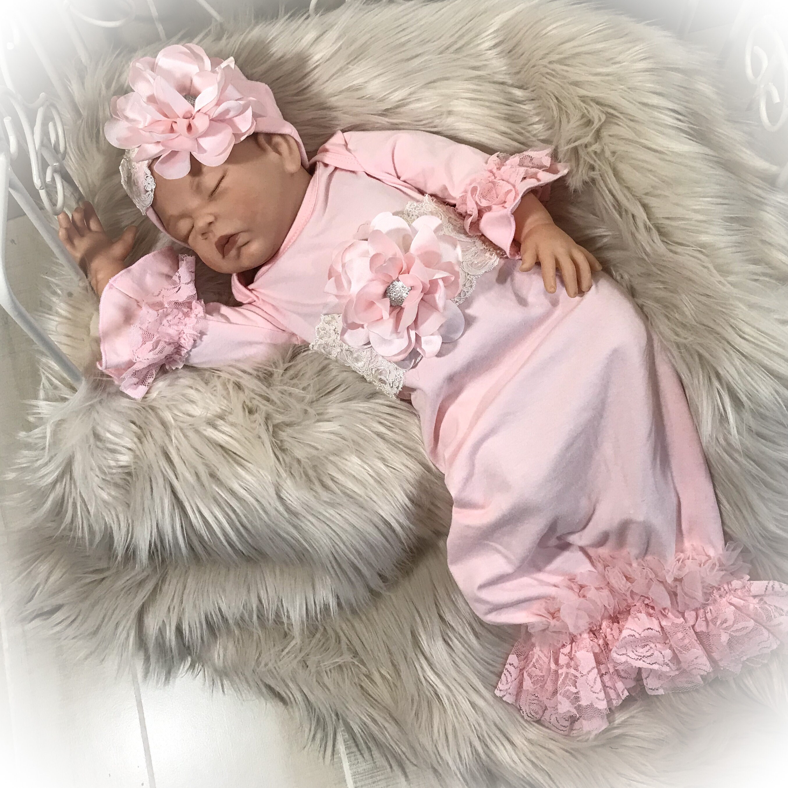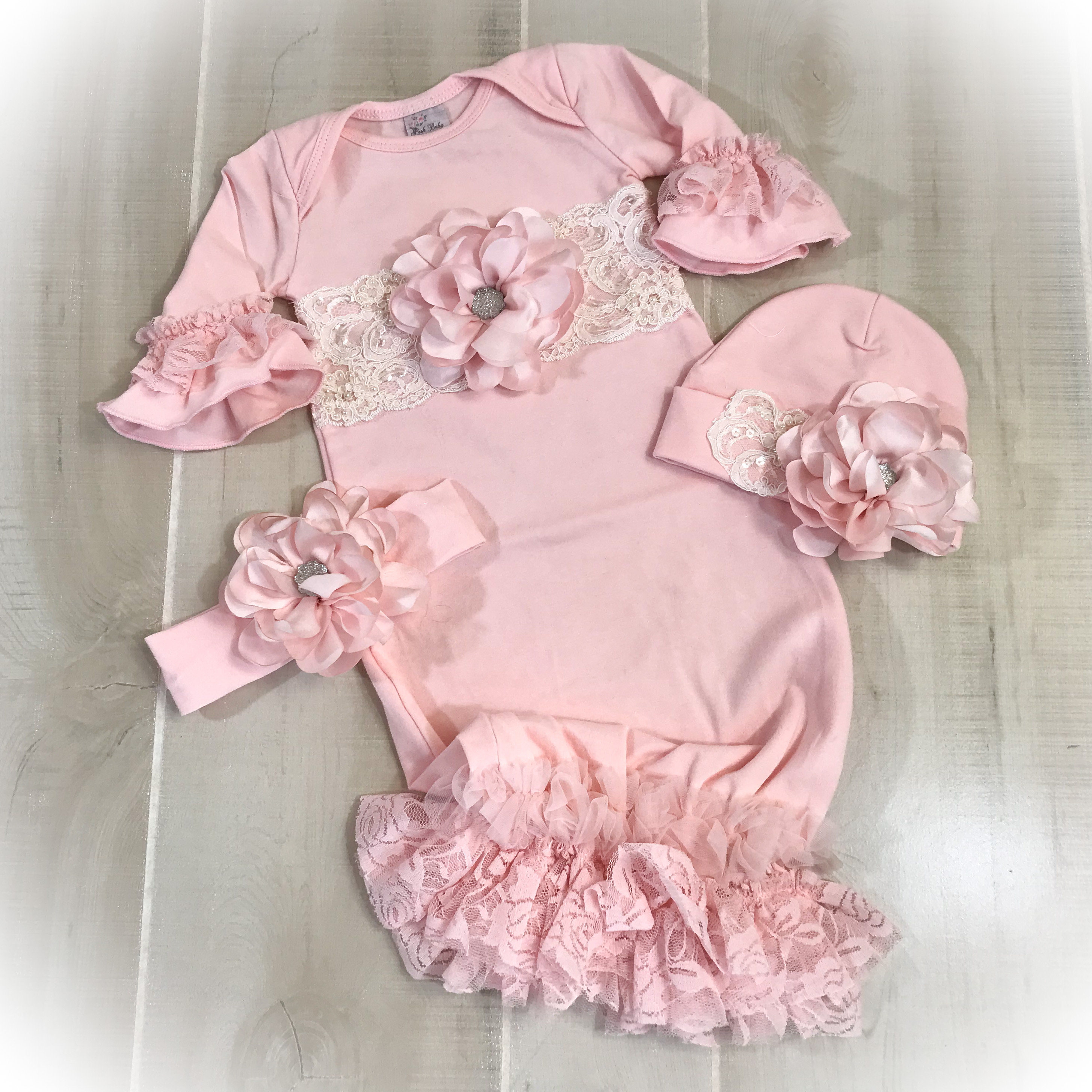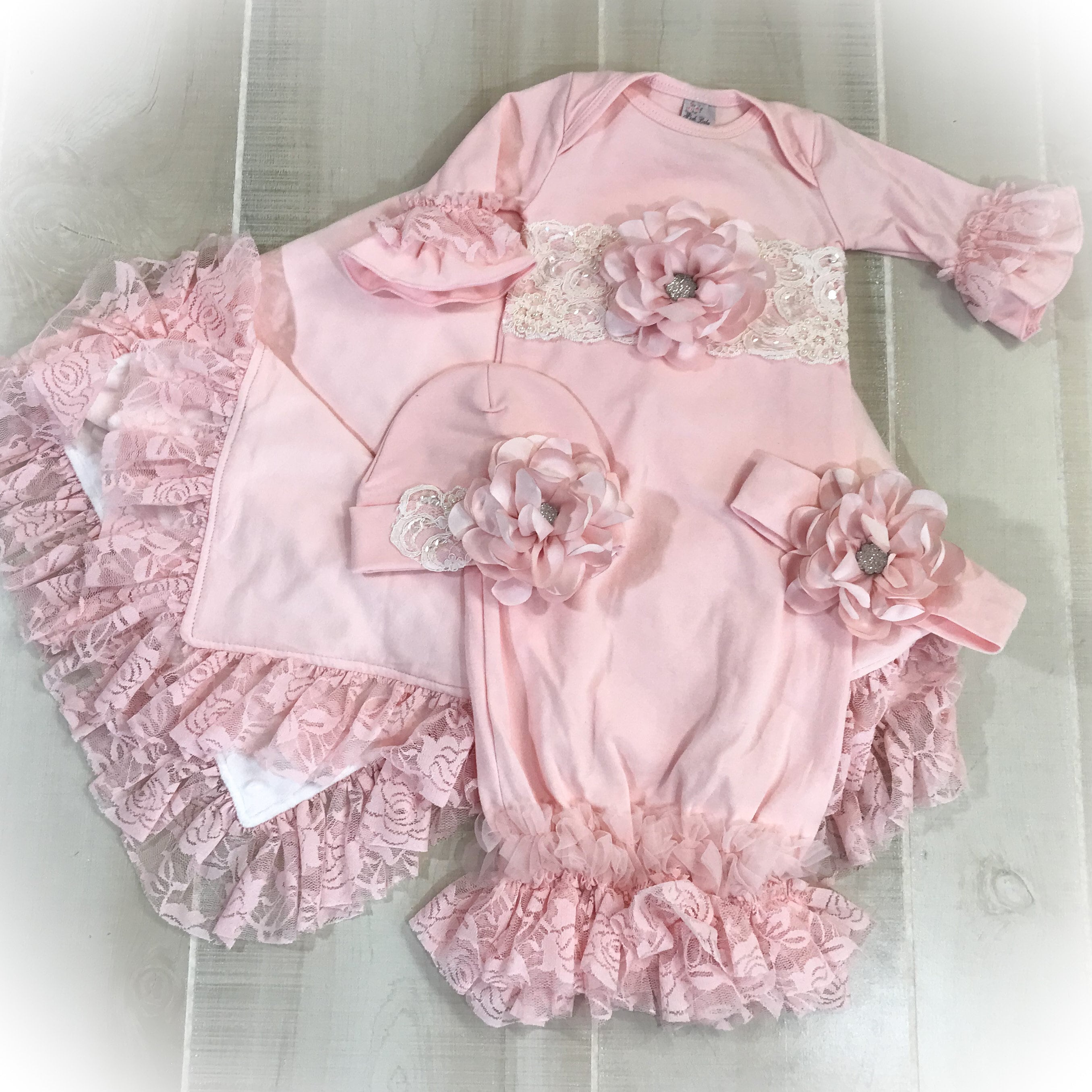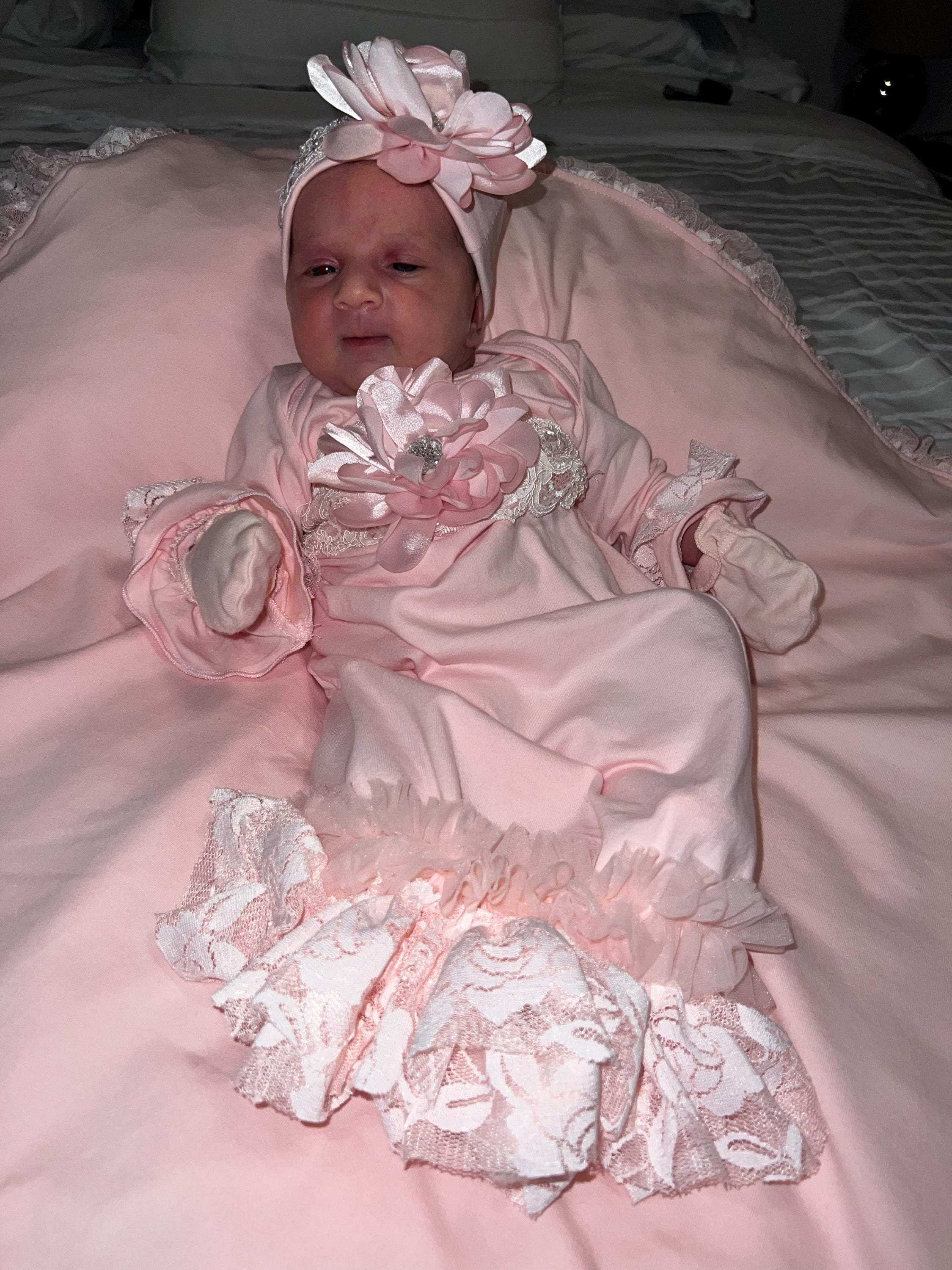This stunning Lace trimmed coming home gown feature beautiful soft pink lace and pink chiffon around the bottom and ruffle sleeve. Exquisite ivory beaded trim across the yoke accented with a gorgeous satin flower with sparkling stone center.
