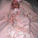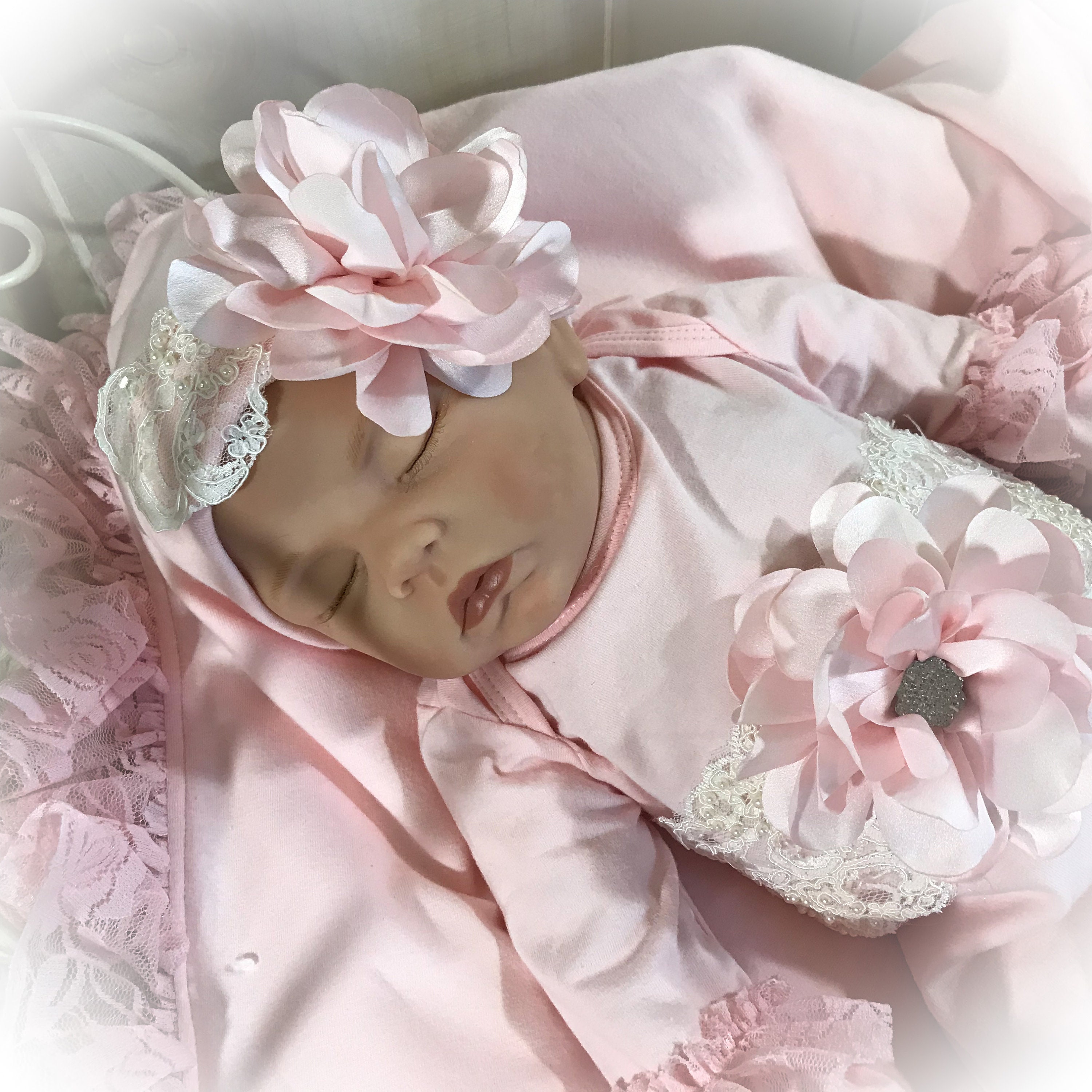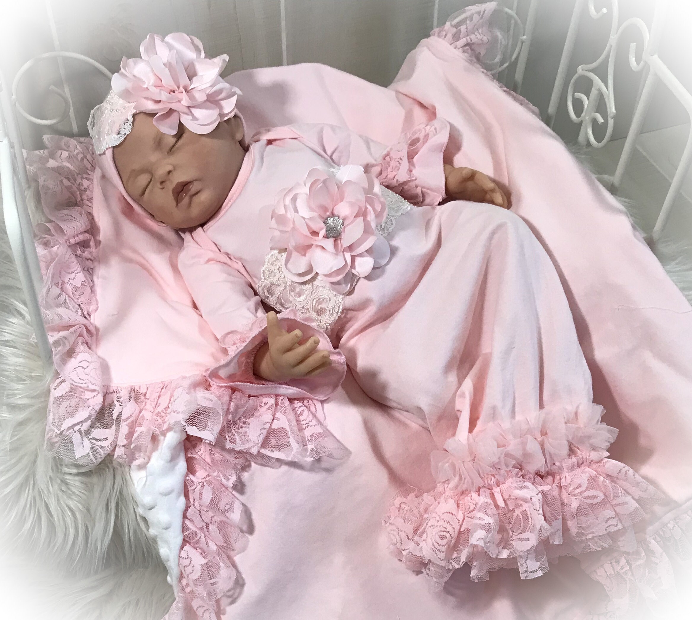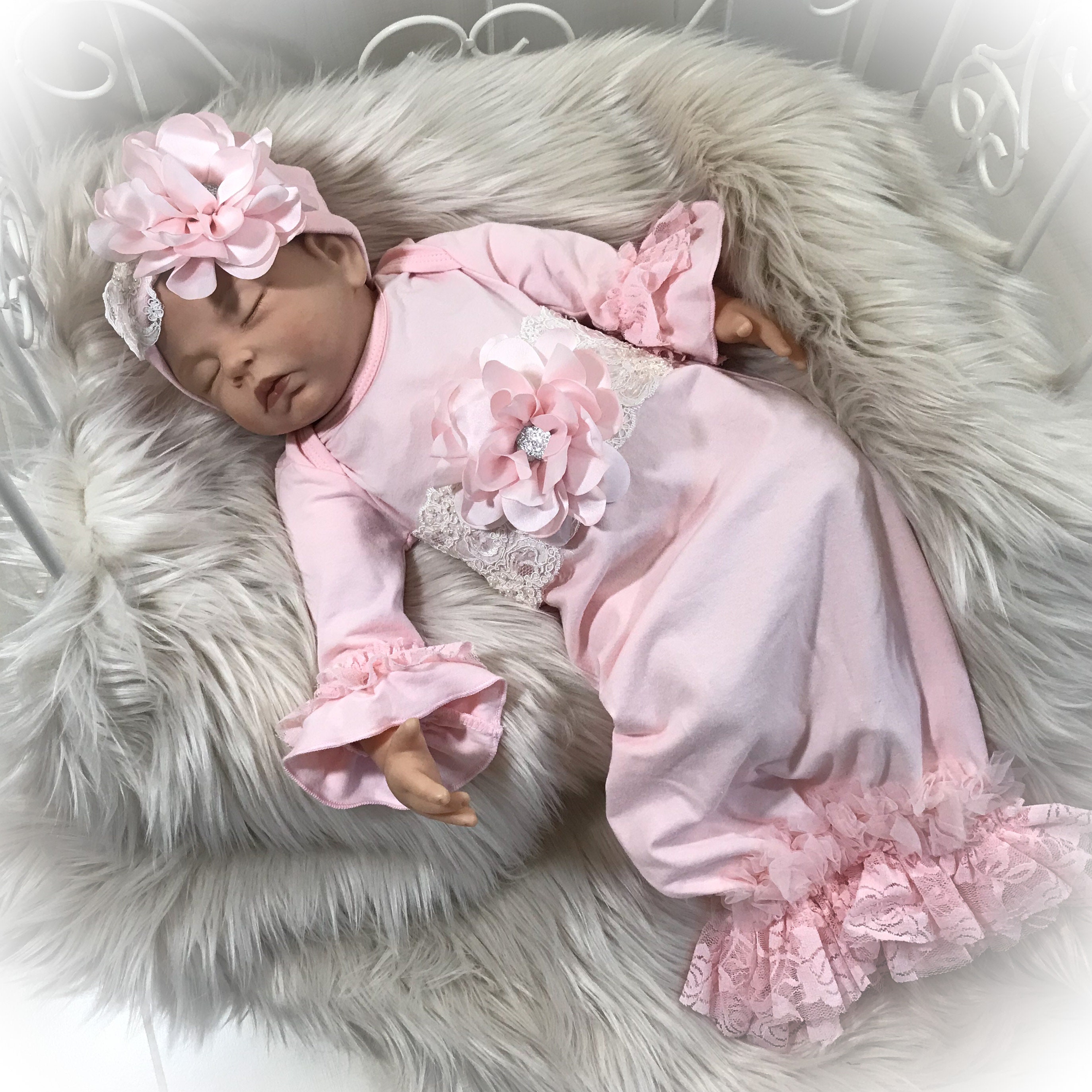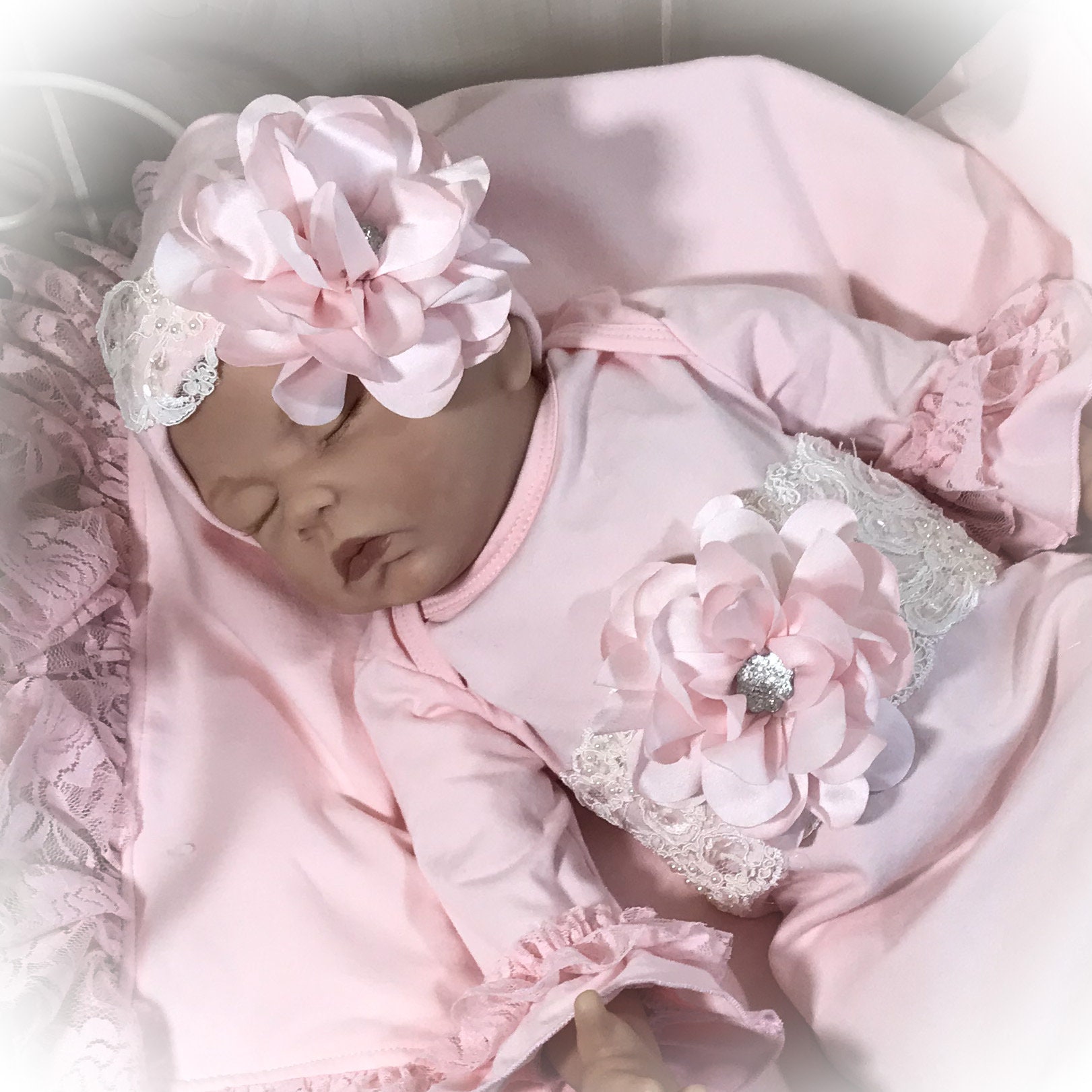 This stunning Lace trimmed coming home gown feature beautiful soft pink lace and pink chiffon around the bottom and ruffle sleeve. Exquisite ivory beaded trim across the yoke accented with a gorgeous satin flower with sparkling stone center.