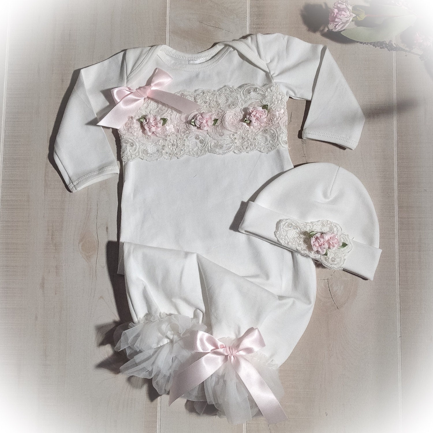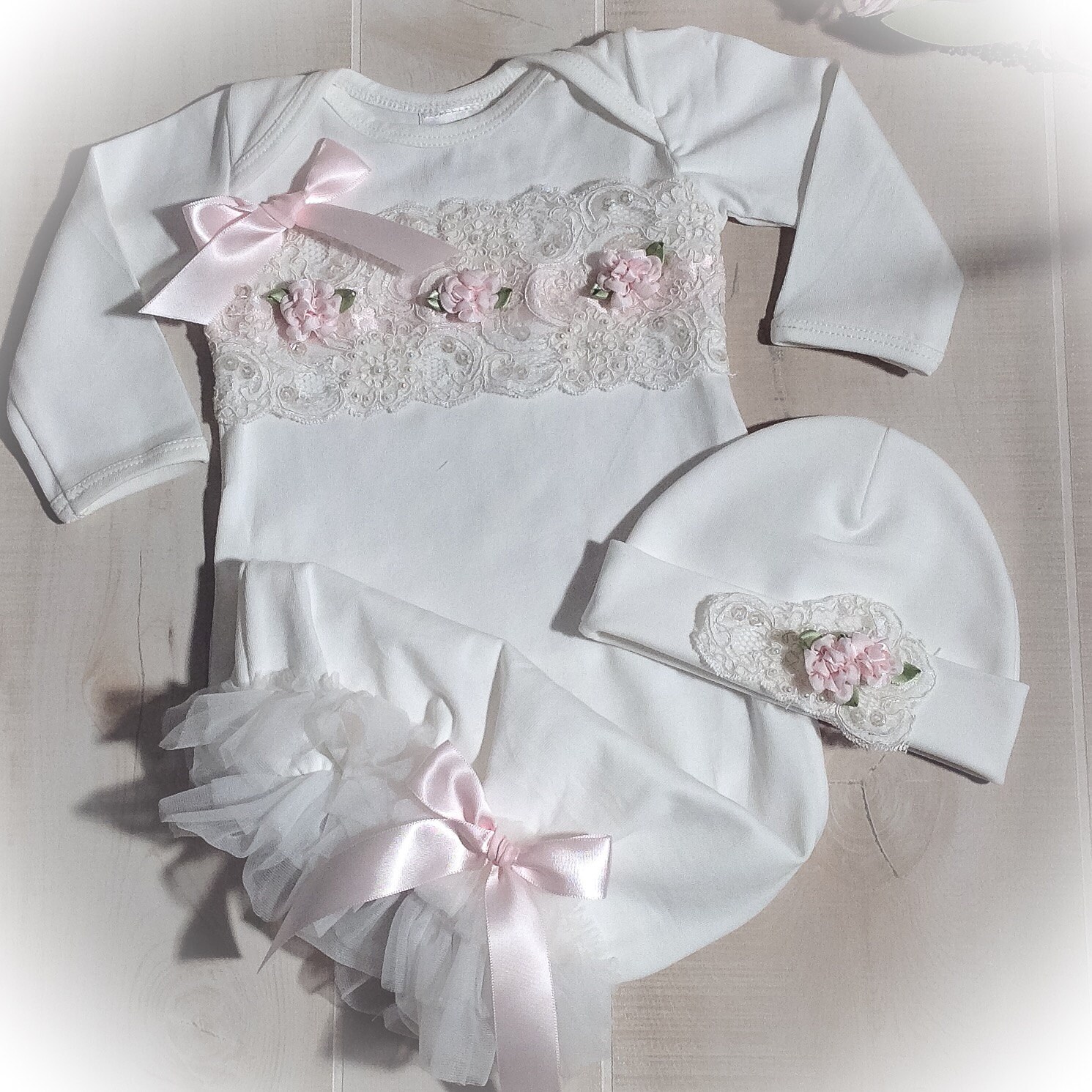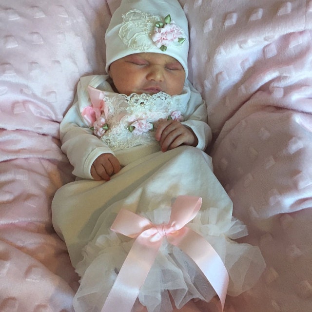 This sweet Ivory take me home gown and cap set is embellished with beautiful ivory sequin and beaded trim. Accented with beautiful pale cameo pink satin flowers and bows. The bottom of the gown features rows of fluffy ivory tulle accented with a satin bow. The matching cap completes the outfit, each of these stunning gowns is lovingly hand made for your special little girl.