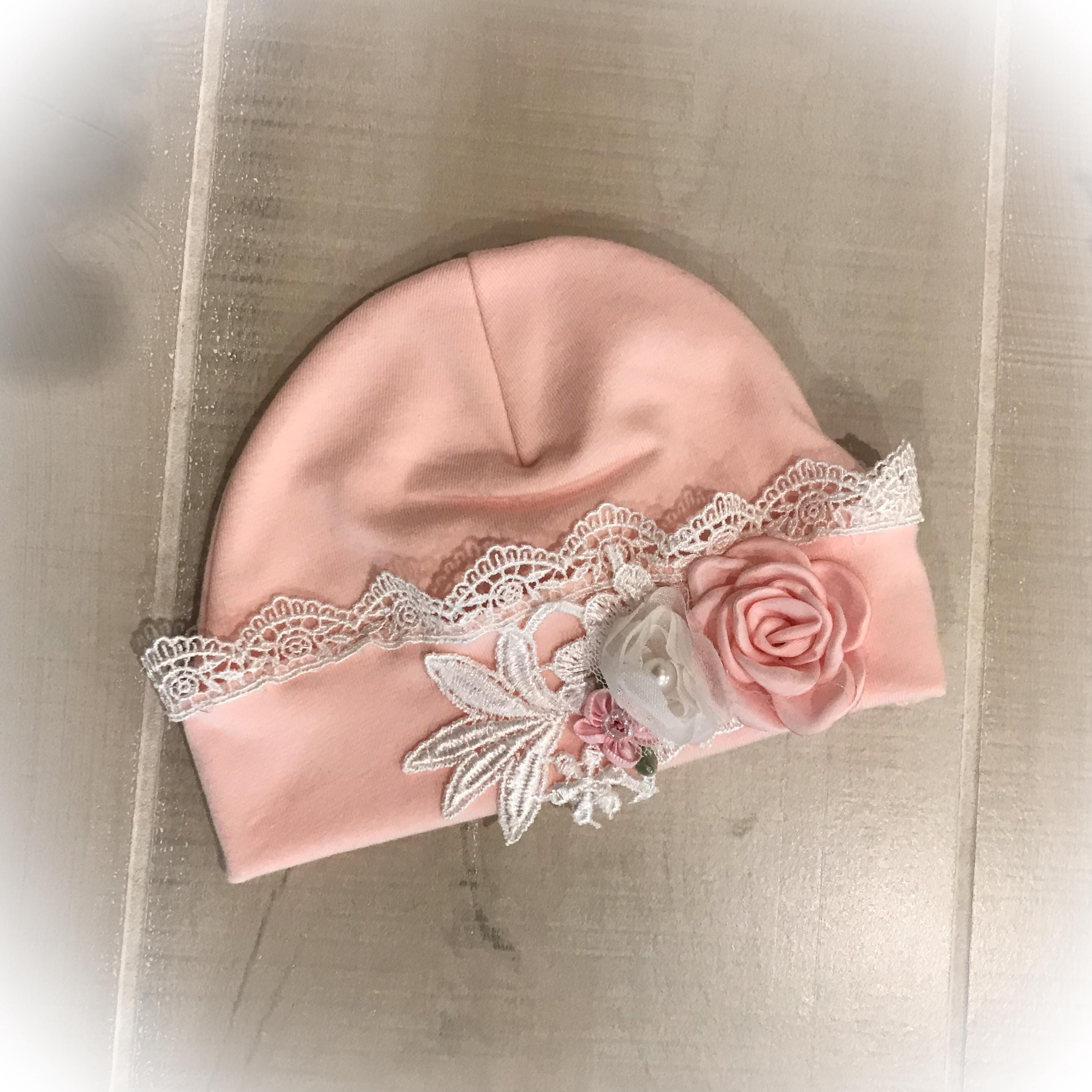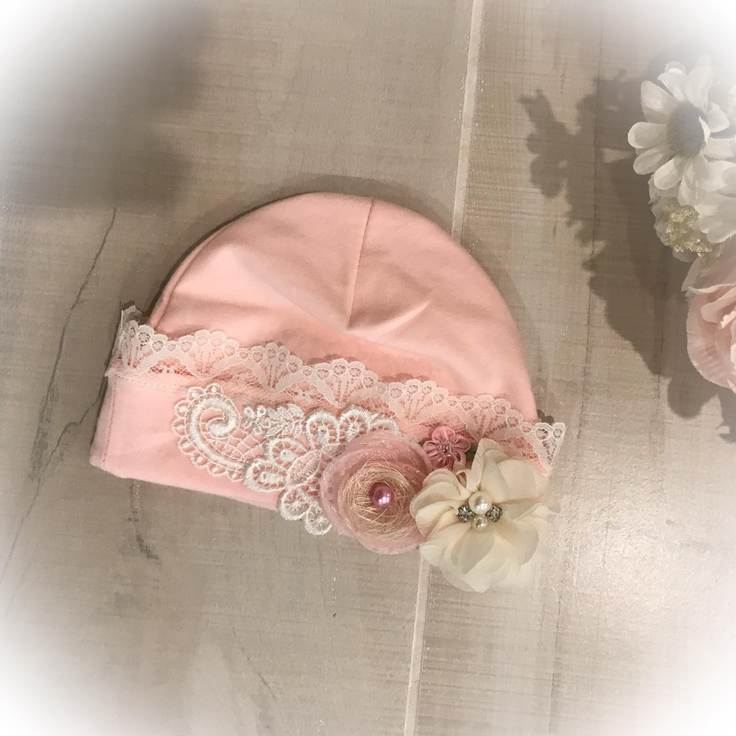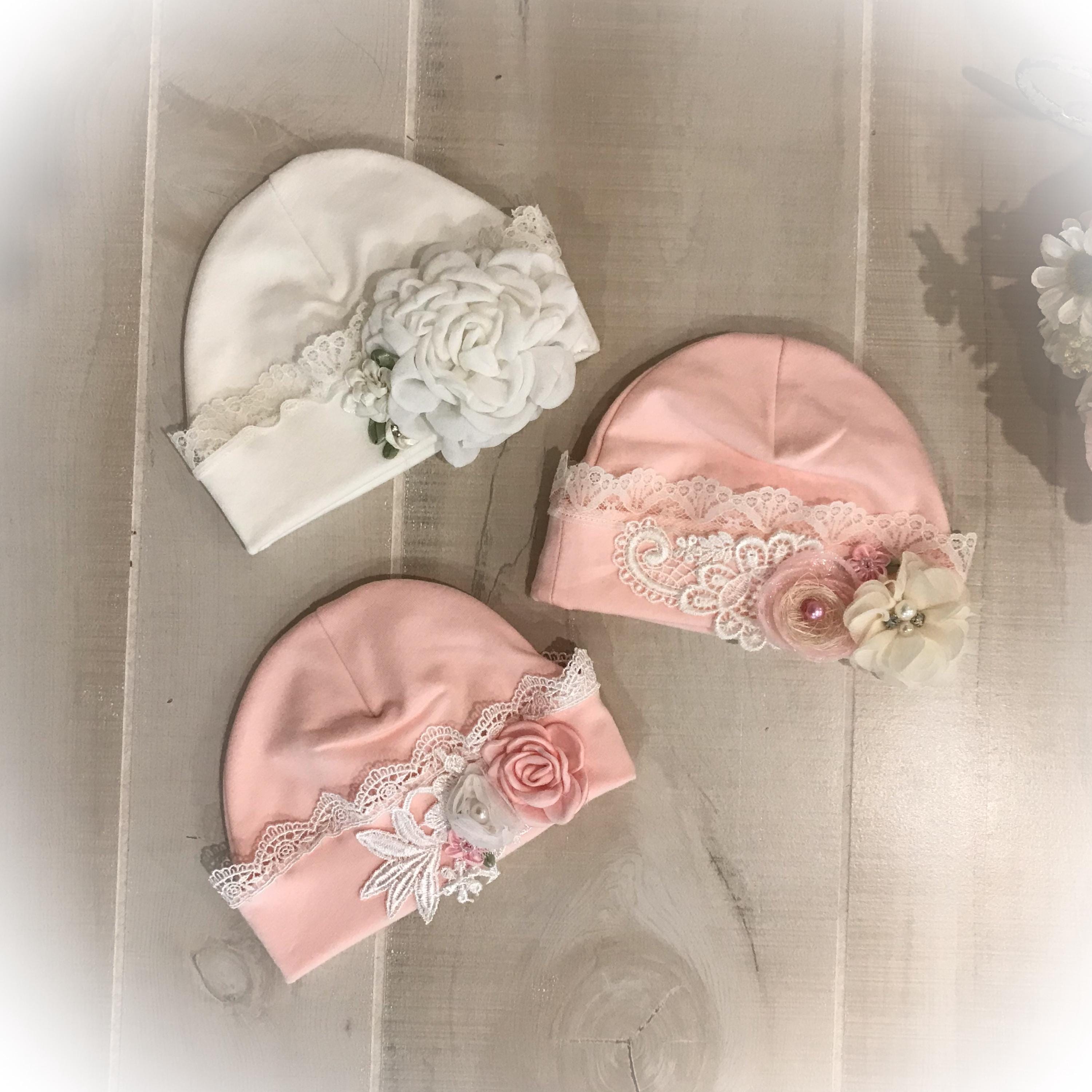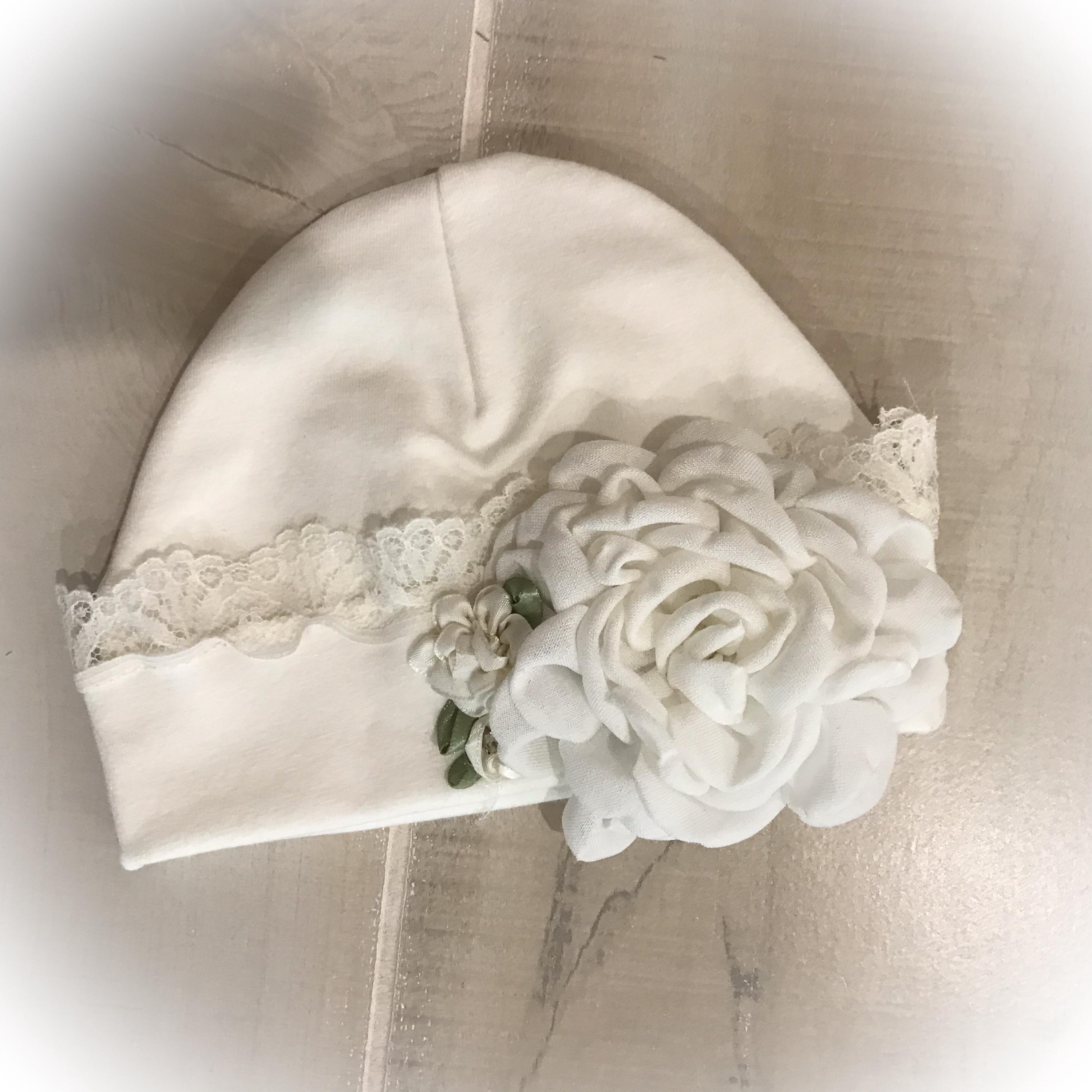 The soft newborn cap is made from a cotton/spandex blend for the perfect fit. It features ivory lace around the brim and an adorable lace flower and satin flowers. 3 styles available