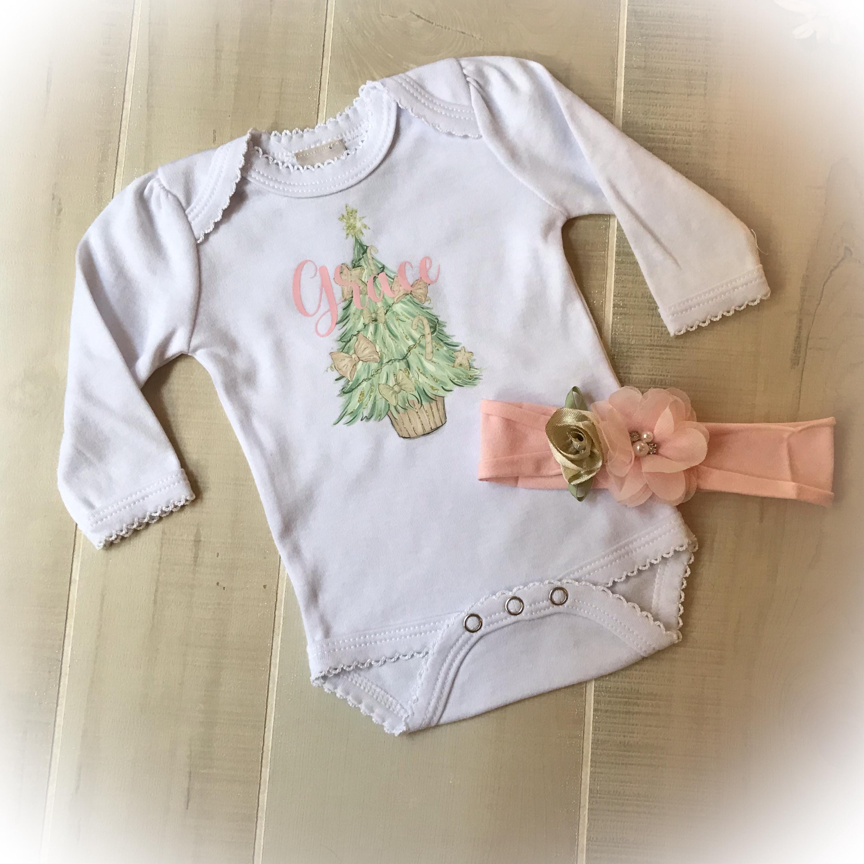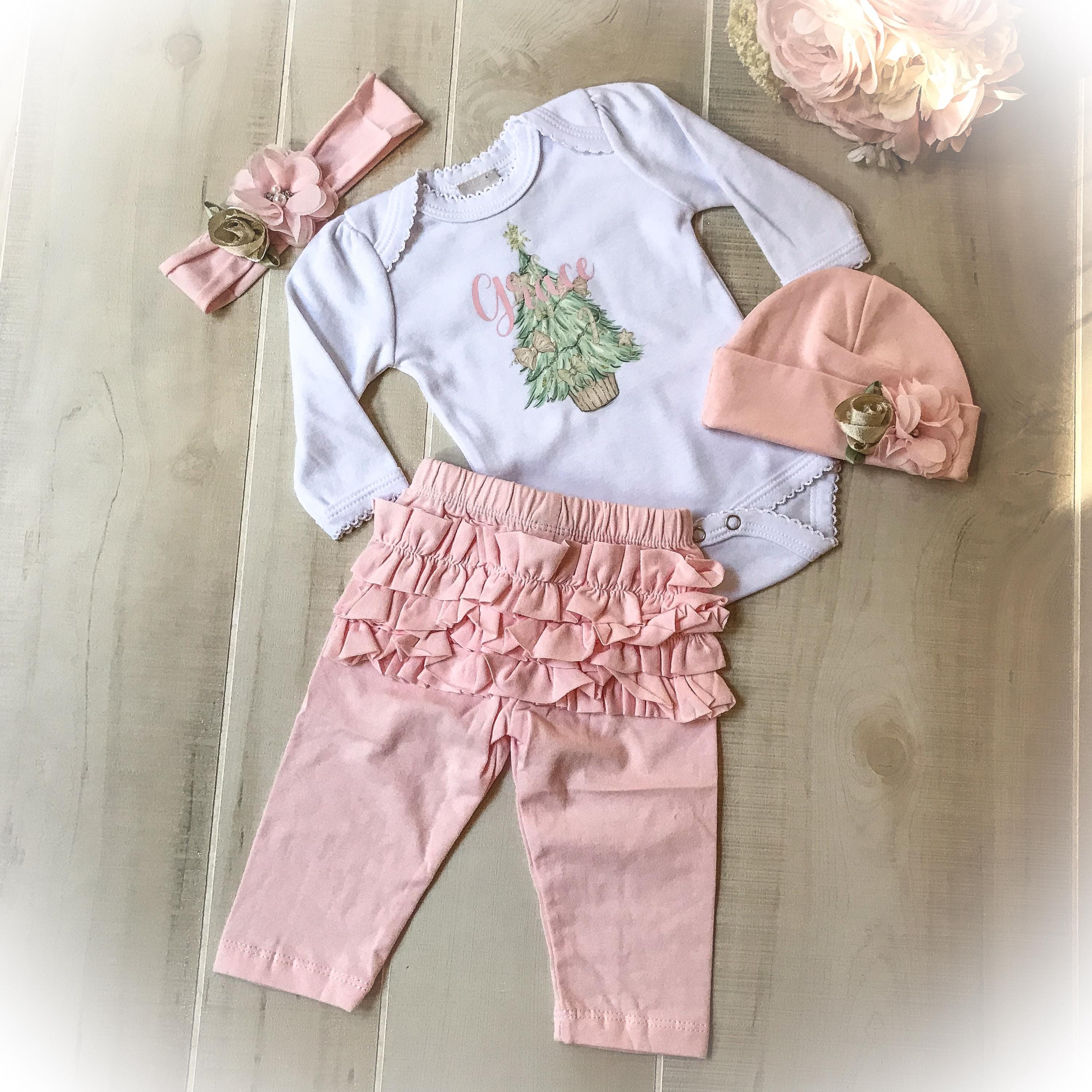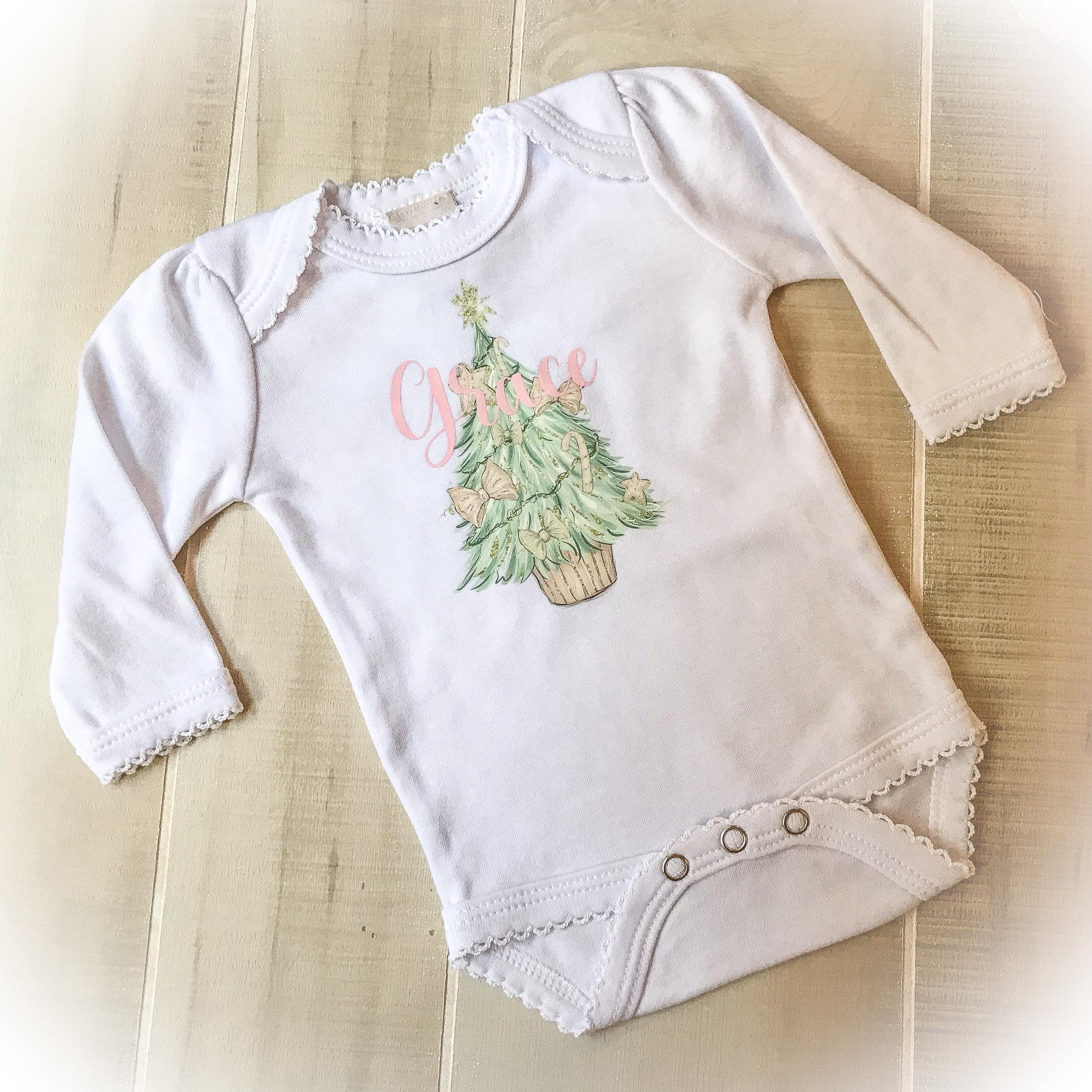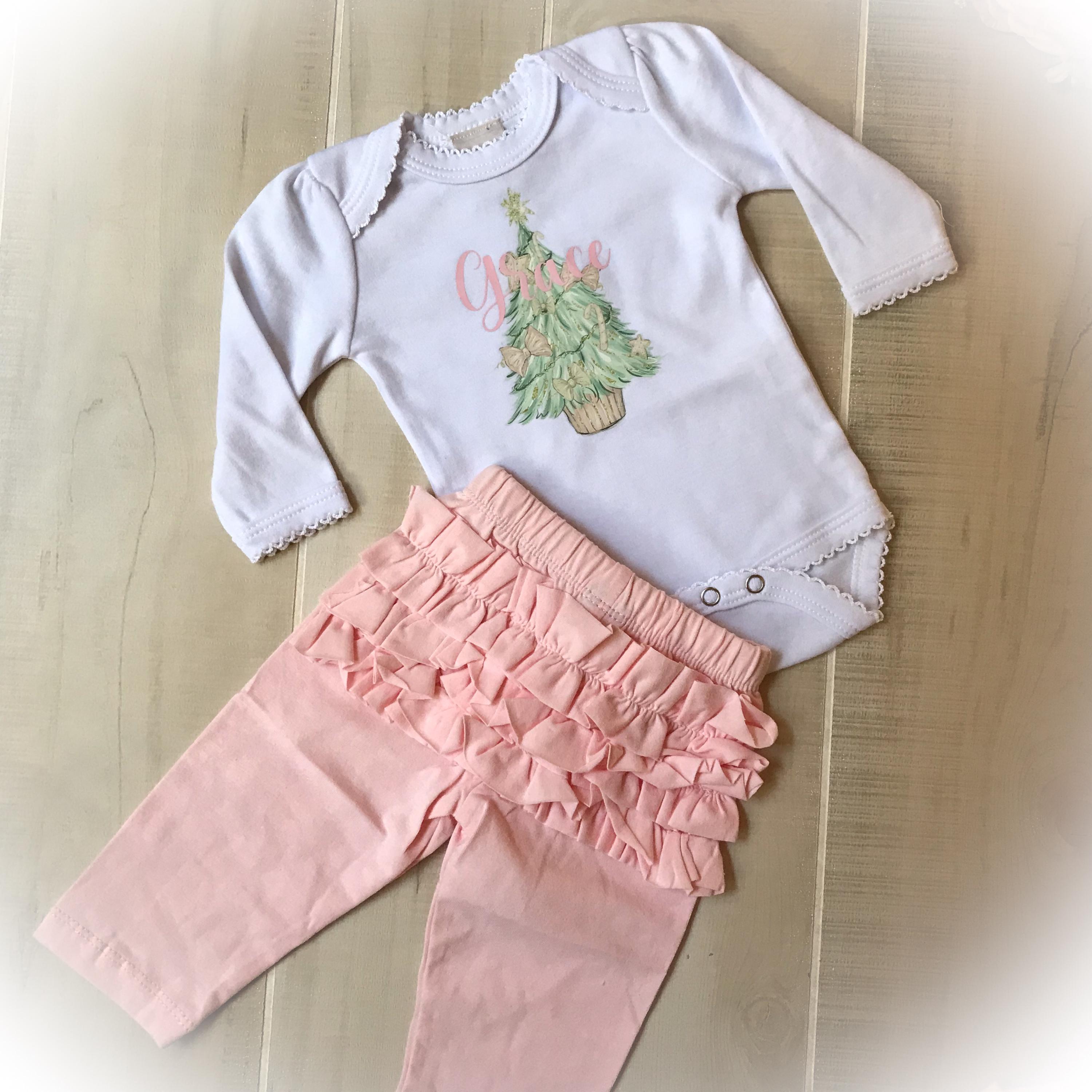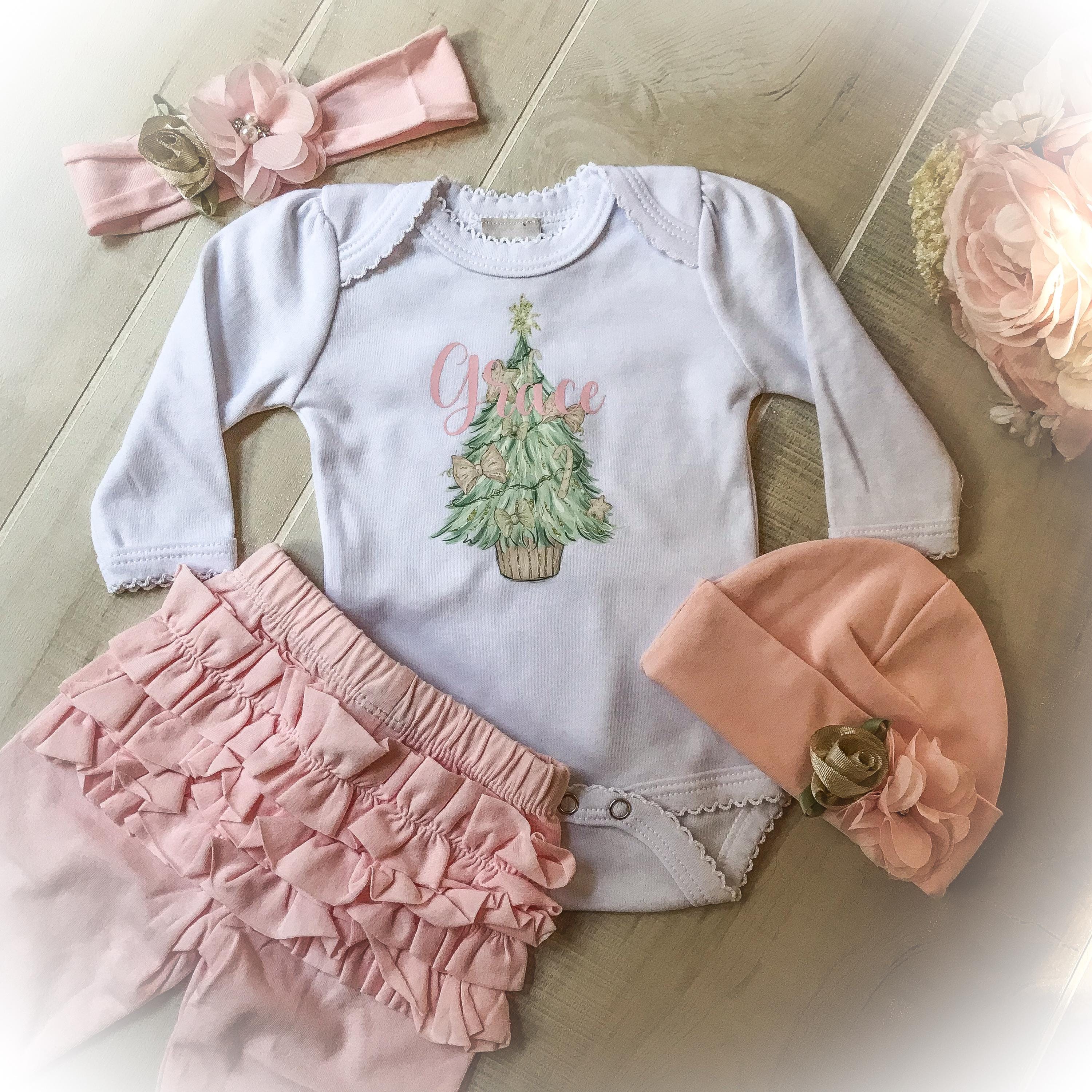 The personalized pink Christmas outfit is perfect for your baby’s first holiday. You may choose which items you would like to complete the set. Limited availability