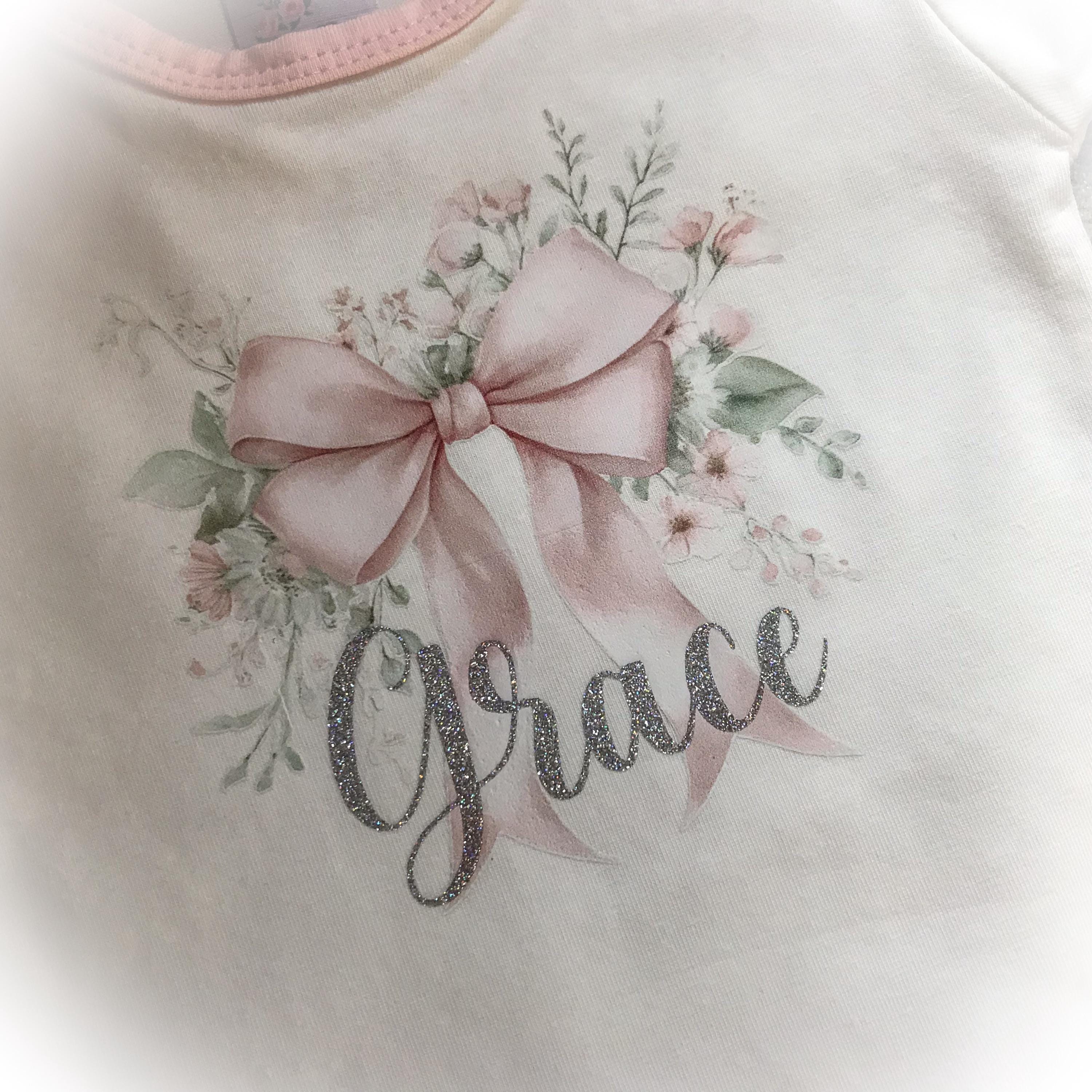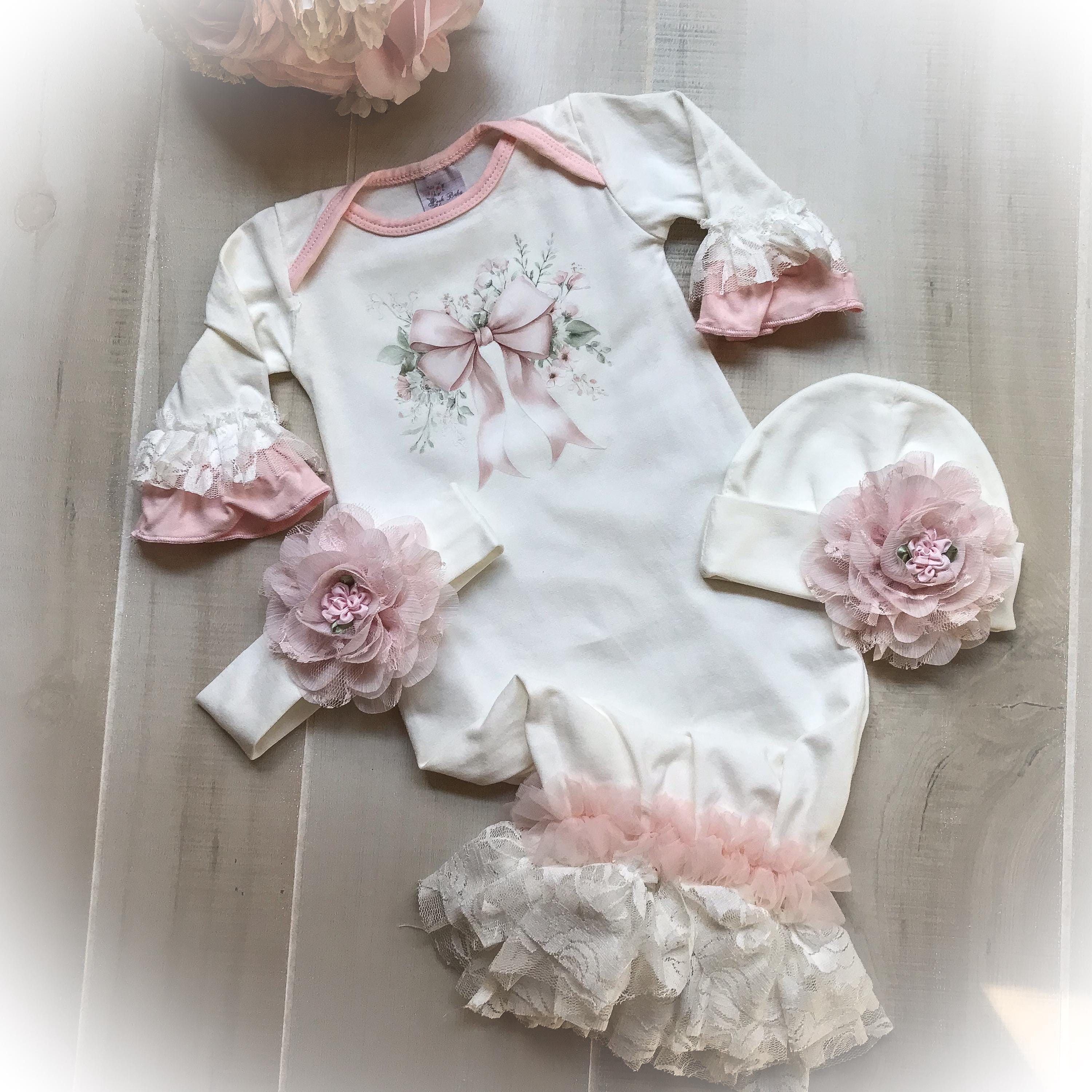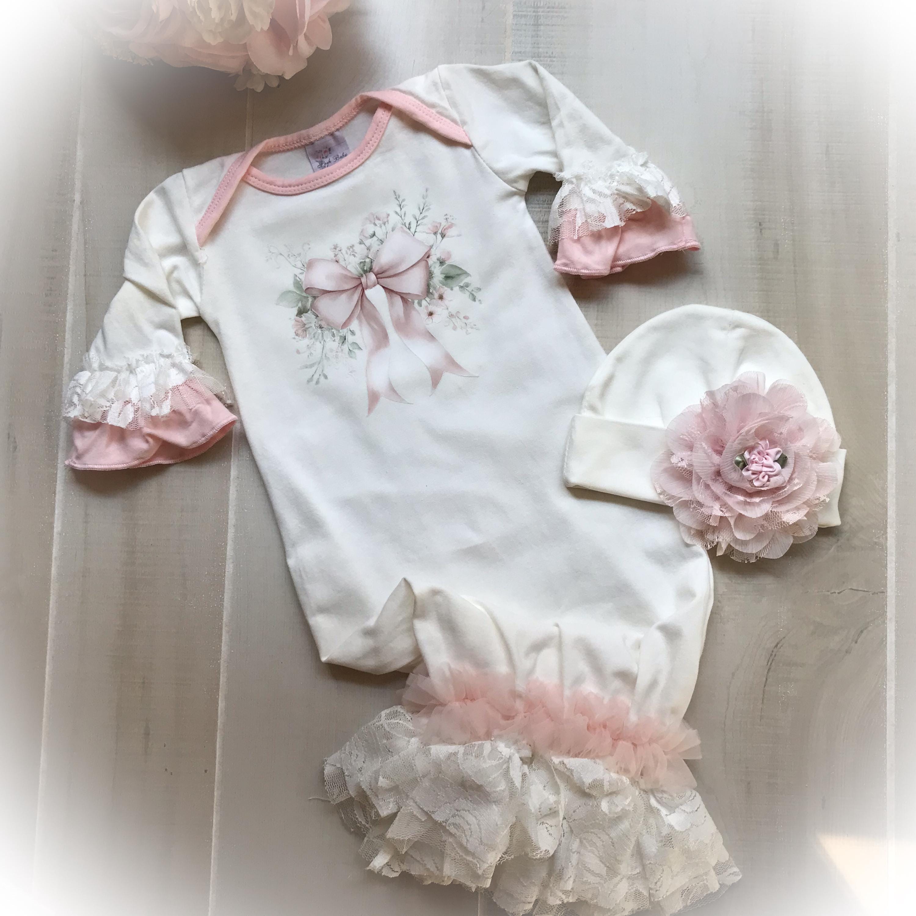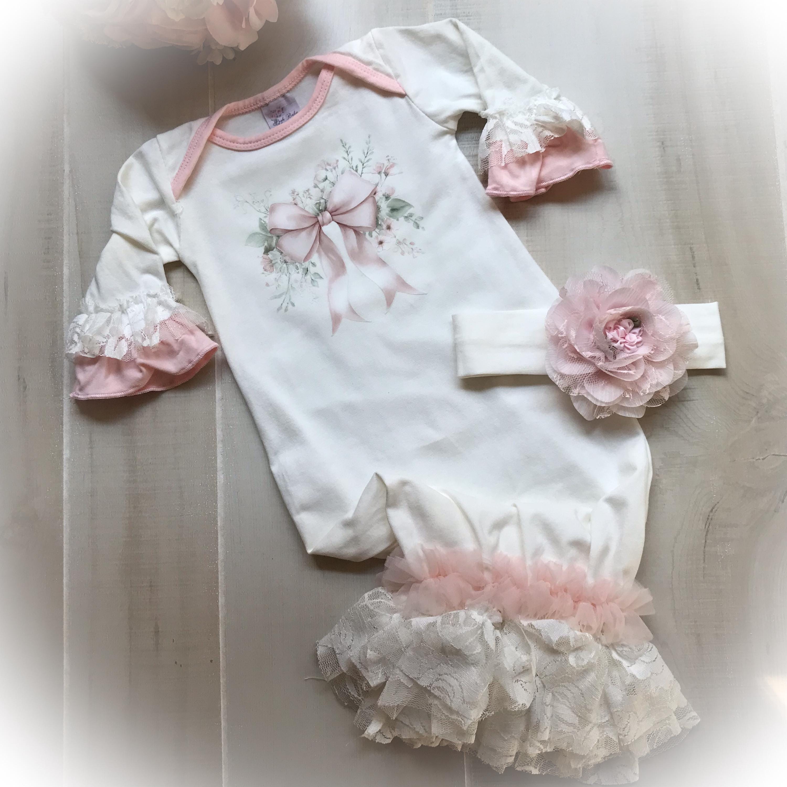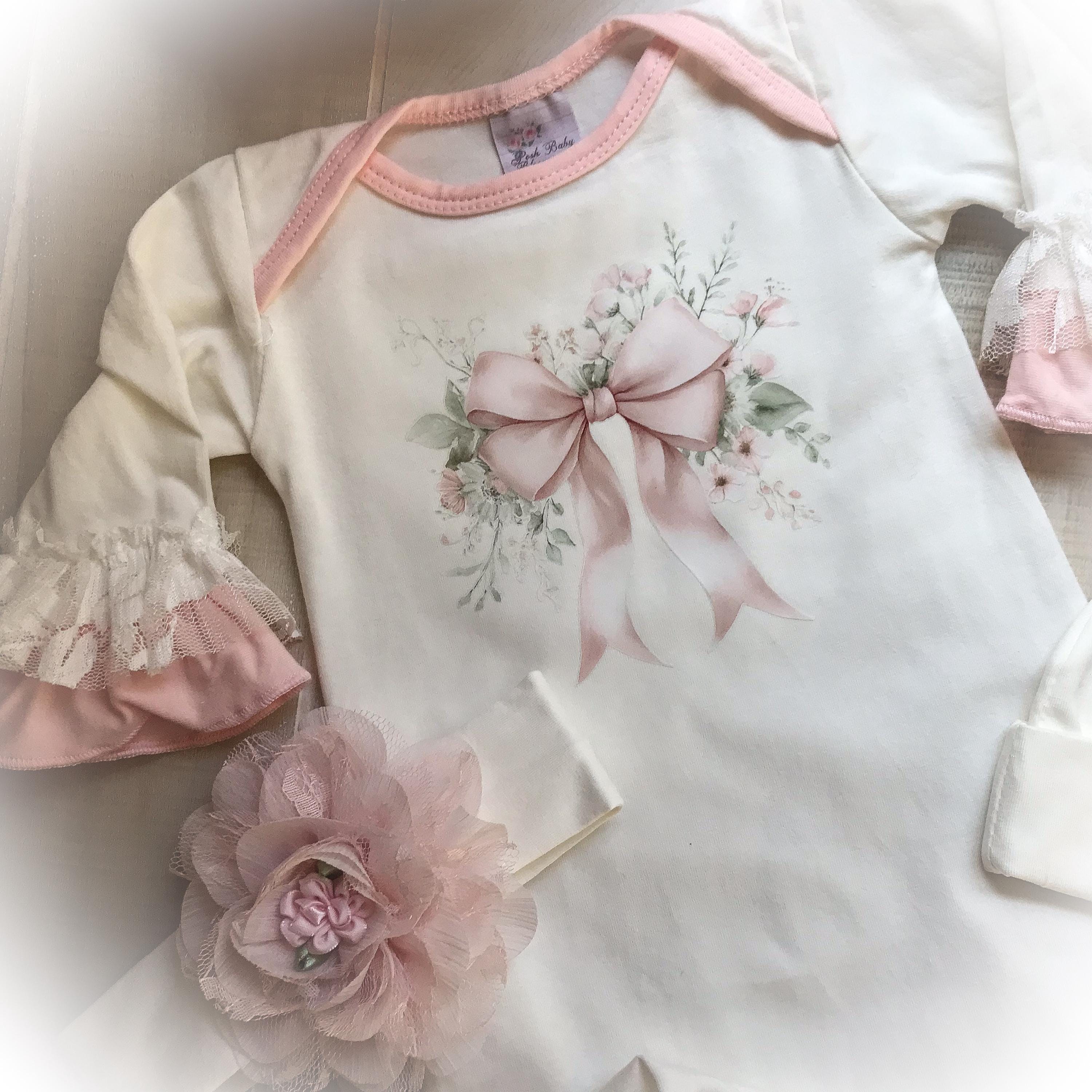 Personalized ivory and pink coming home gown. The stunning ivory gown features soft lace and chiffon trimmed bottom and Ruffle sleeves. A beautiful pink bow hi lights your baby’s name done in a shimmery silver HTV font. The name is optional if you prefer the bow design only.