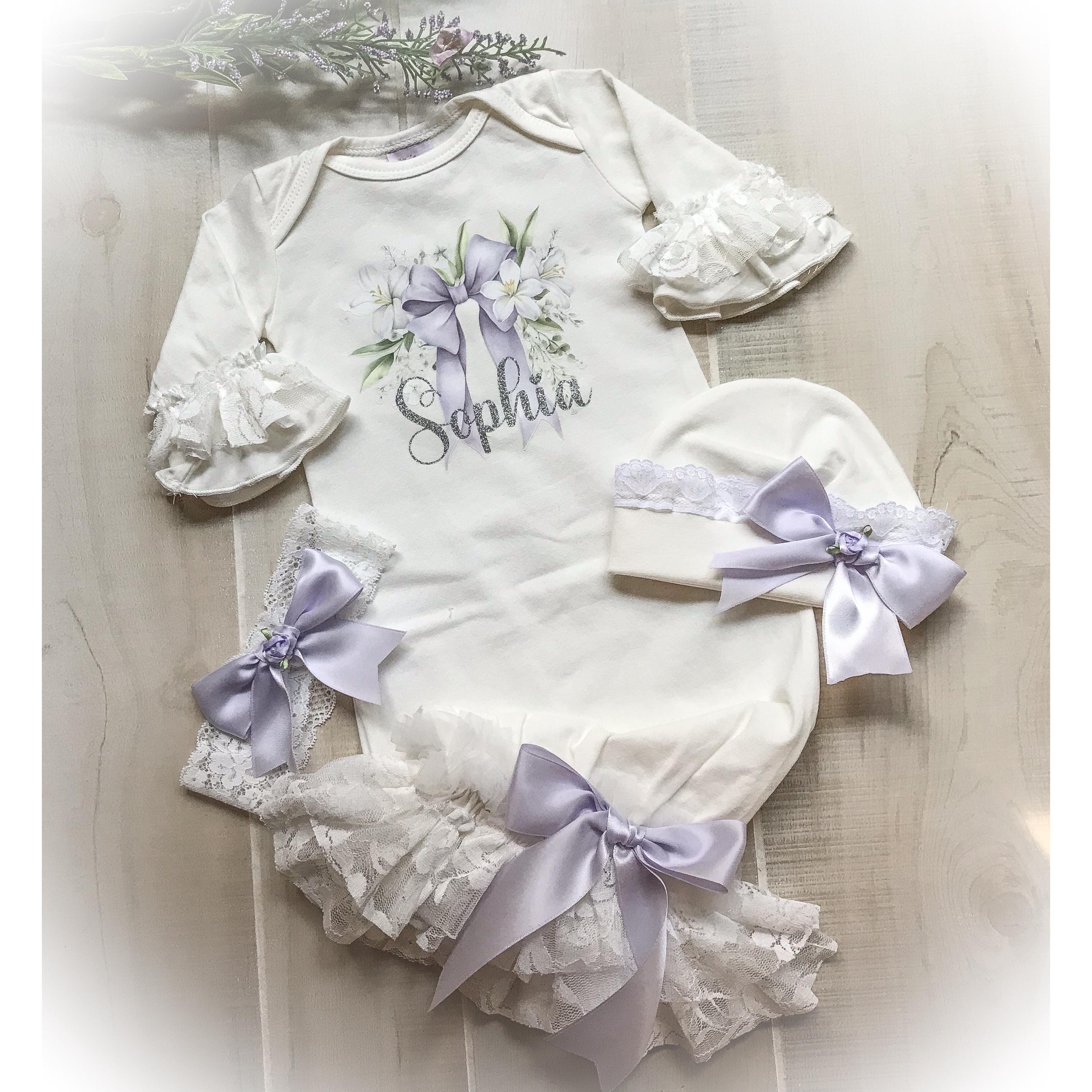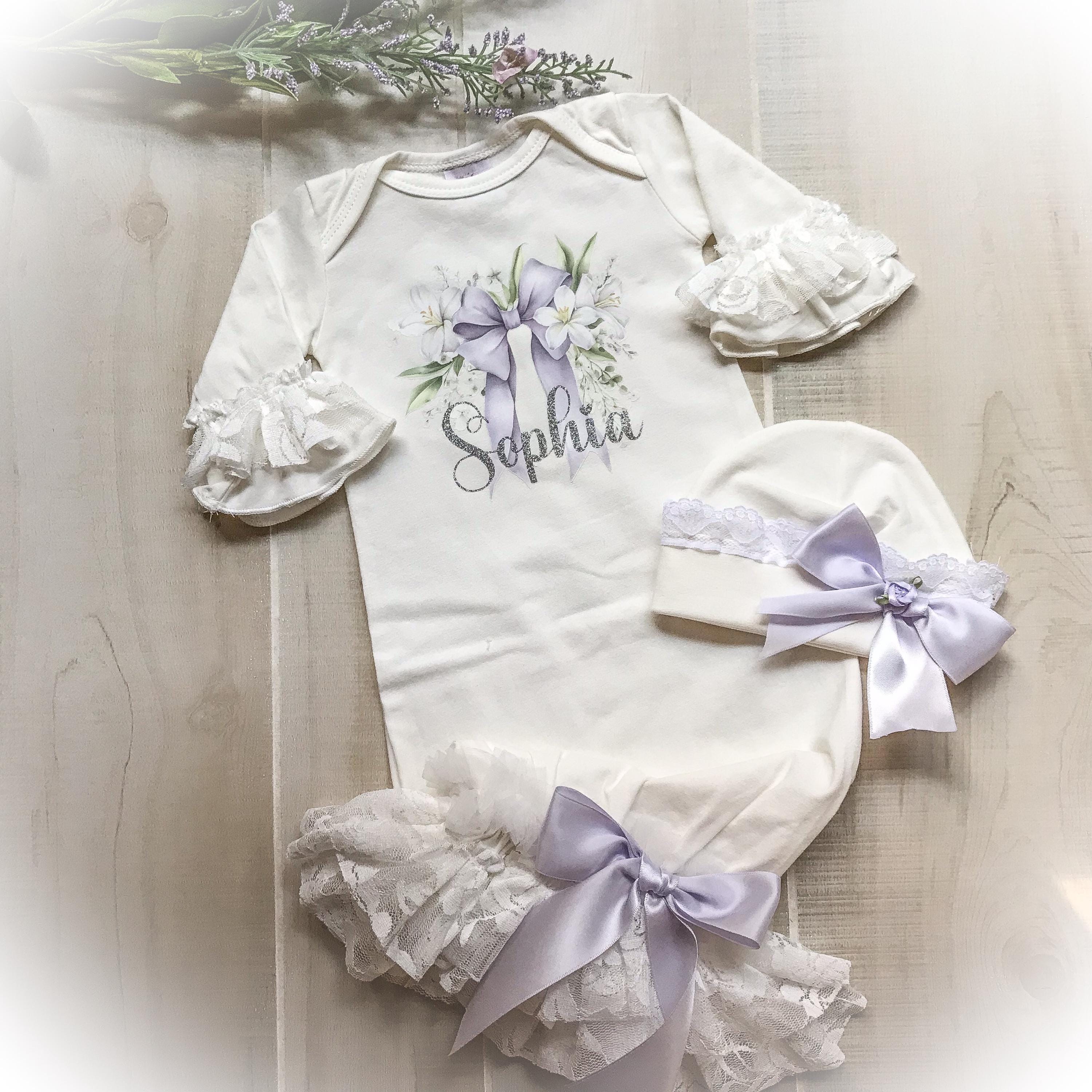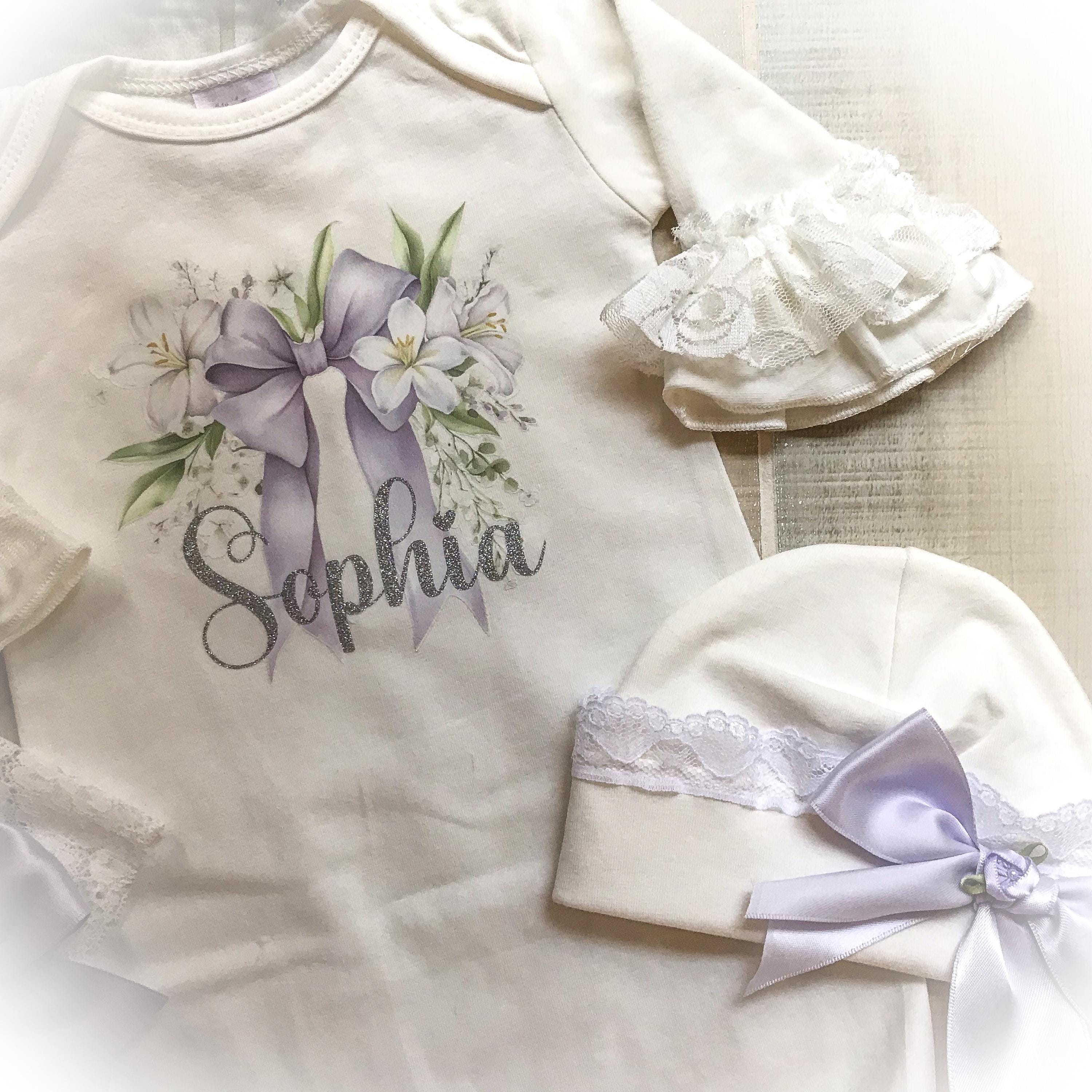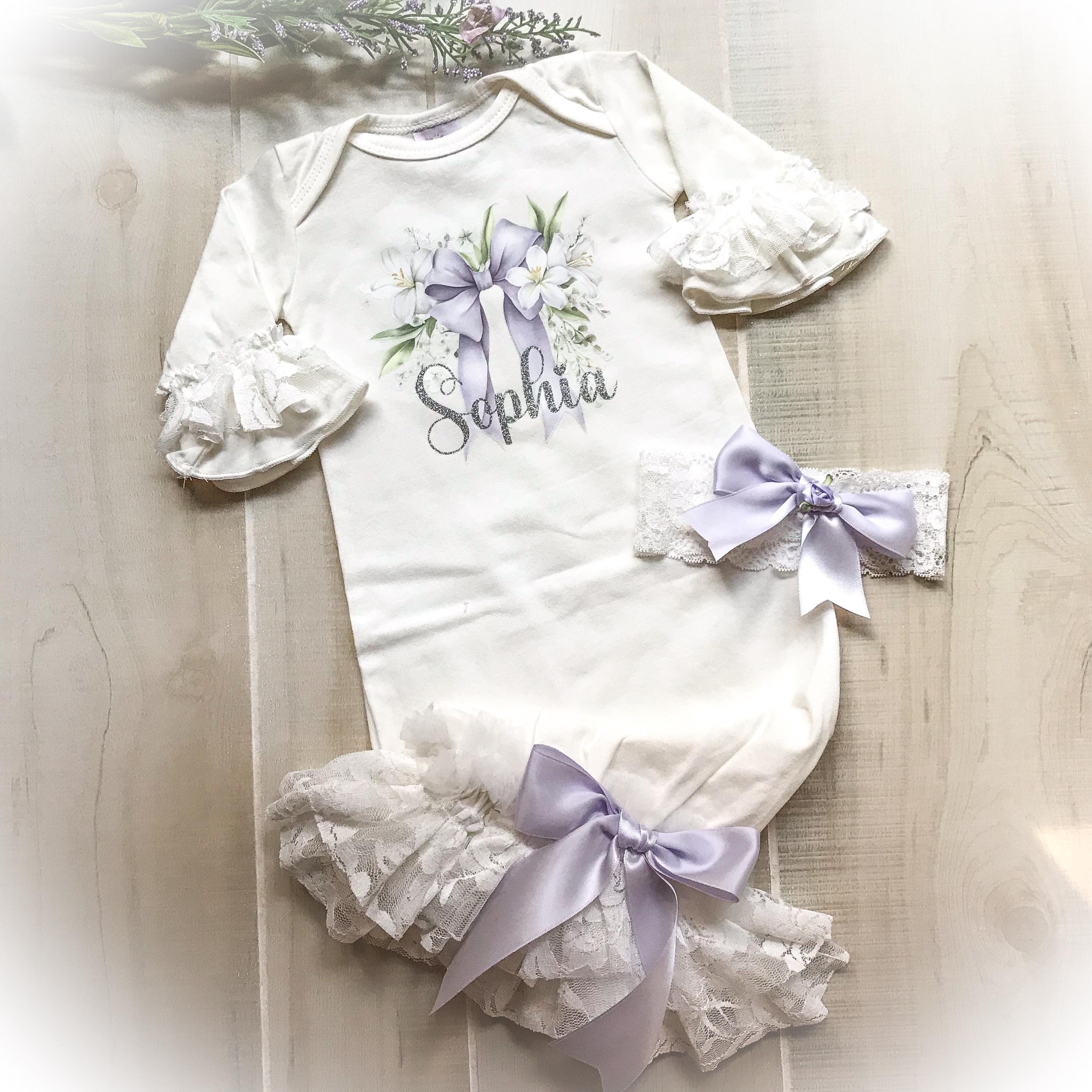 Personalized Lavender coming home gown. The stunning ivory gown features soft lace and chiffon trimmed bottom and Ruffle sleeves. A beautiful lavender bow hi lights your baby’s name done in a shimmery silver HTV font. The name is optional if you prefer the bow design only.