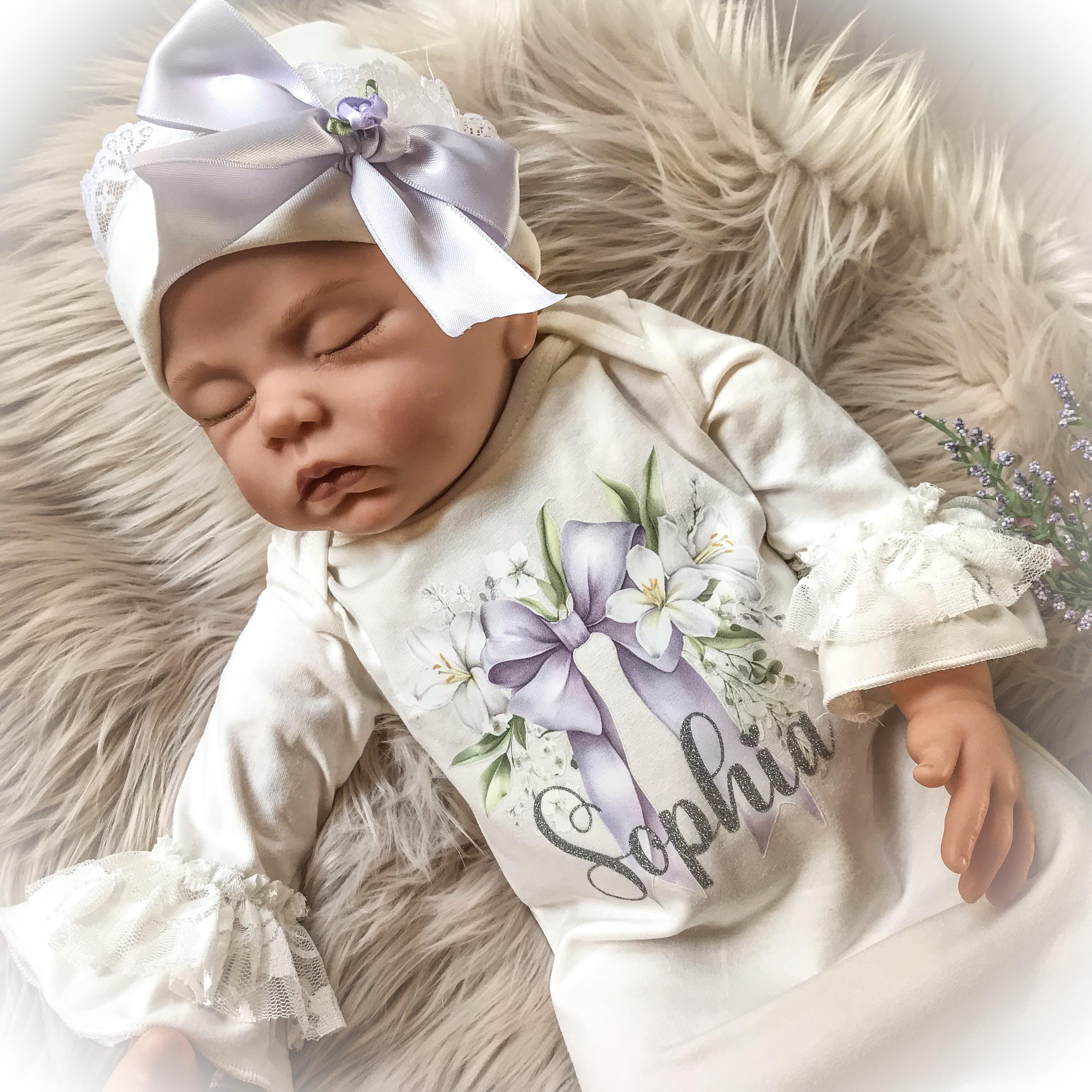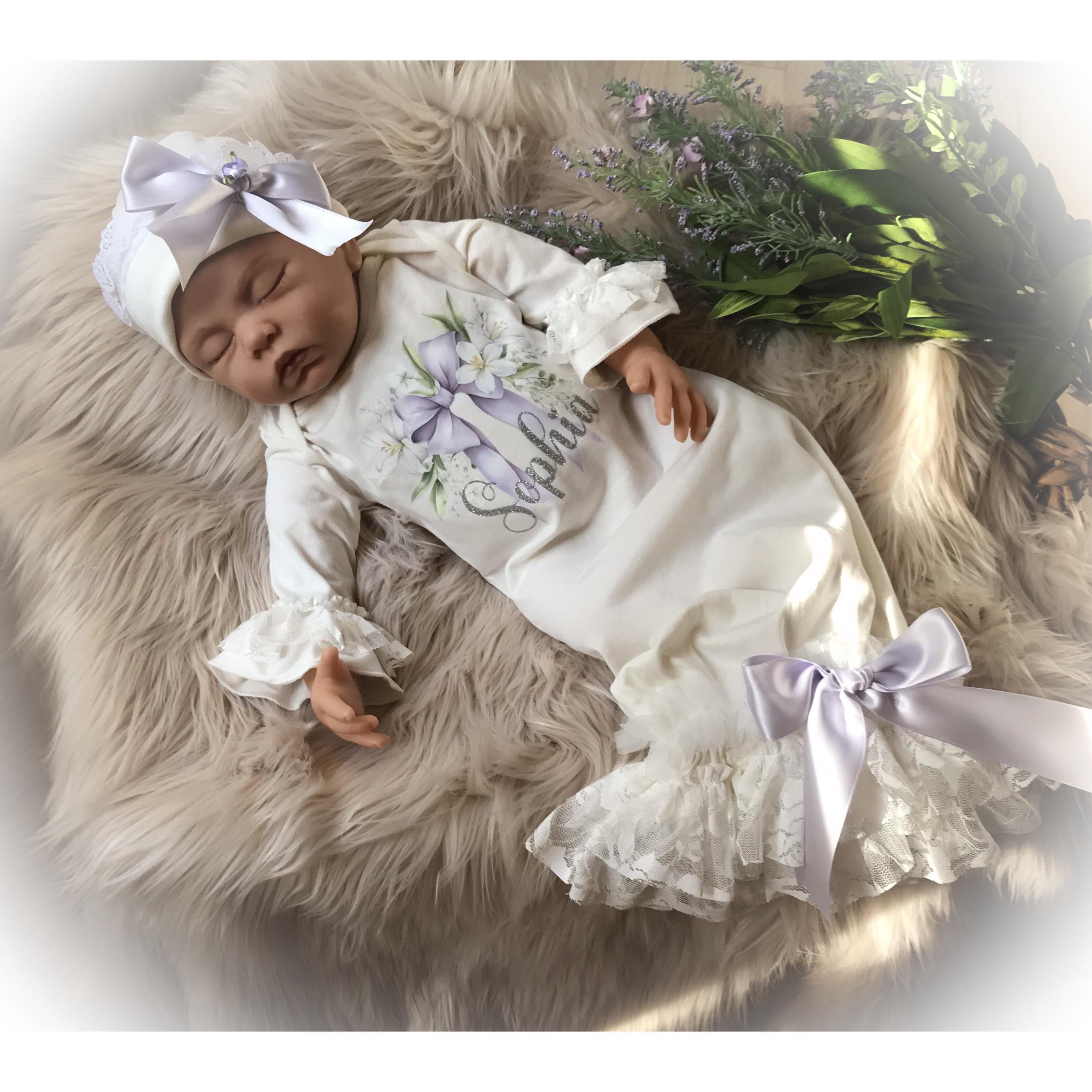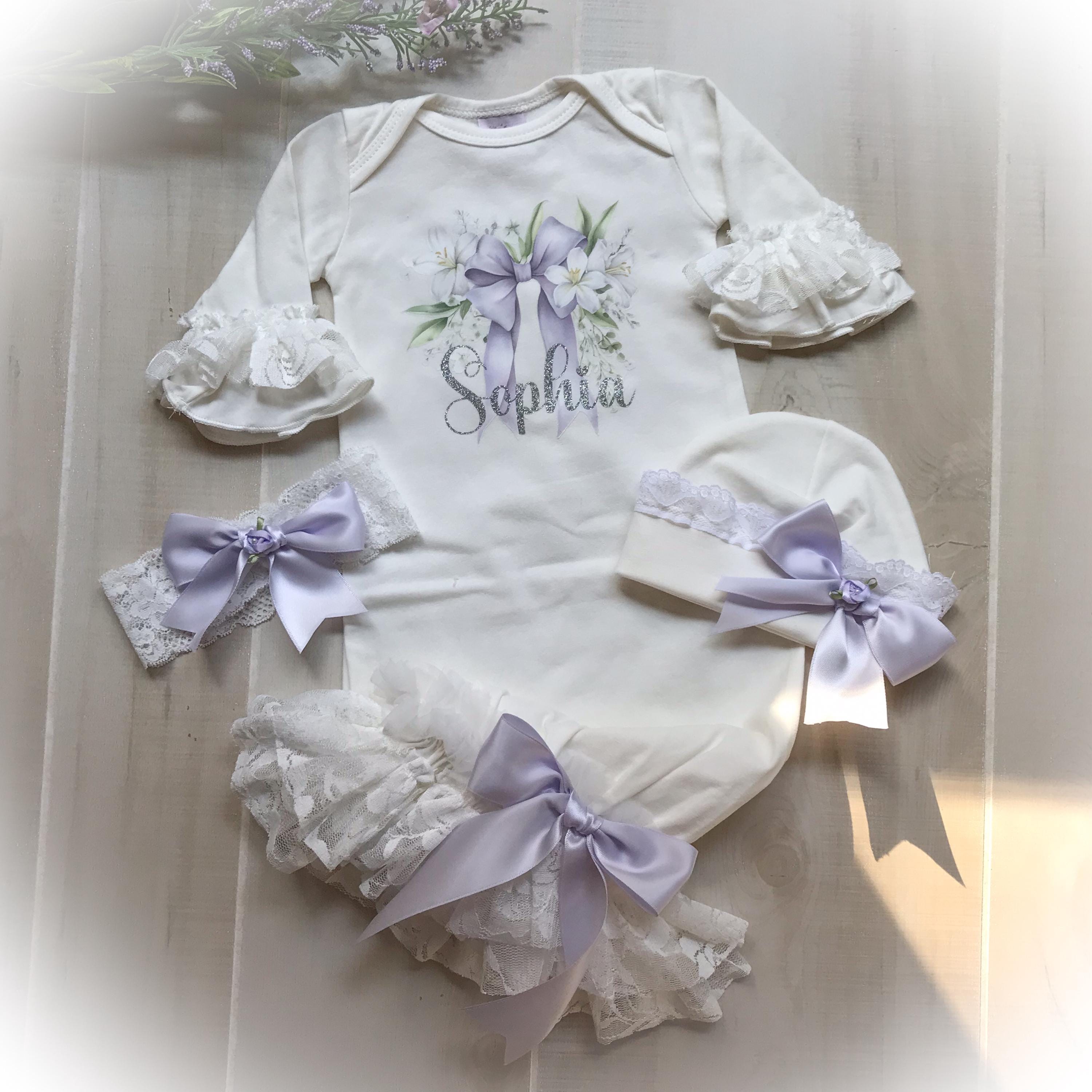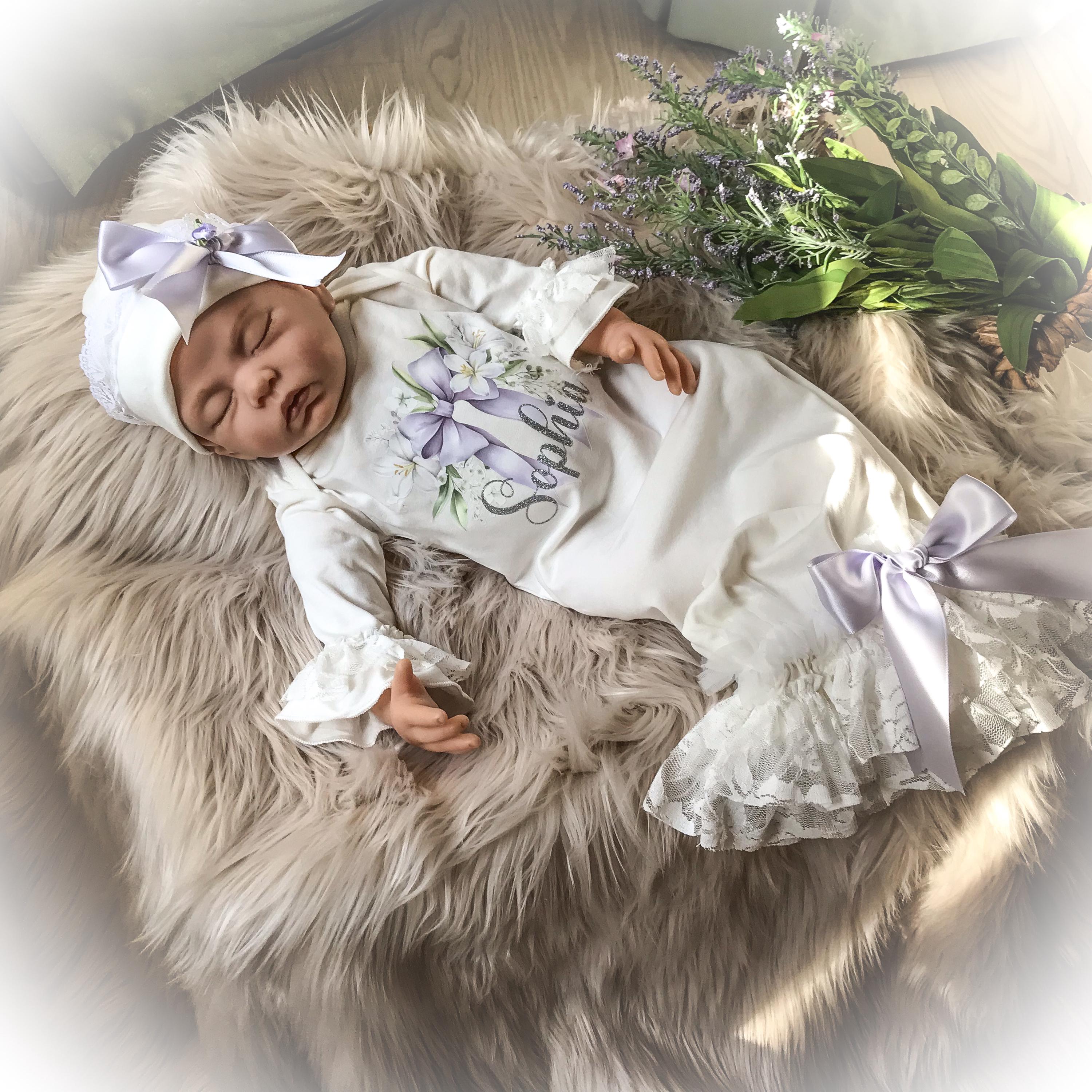 Personalized Lavender coming home gown. The stunning ivory gown features soft lace and chiffon trimmed bottom and Ruffle sleeves. A beautiful lavender bow hi lights your baby’s name done in a shimmery silver HTV font. The name is optional if you prefer the bow design only.