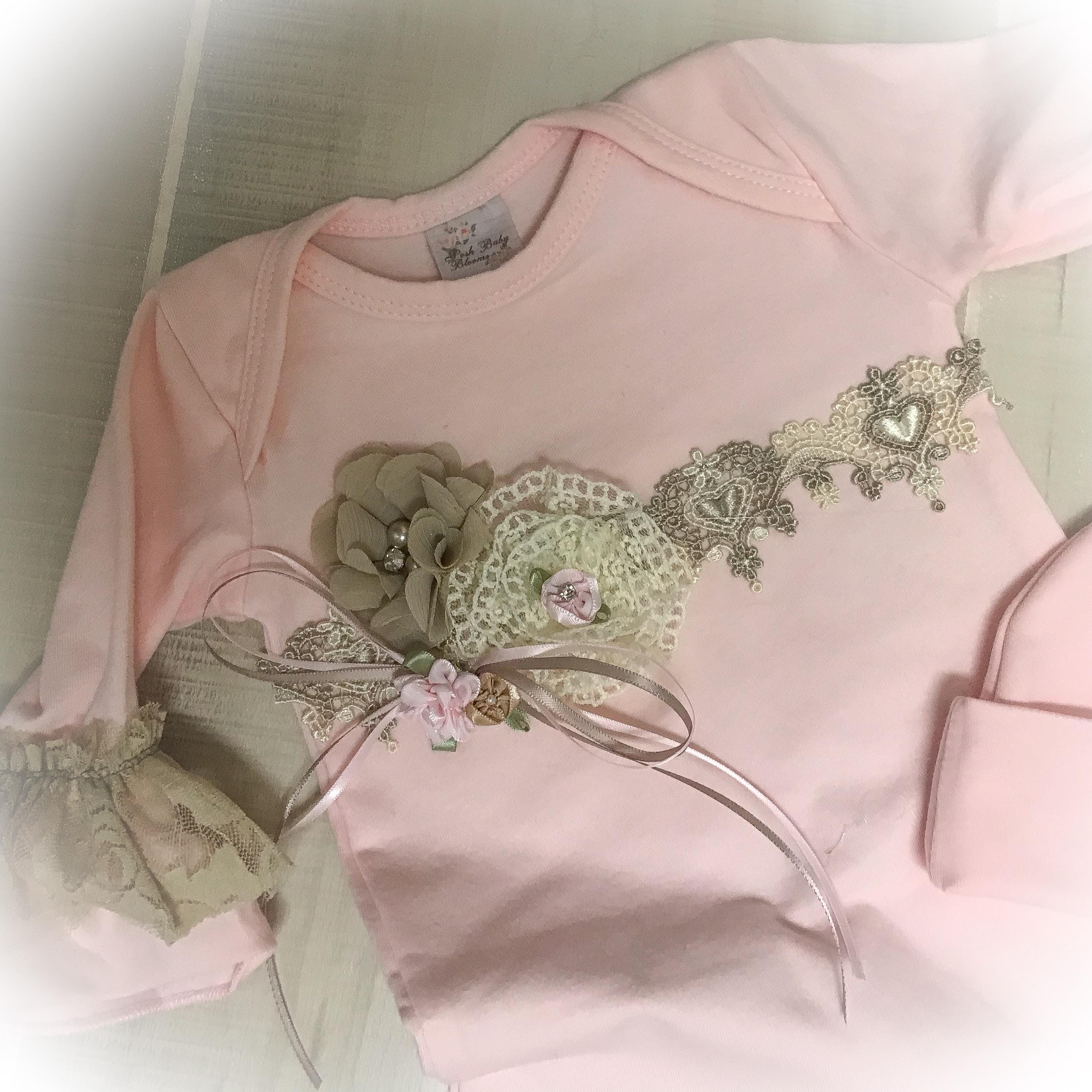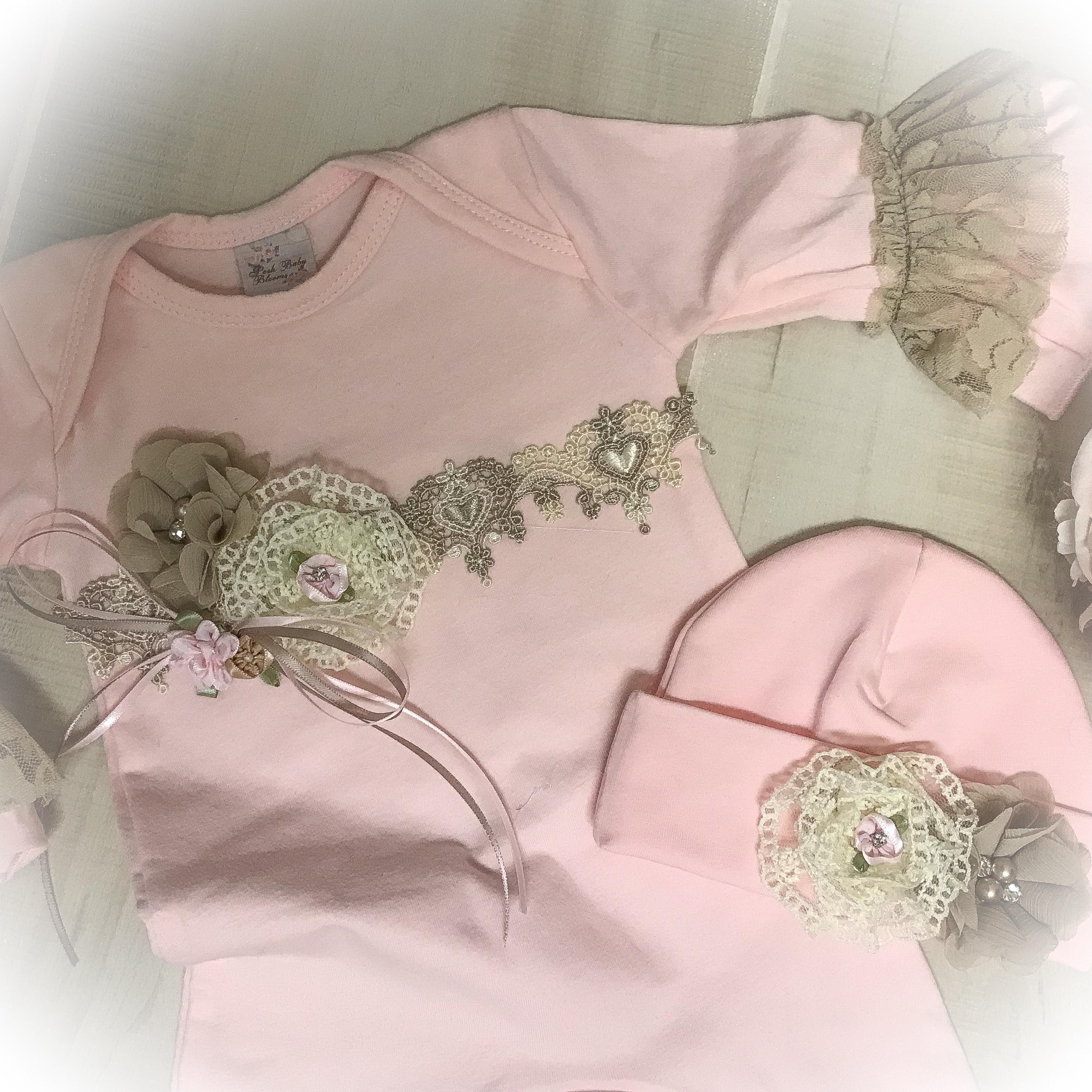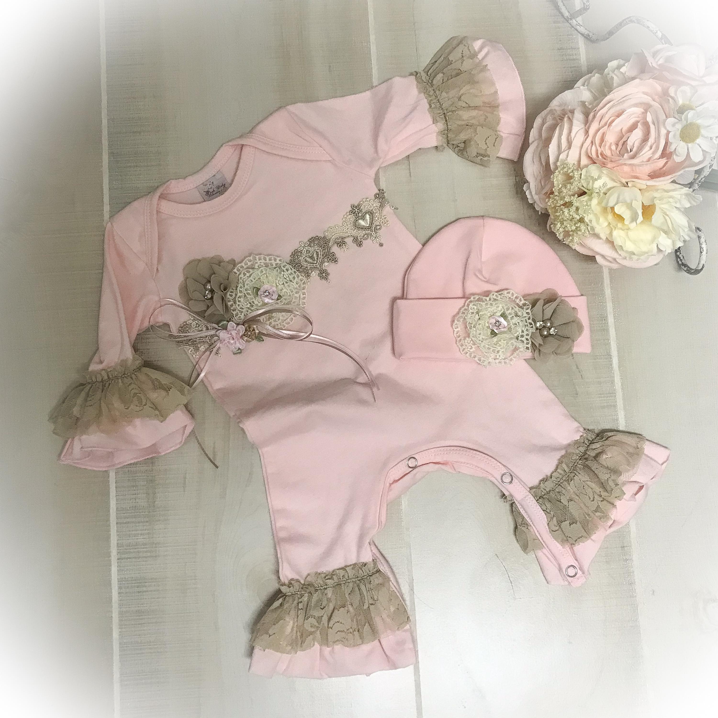 Welcome your little one home in this adorable lace ruffle romper. The soft pink romper features beautiful beige lace on the legs and sleeves. The yoke is adorned with a lovely heart venice trim and accented with chiffon and lace flowers. Perfect for bringing home baby or those precious first photos.