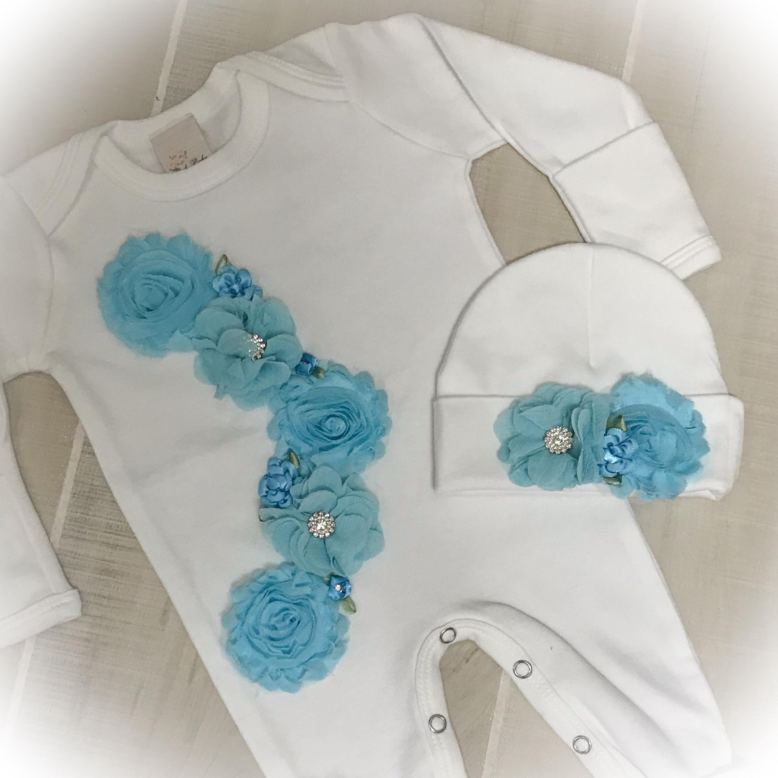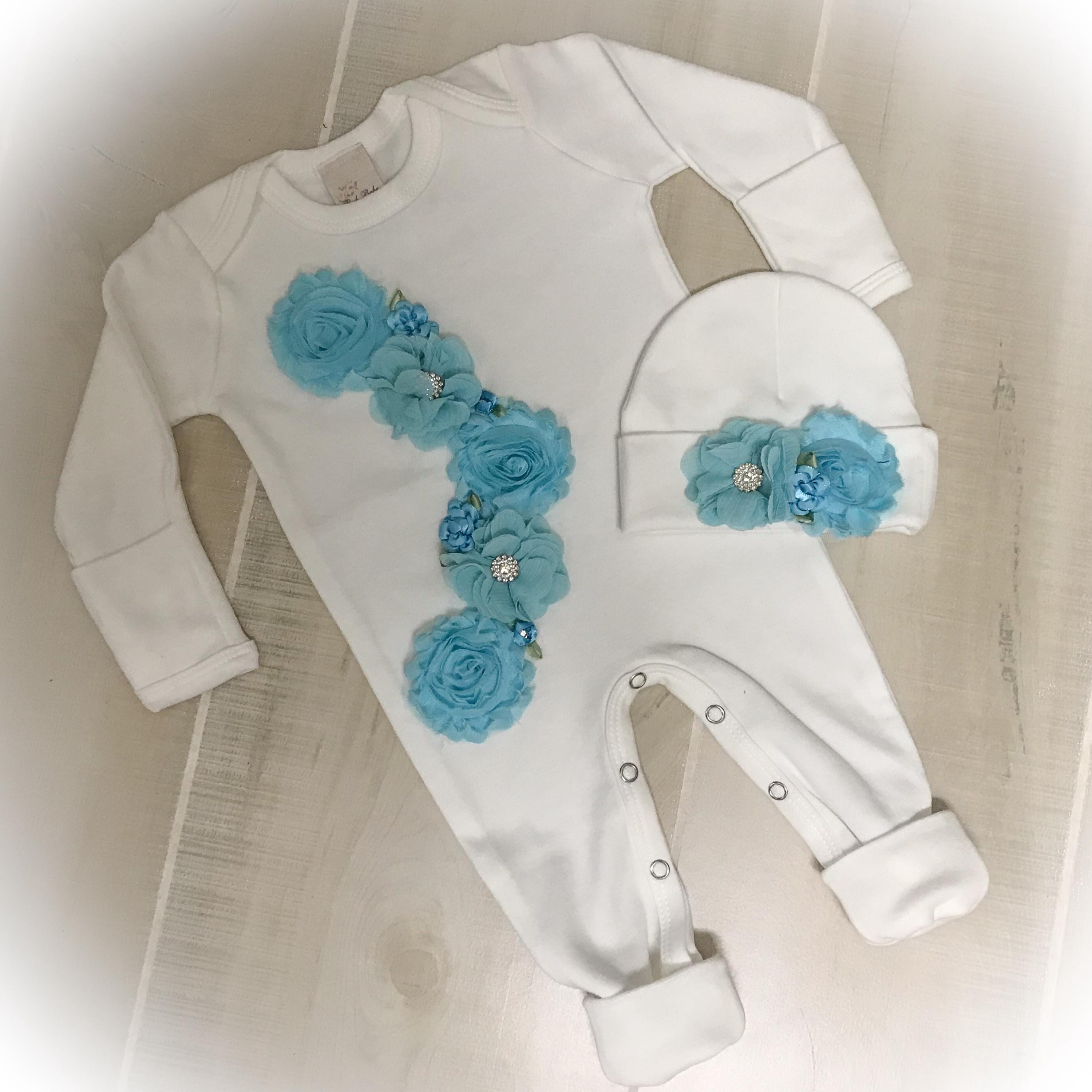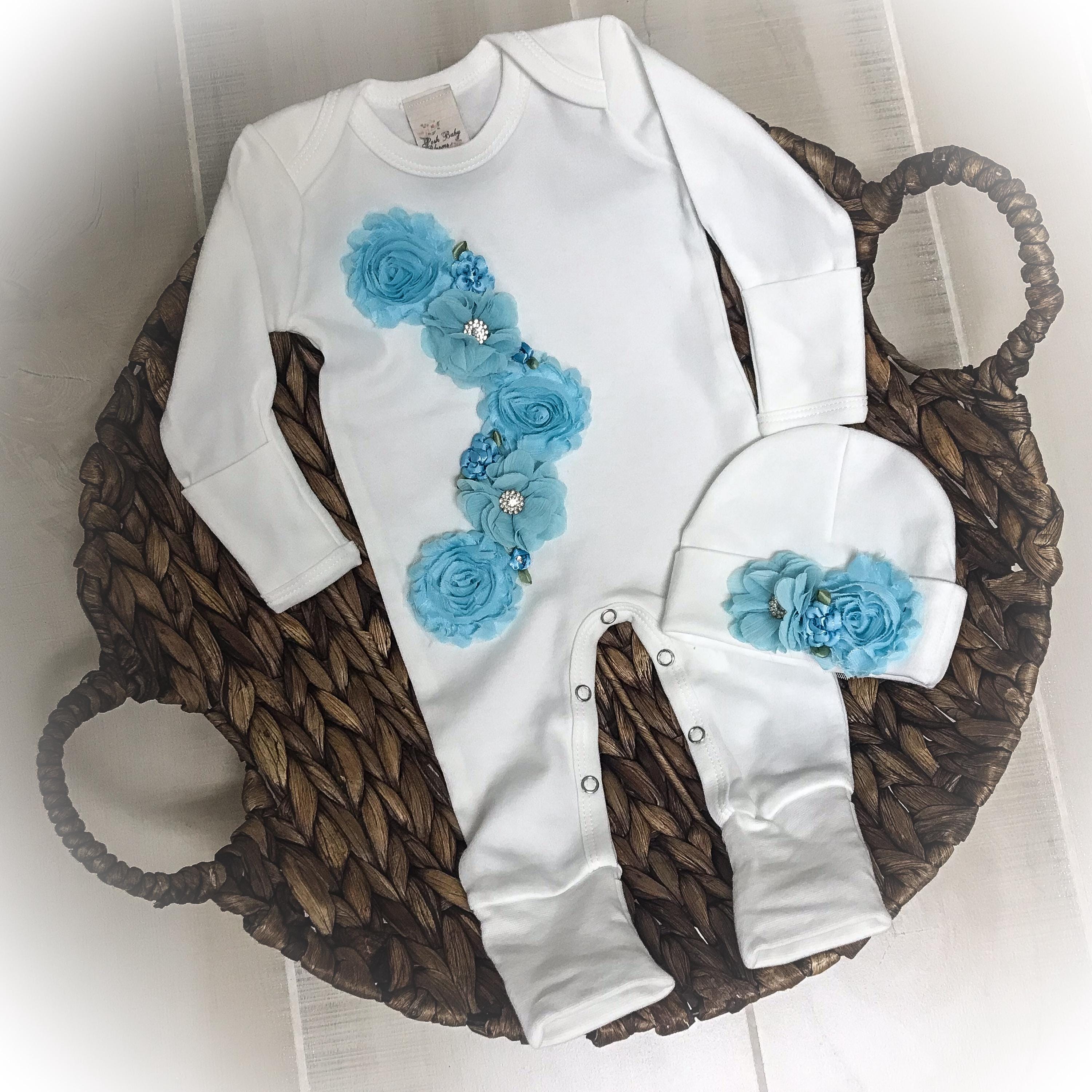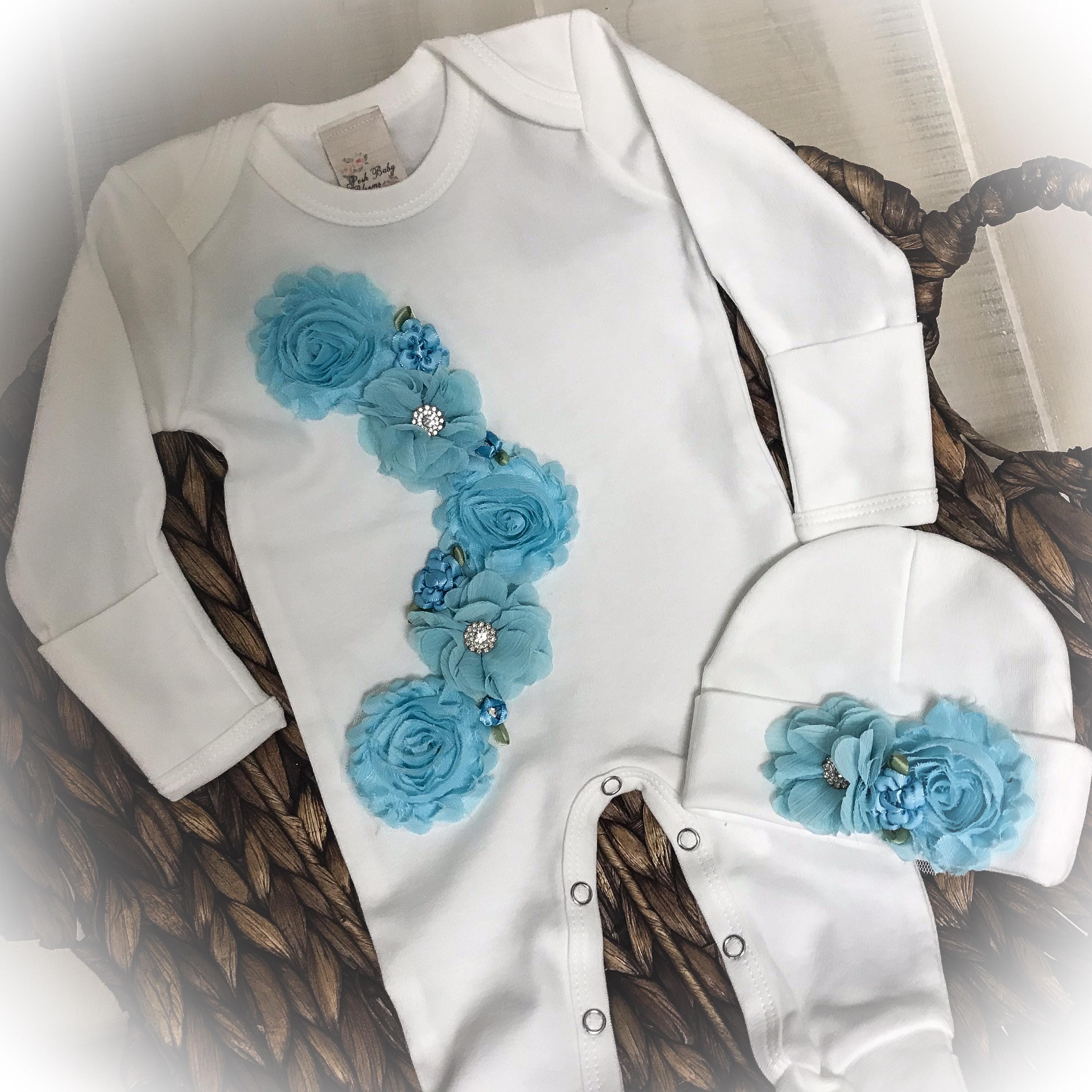 This adorable coming home romper features fold up feet and mittens offering lots of options in style. Legs and sleeves may be turned back to cover your little ones hands and feet to keep warm or prevent scratches. Beautiful aqua shabby chiffon flowers and satin rosettes cascade down the front creating that special look. Optional matching hat completes the outfit.