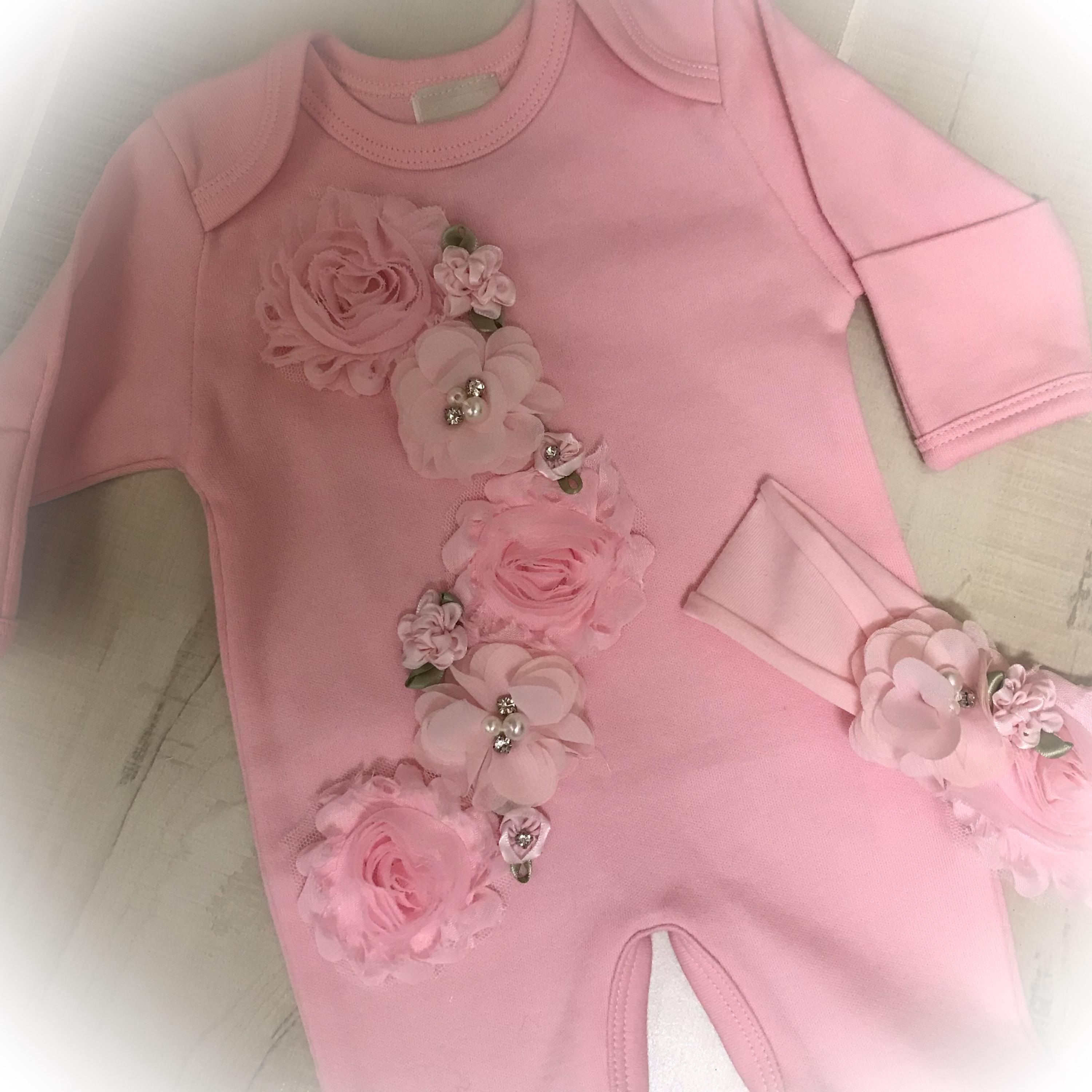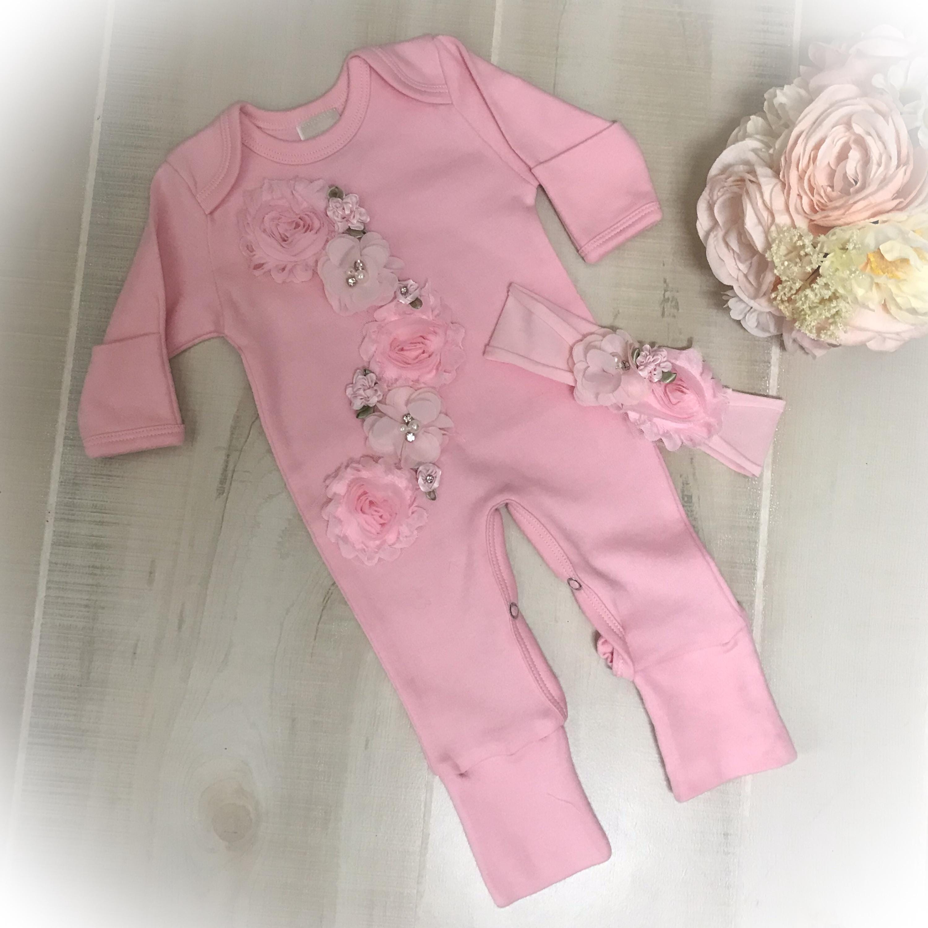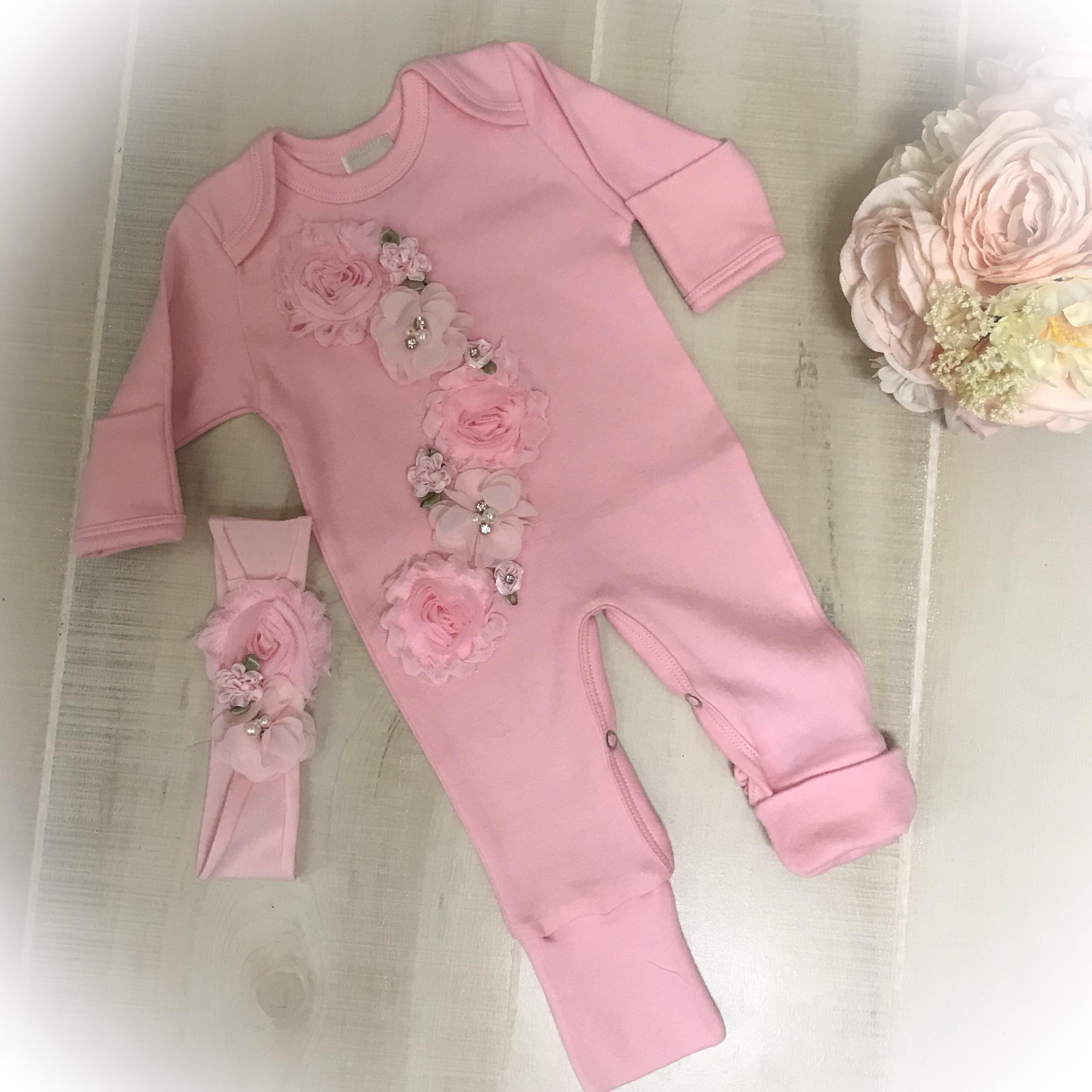 This adorable coming home romper features fold up feet and mittens offering lots of options in style. Legs and sleeves may be turned back to cover your little ones hands and feet to keep warm or prevent scratches. Beautiful pink shabby chiffon flowers and satin rosettes cascade down the front creating that special look. Optional matching hat completes the outfit.