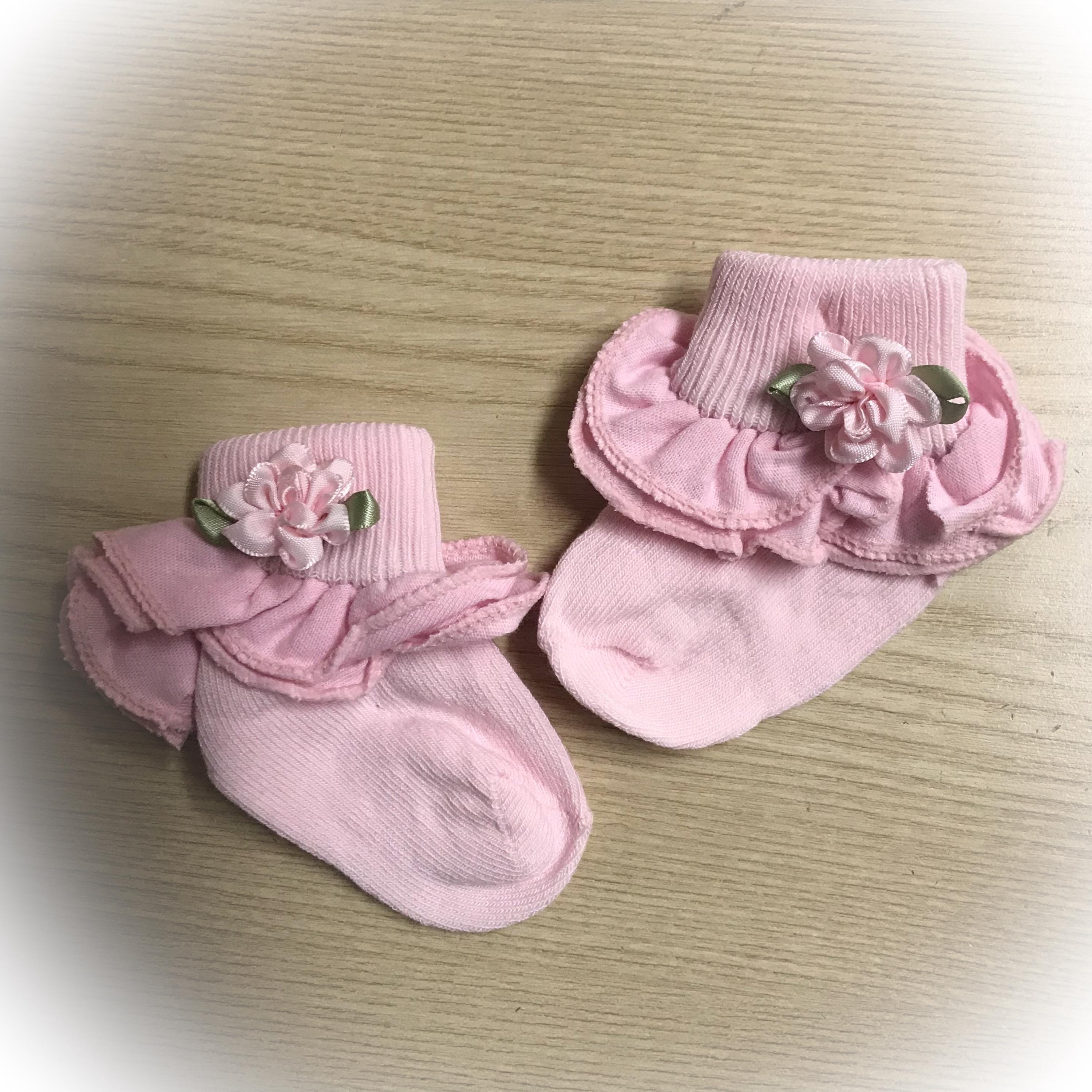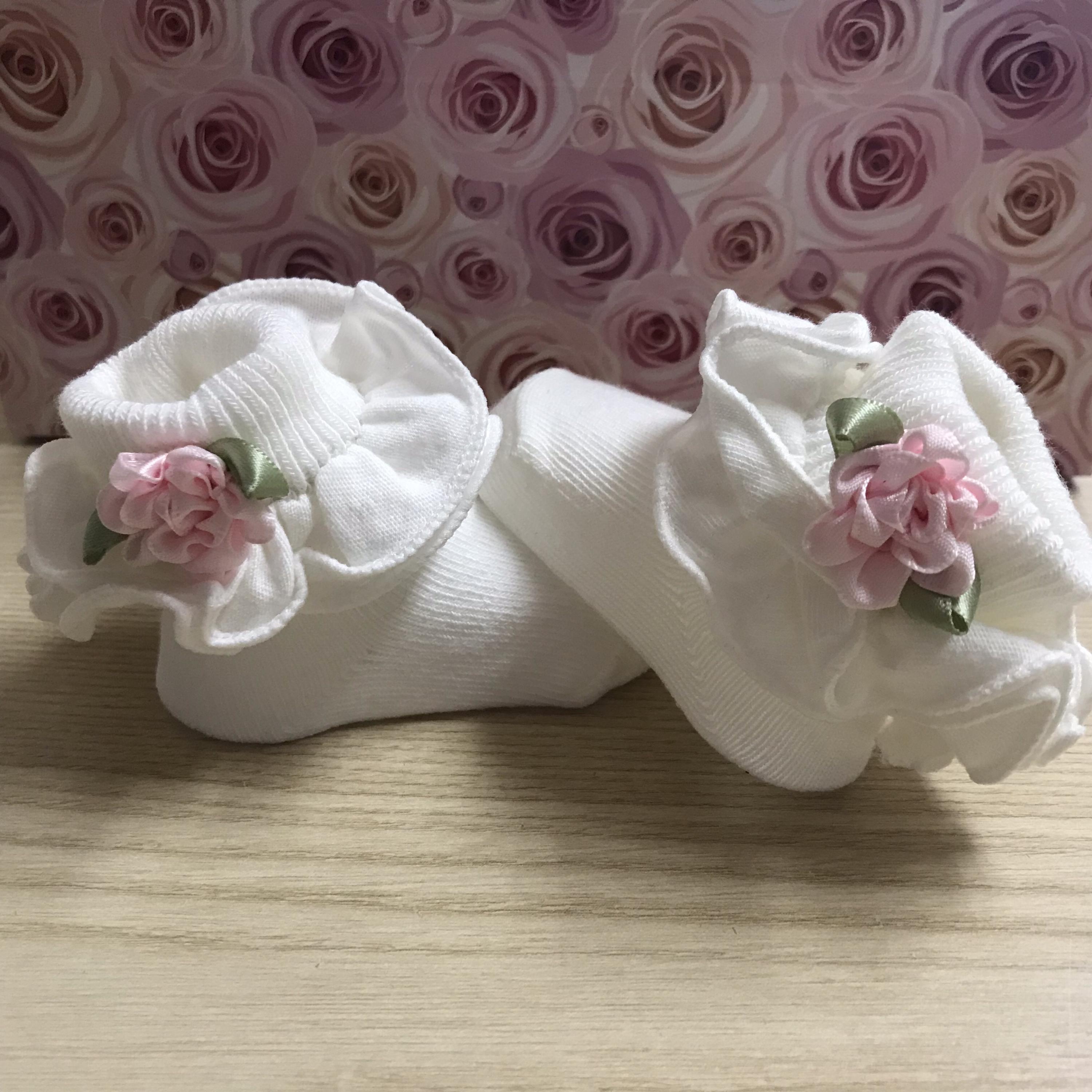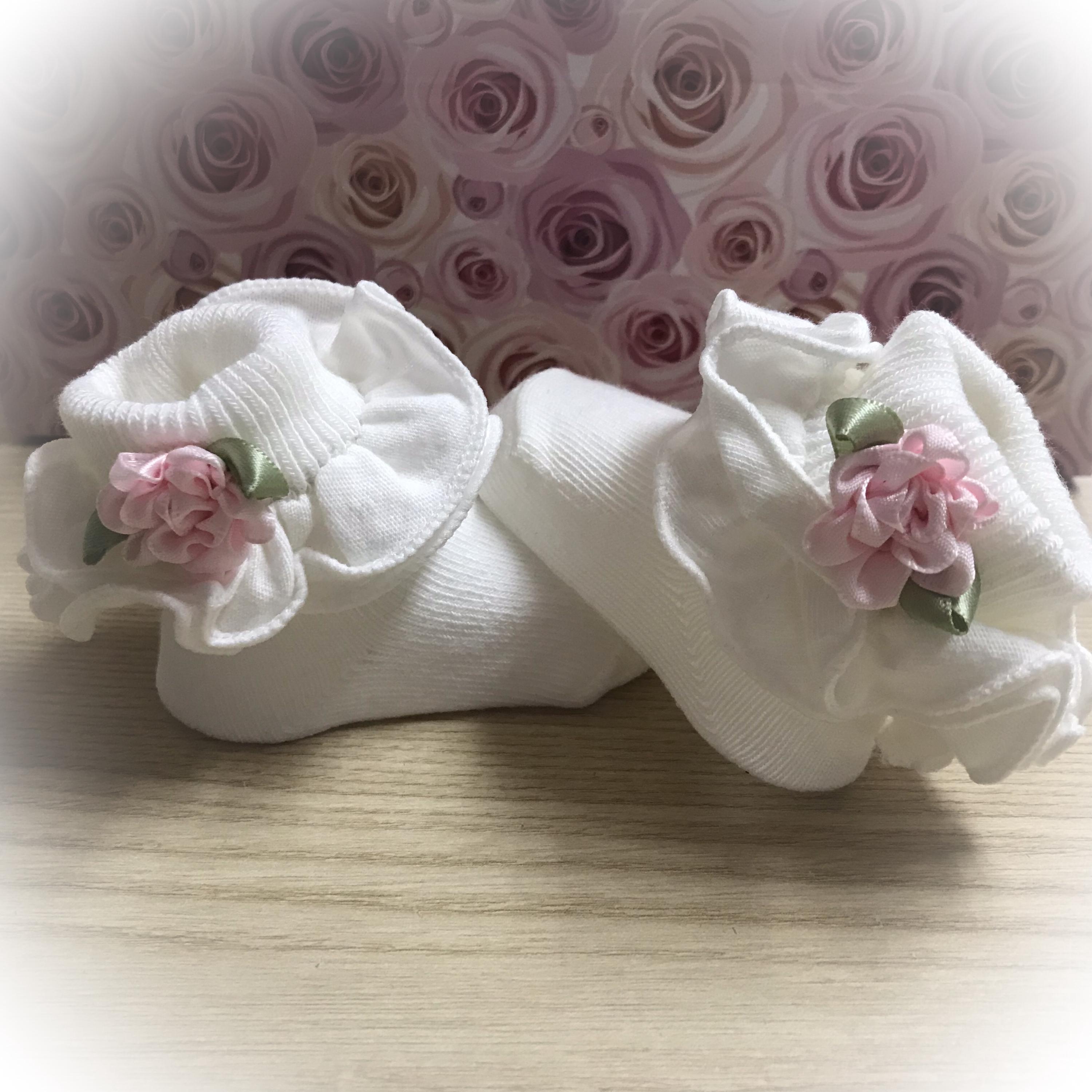 These sweet little baby bootie socks will keep those tootsies warm.