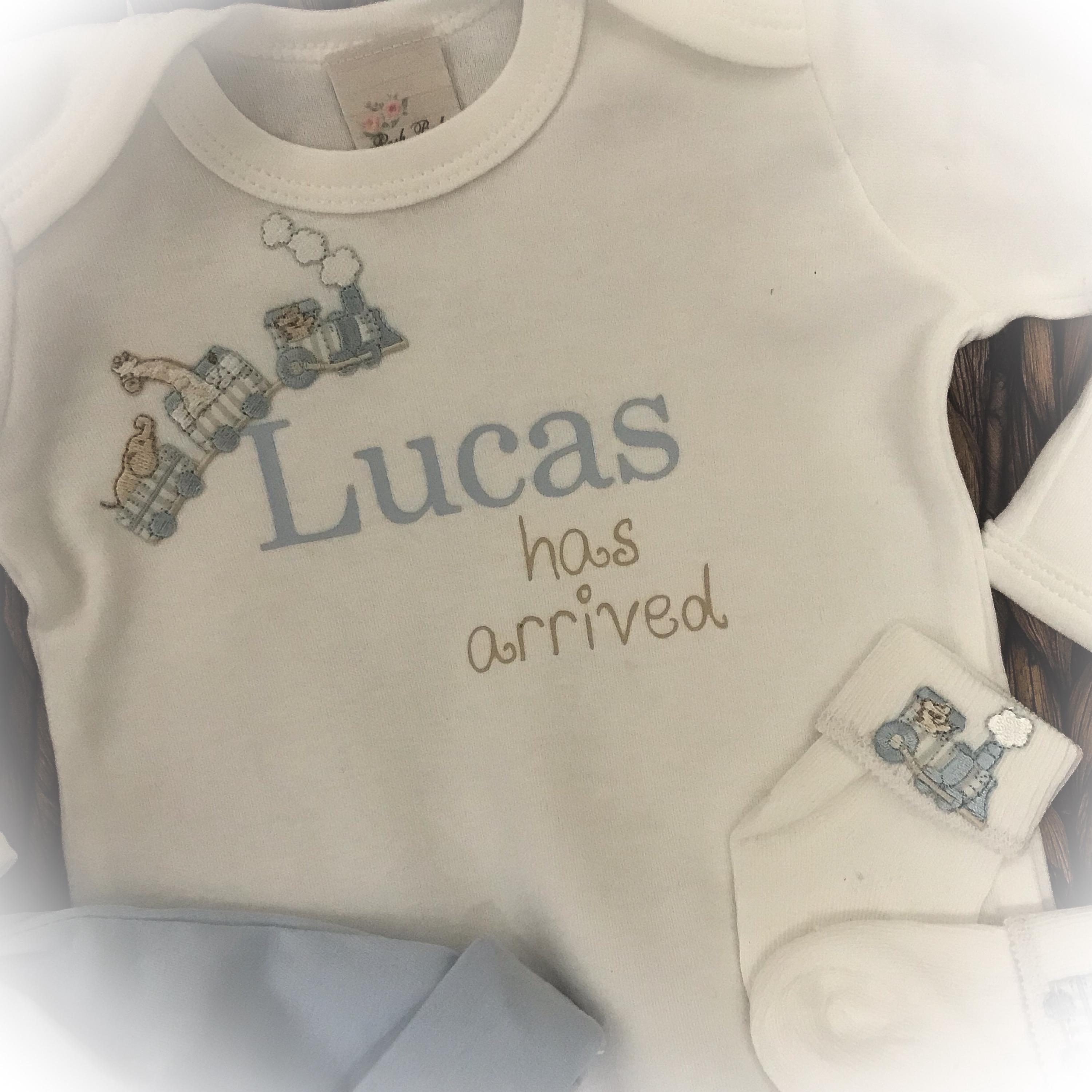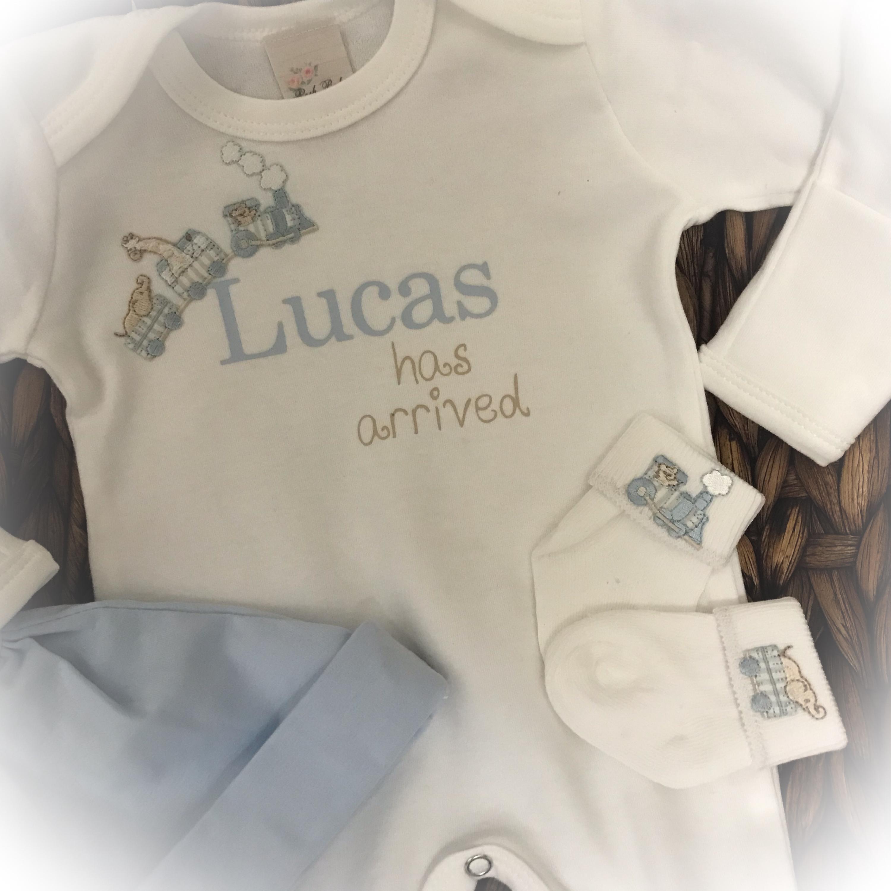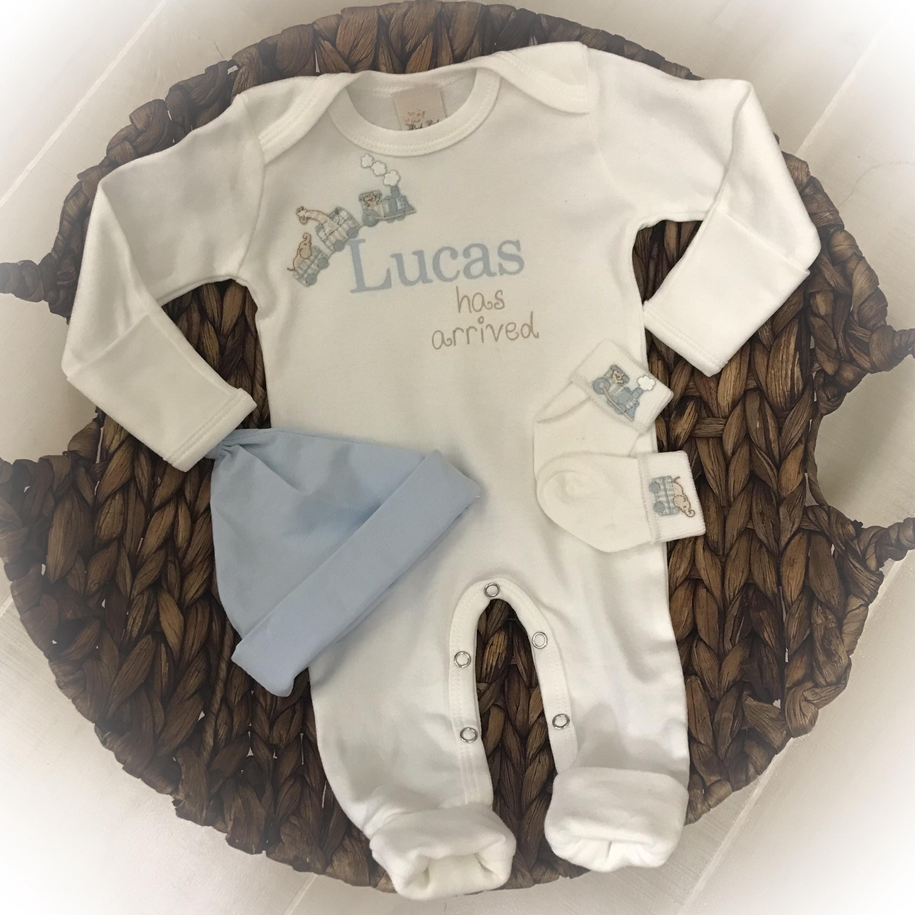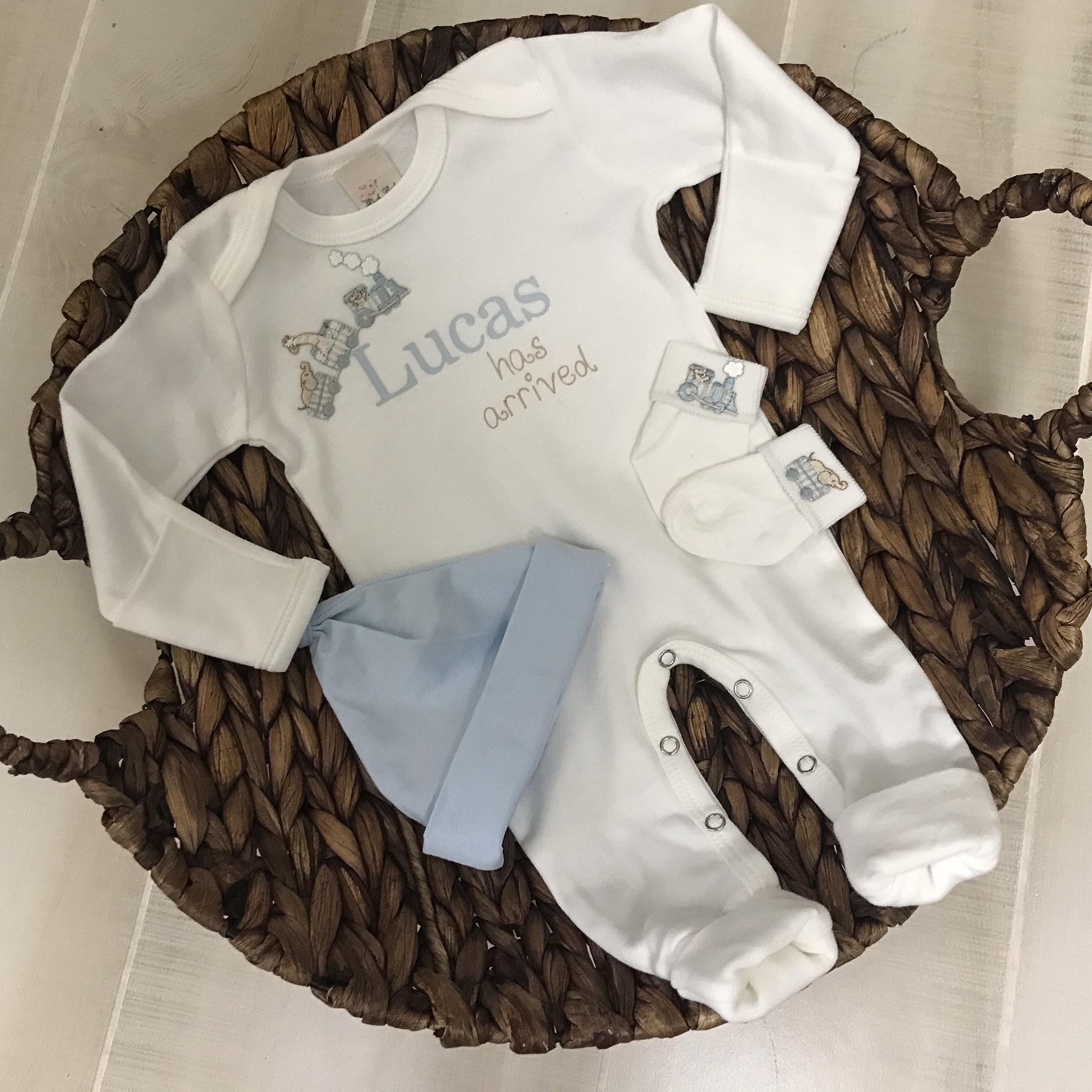 This Adorable white romper is perfect for bringing your little man home or first photos. You may add the optional blue hat and matching socks.