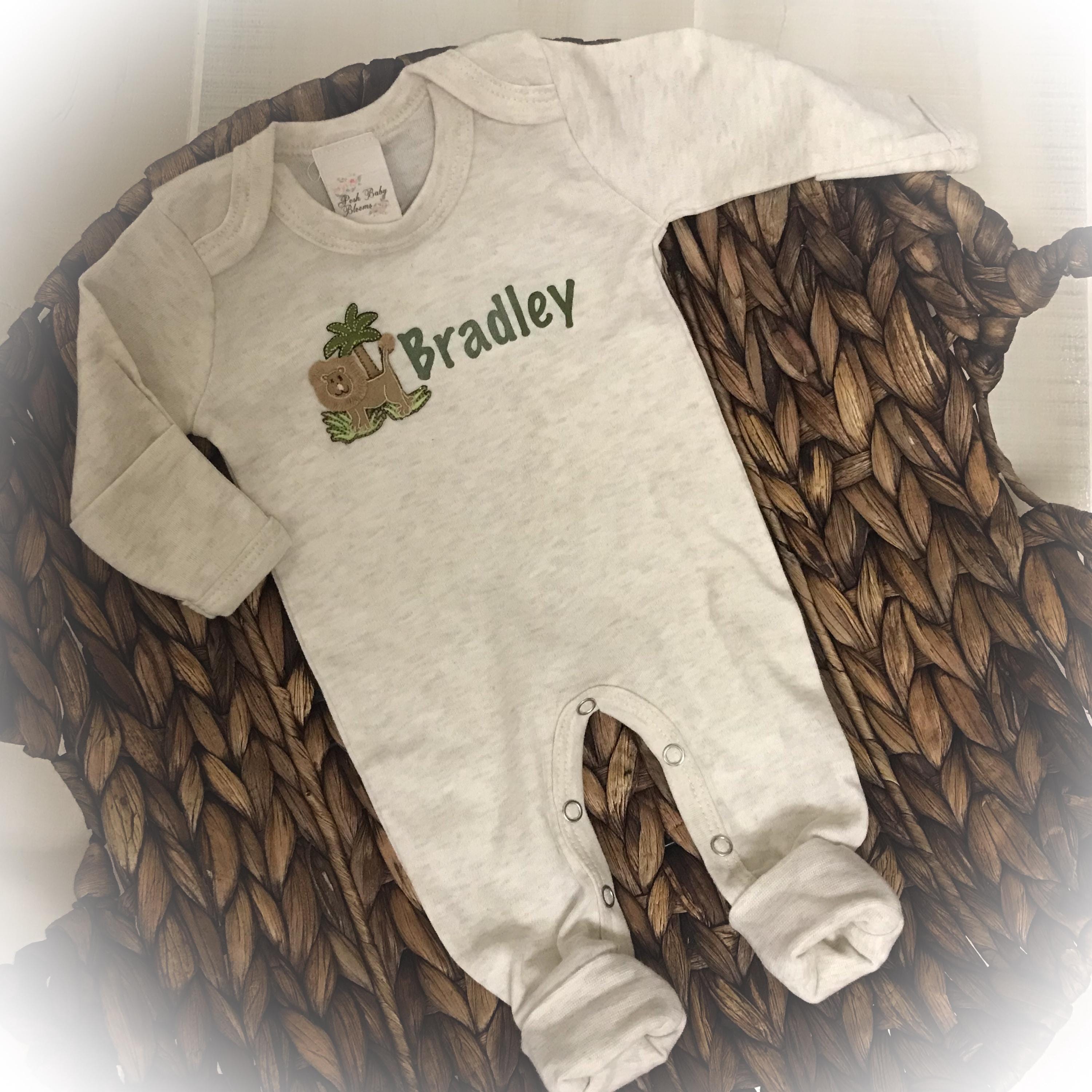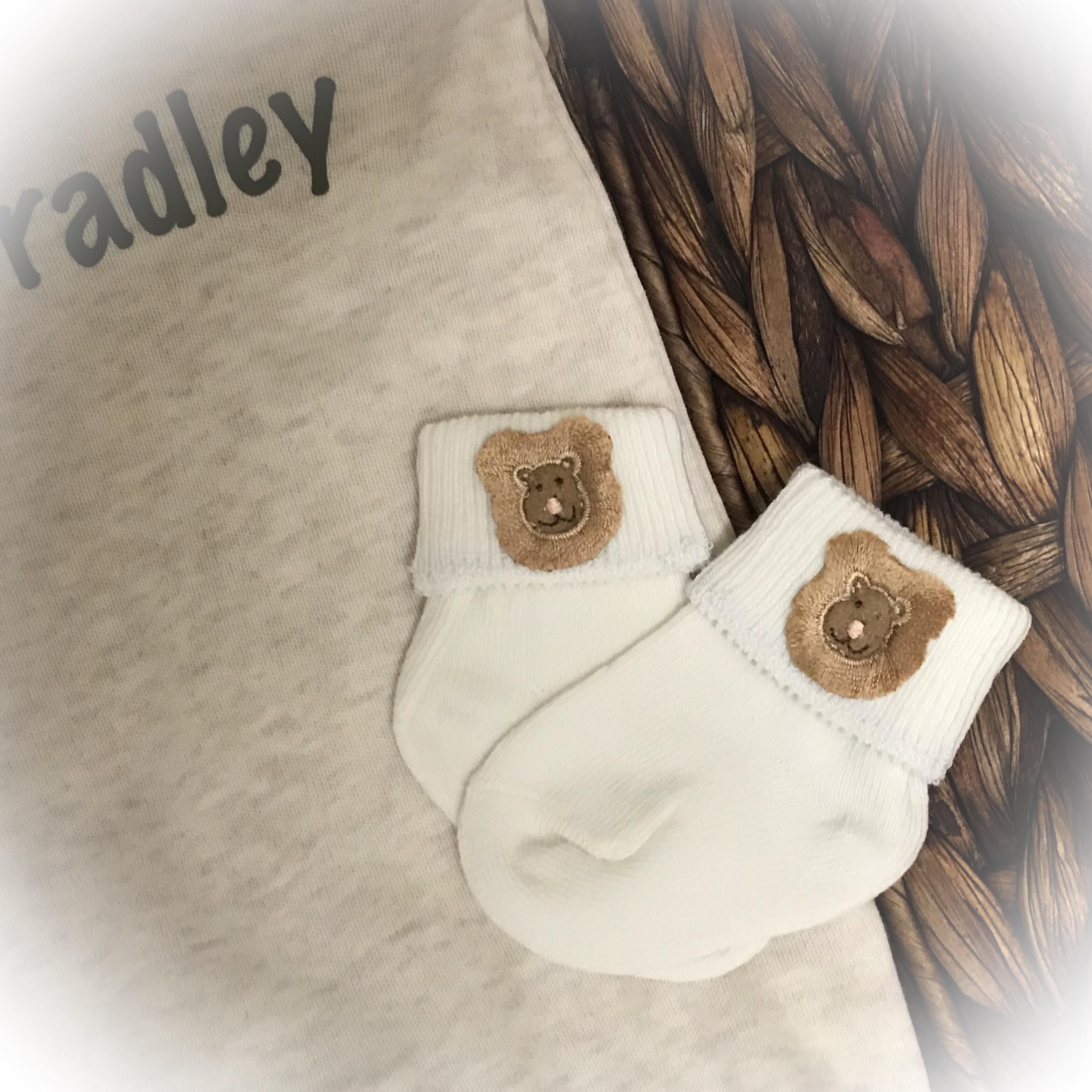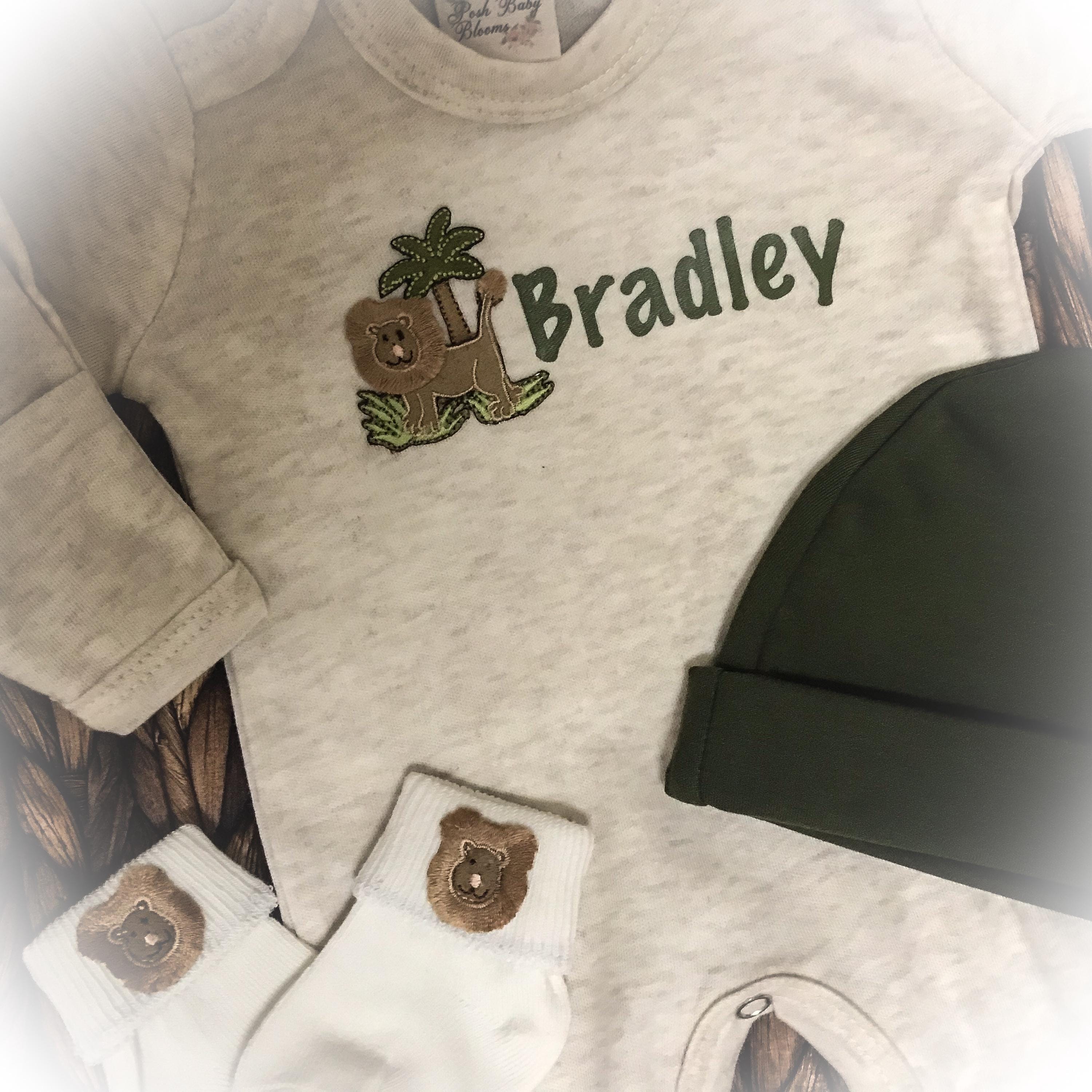 This Adorable beige romper is perfect for bringing your little man home or first photos. You may add the optional olive green hat and matching socks.
