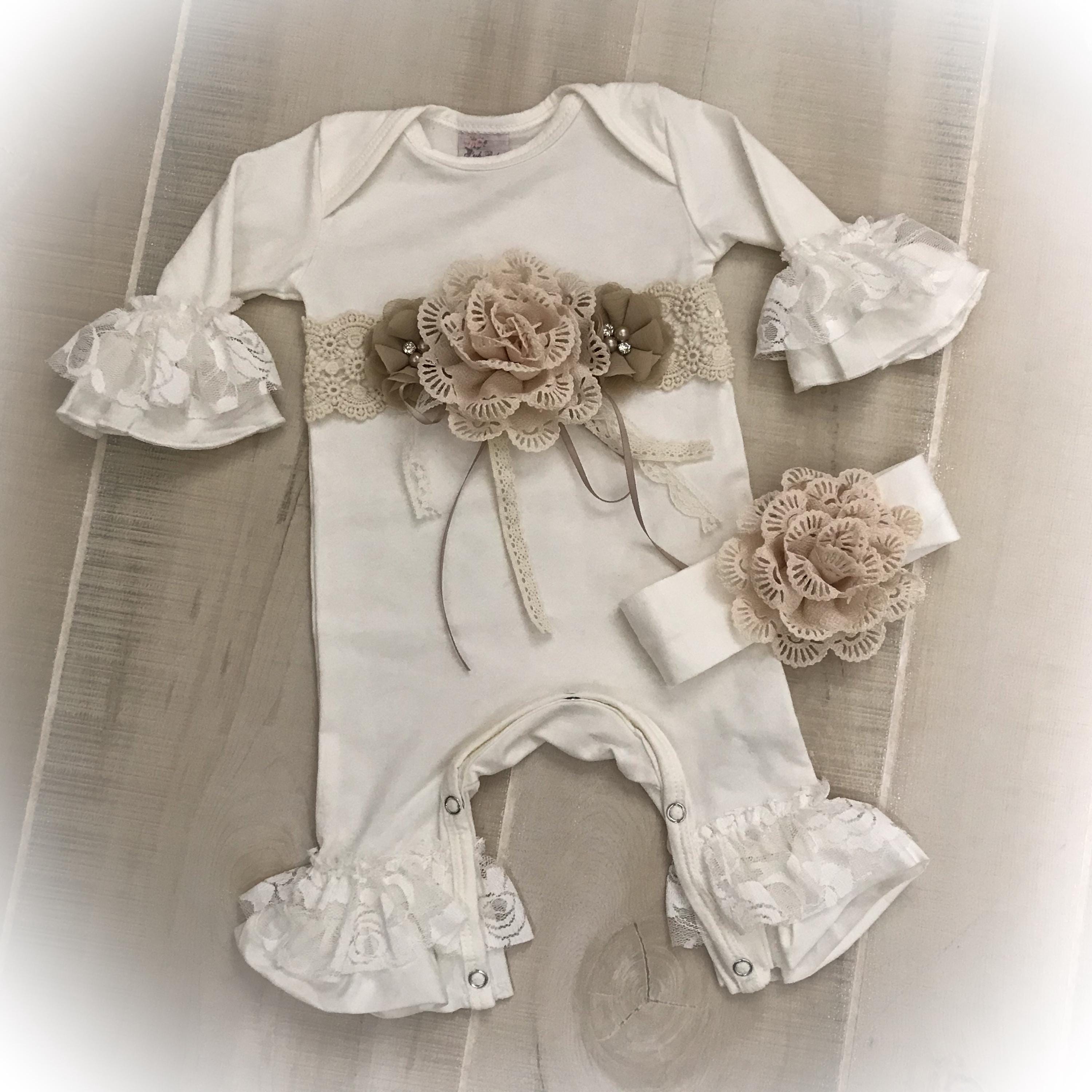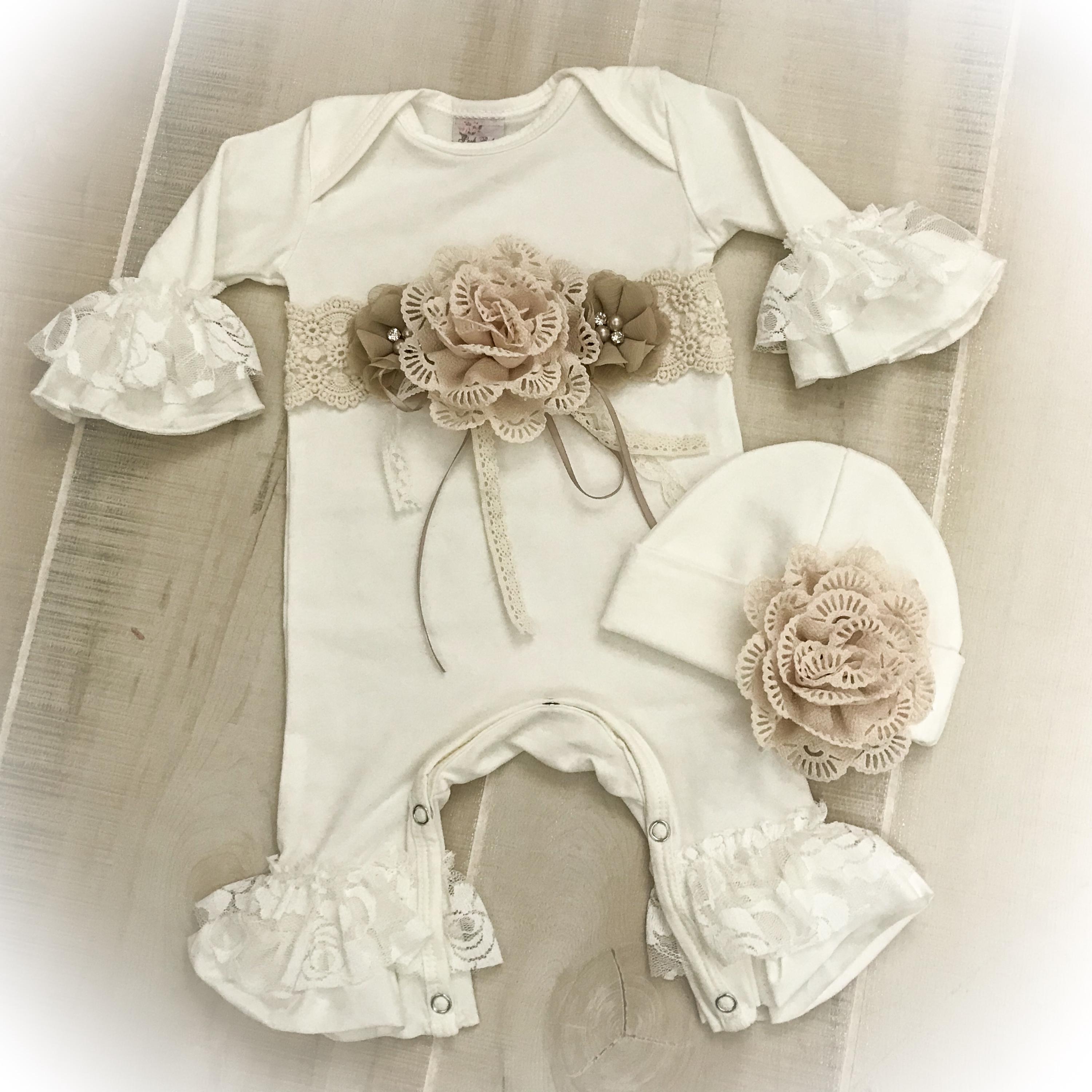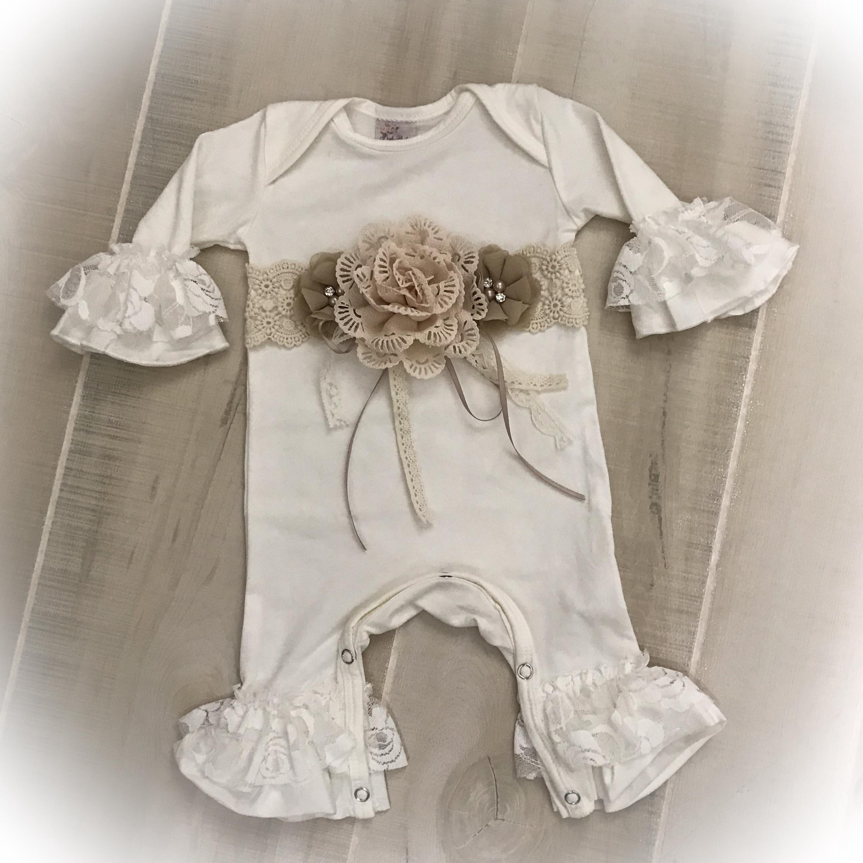 Welcome your little one home in this adorable off-white lace ruffle romper. The romper features beige venice across the yoke accented with lovely beige and tan flowers and ribbon and lace streamers.