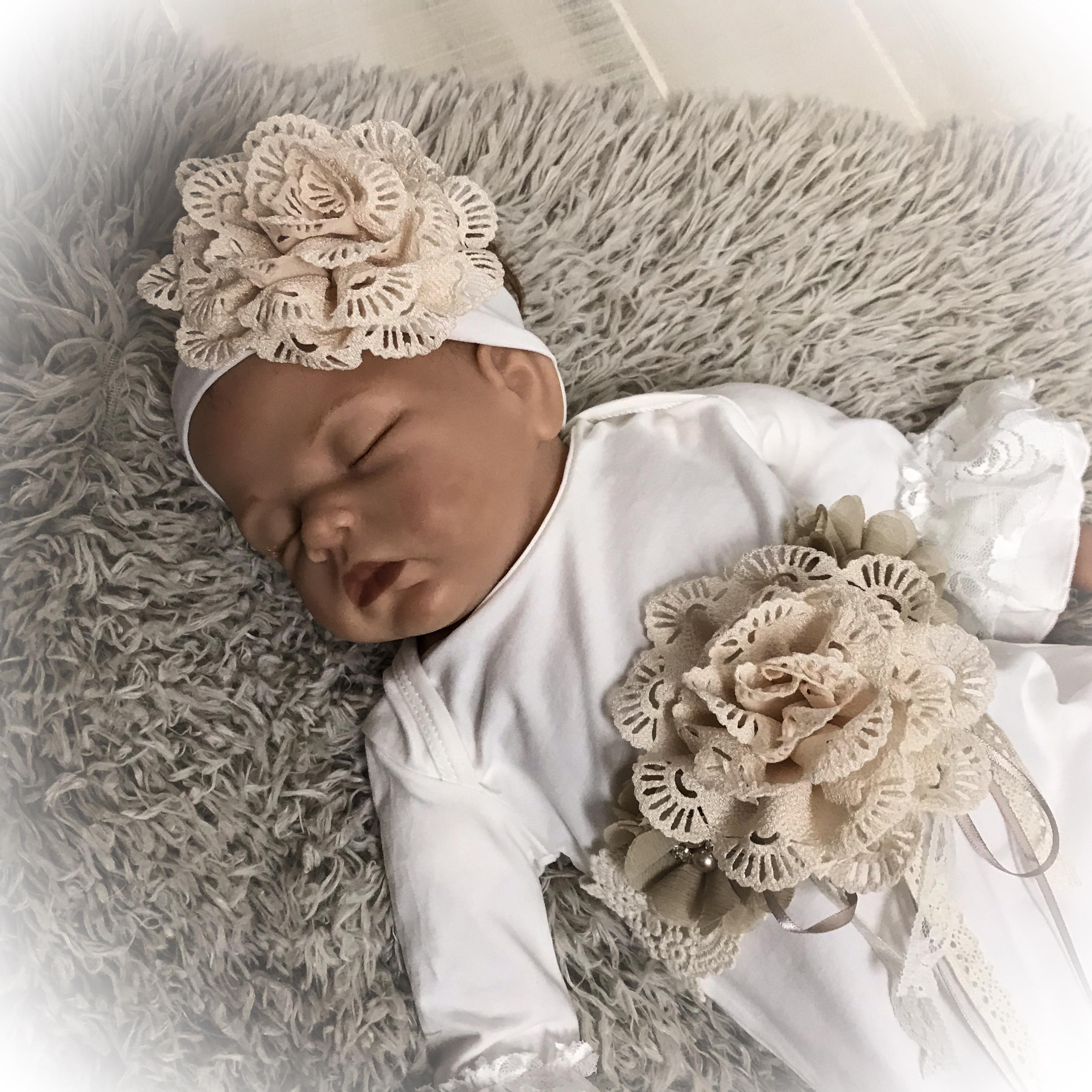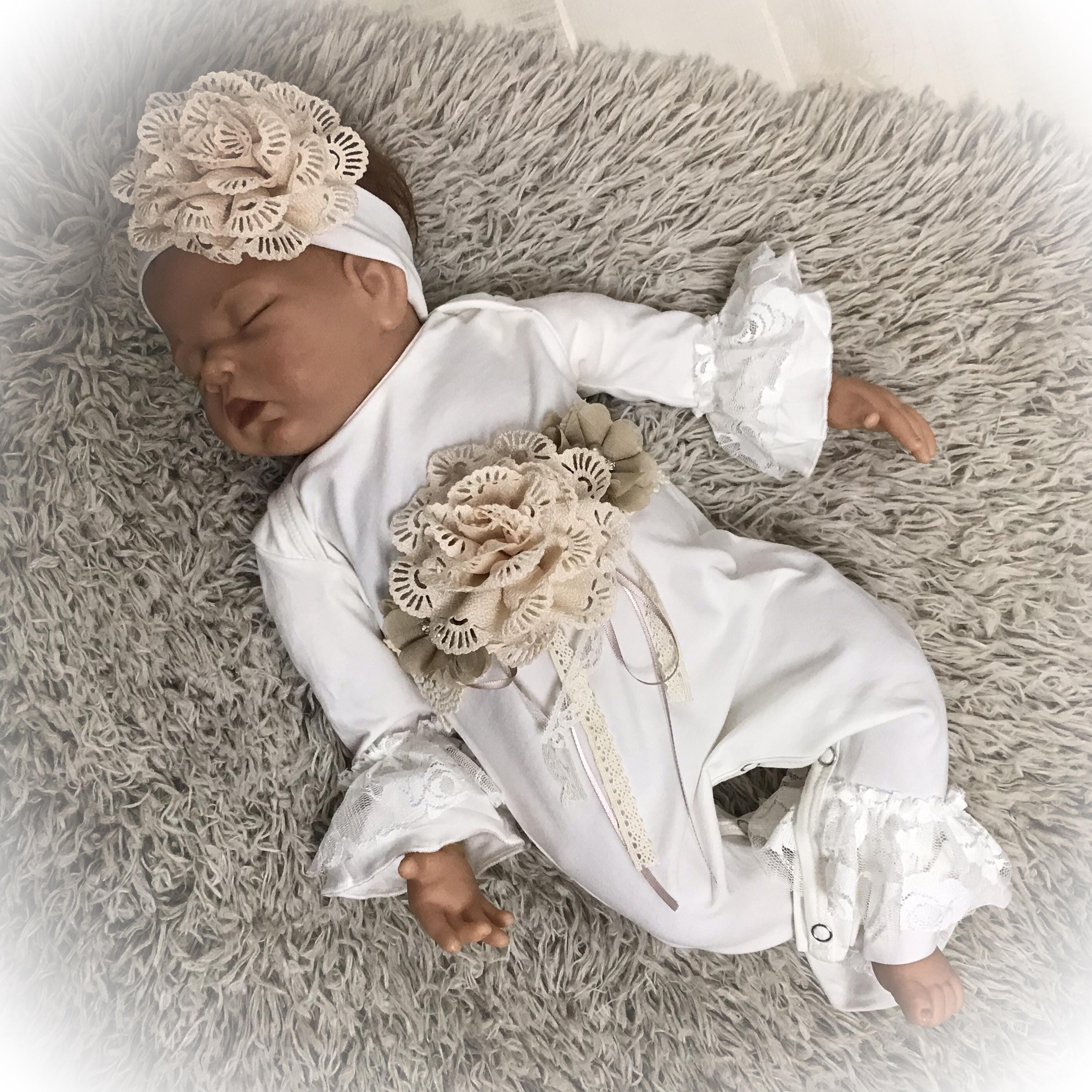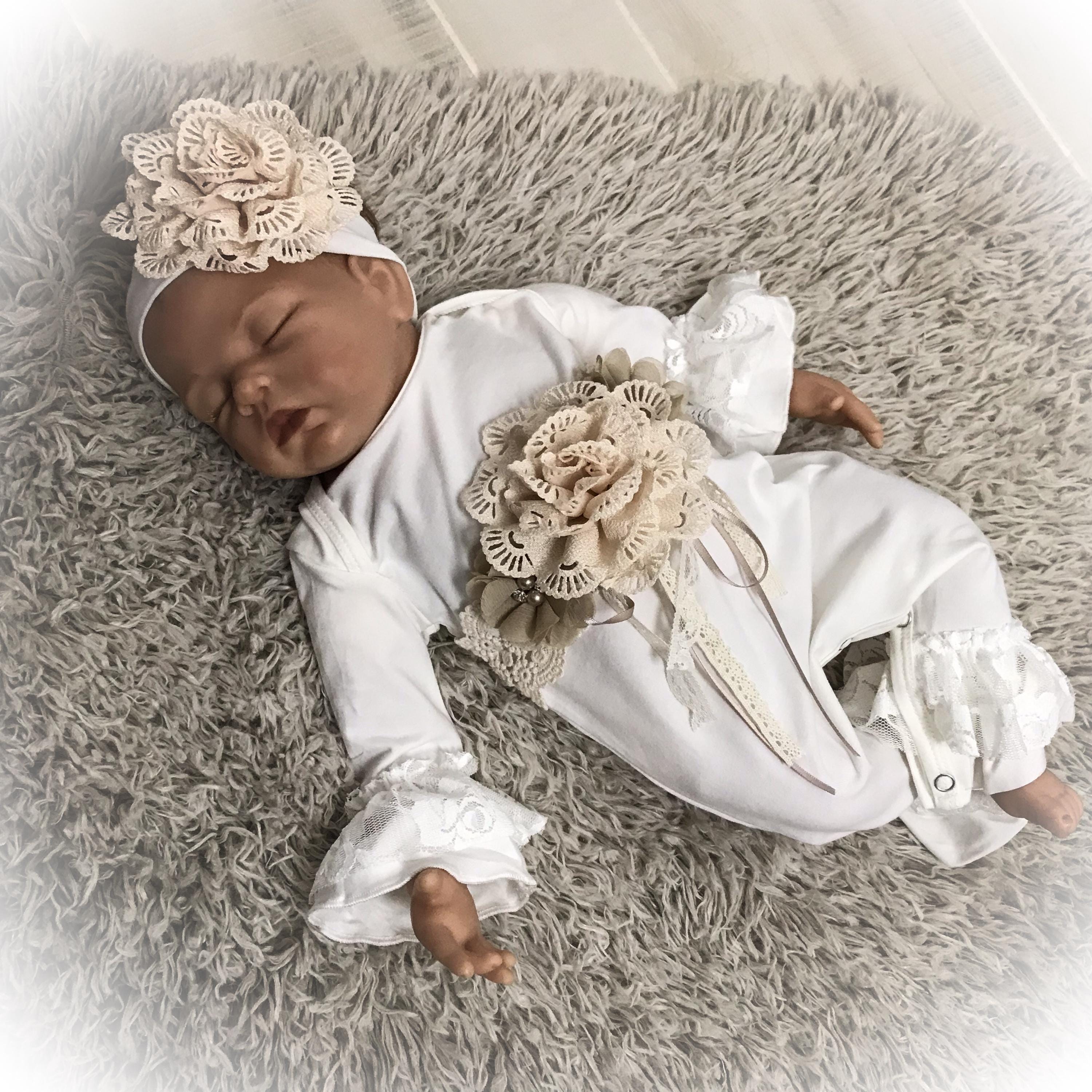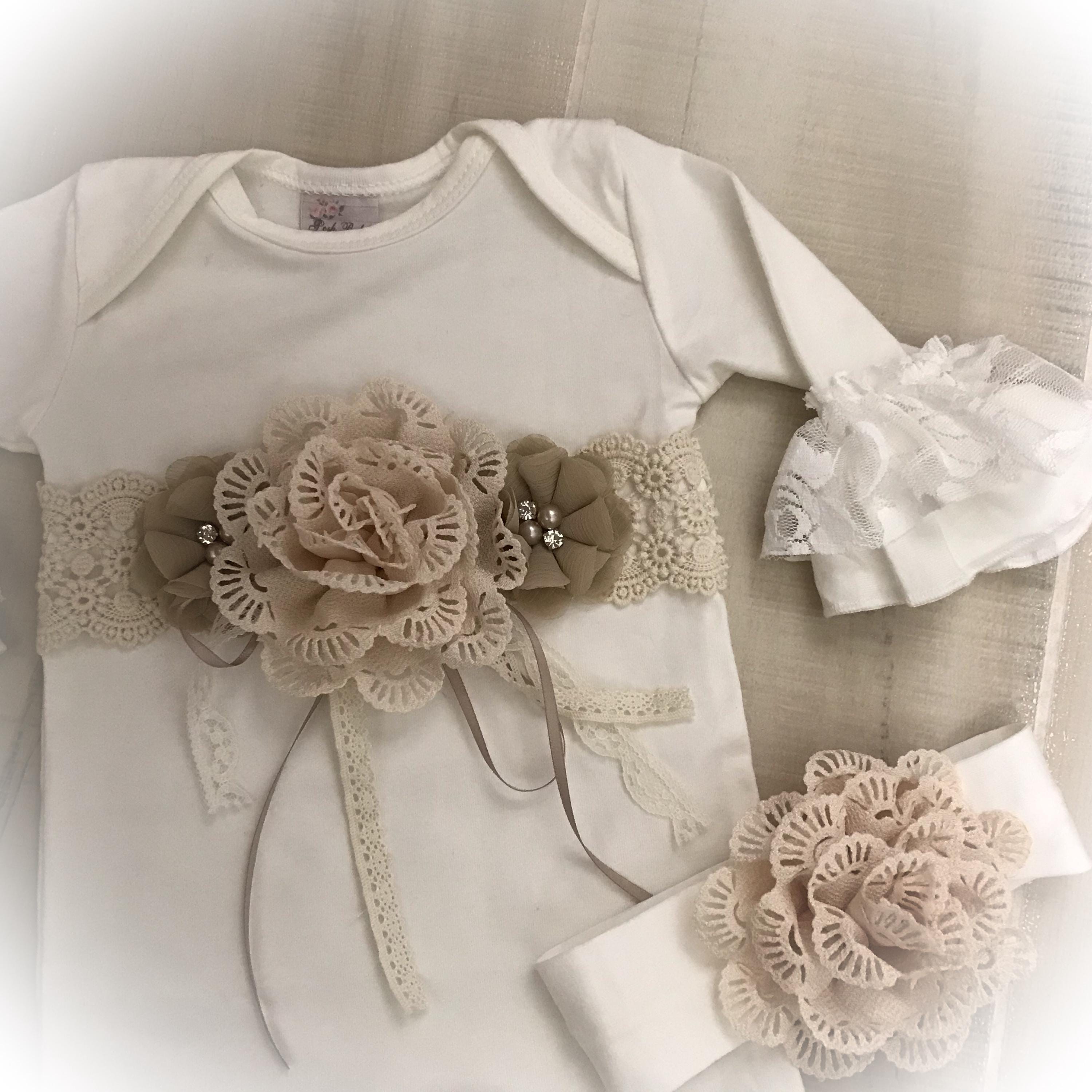 Welcome your little one home in this adorable off-white lace ruffle romper. The romper features beige venice across the yoke accented with lovely beige and tan flowers and ribbon and lace streamers.