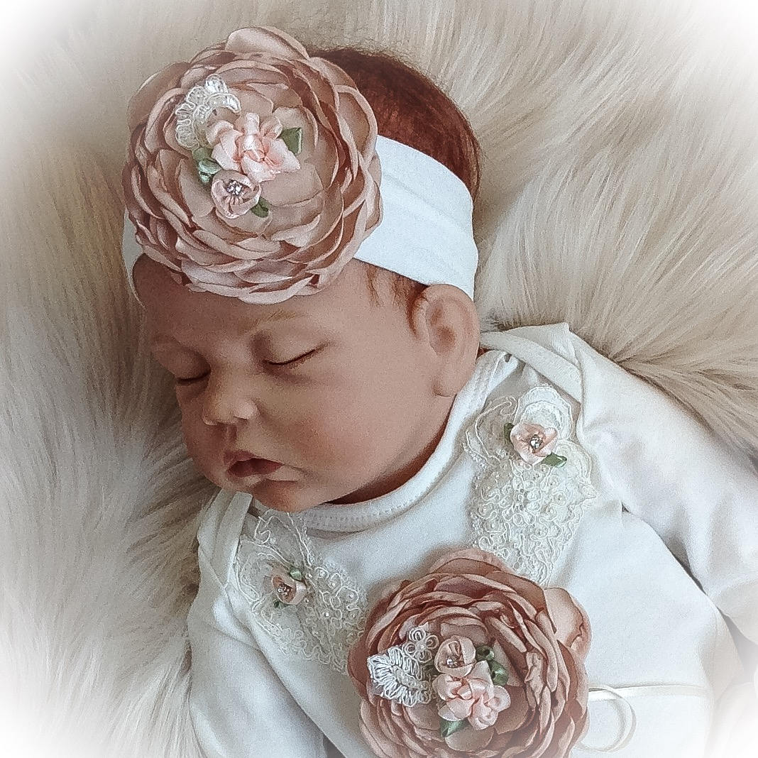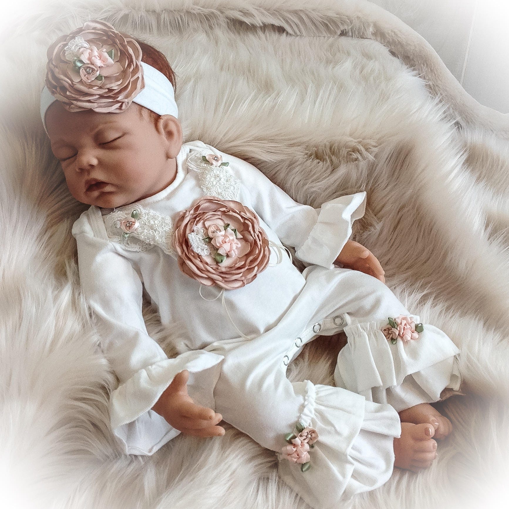Welcome your little one home in this adorable ruffle romper. The romper features Ivory sequin and beaded lace trim and a fabulous mocha satin flower. Such a unique outfit for your special little lady. Perfect for those first photos.