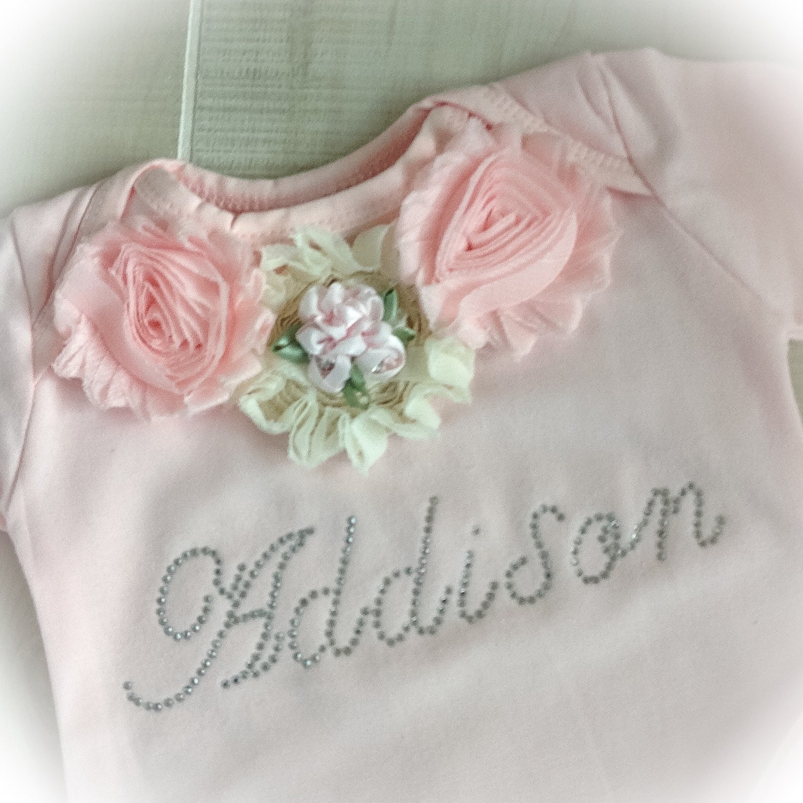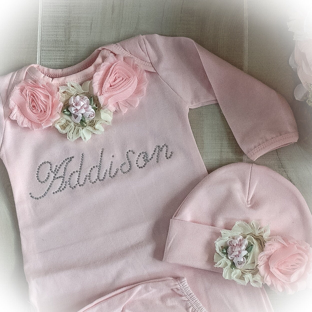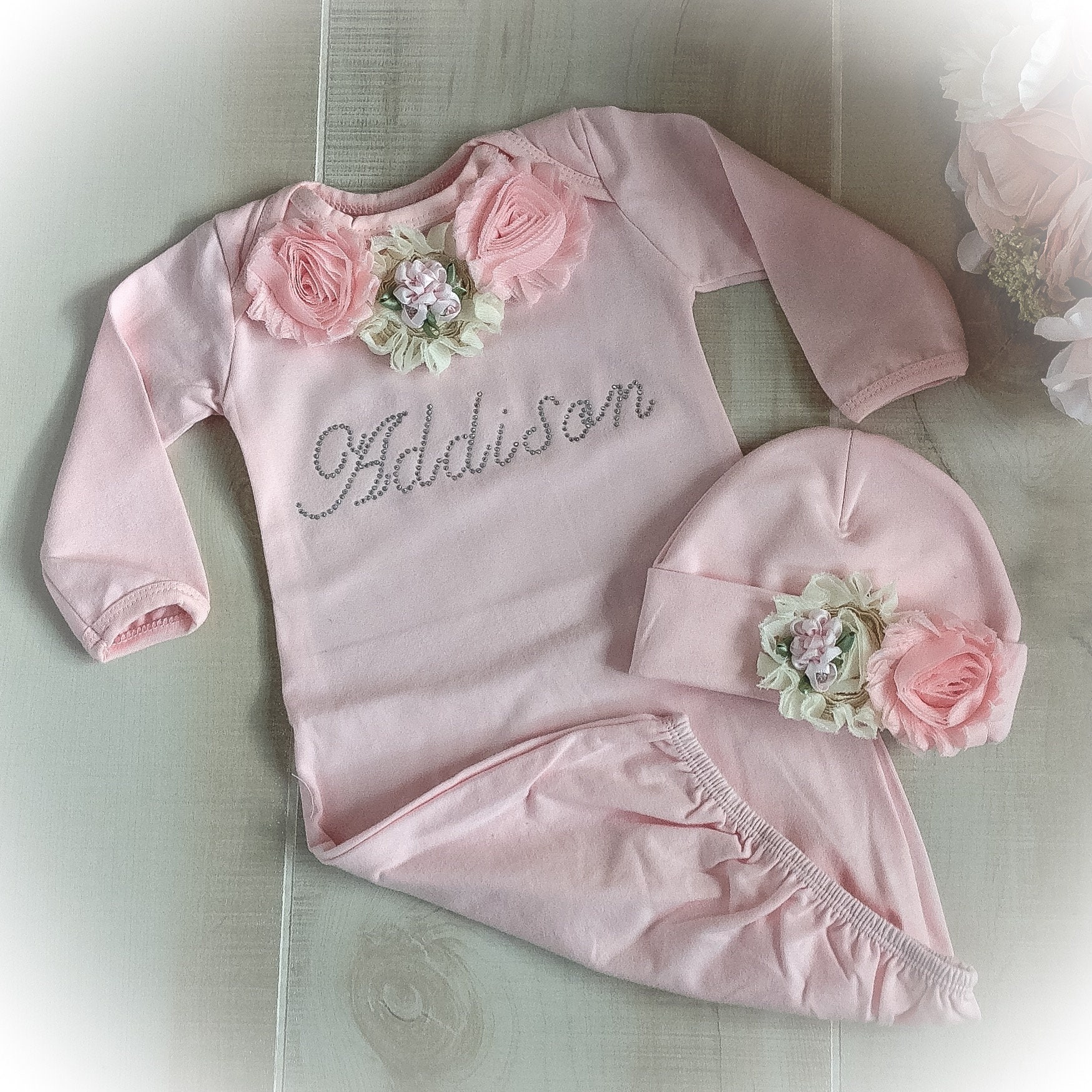 This personalized newborn girl coming home gown will be the talk of the maternity ward! The beautiful pink gown is featured in a soft Cotton fabric. The yoke features a beautiful bouquet of Shabby flowers along with your baby's name in sparkling rhinestones.
