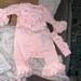 Welcome your little one home in this adorable lace ruffle romper. The soft pink romper features beautiful pink lace on the legs and sleeves. The yoke is adorned with shabby chiffon flowers accented with delicate satin roses and bow.