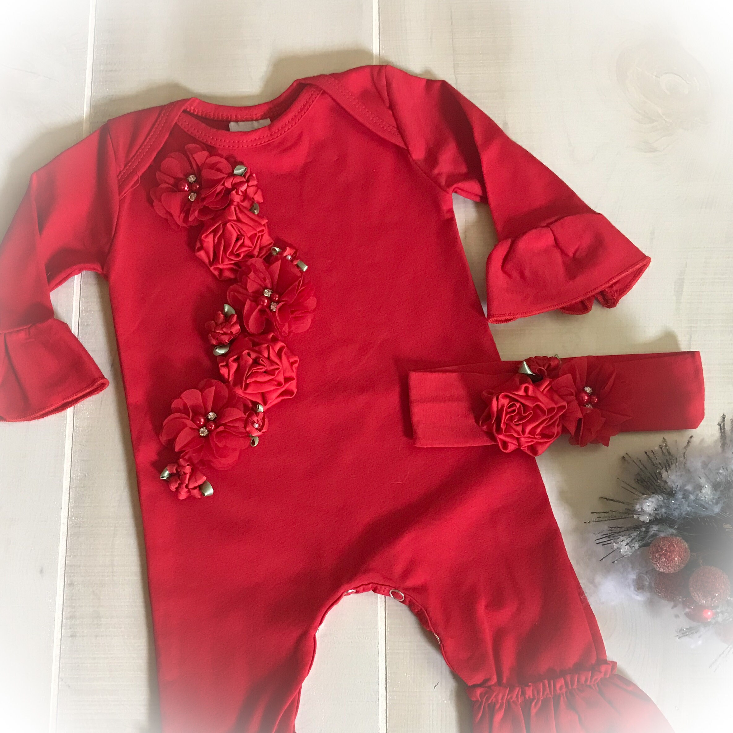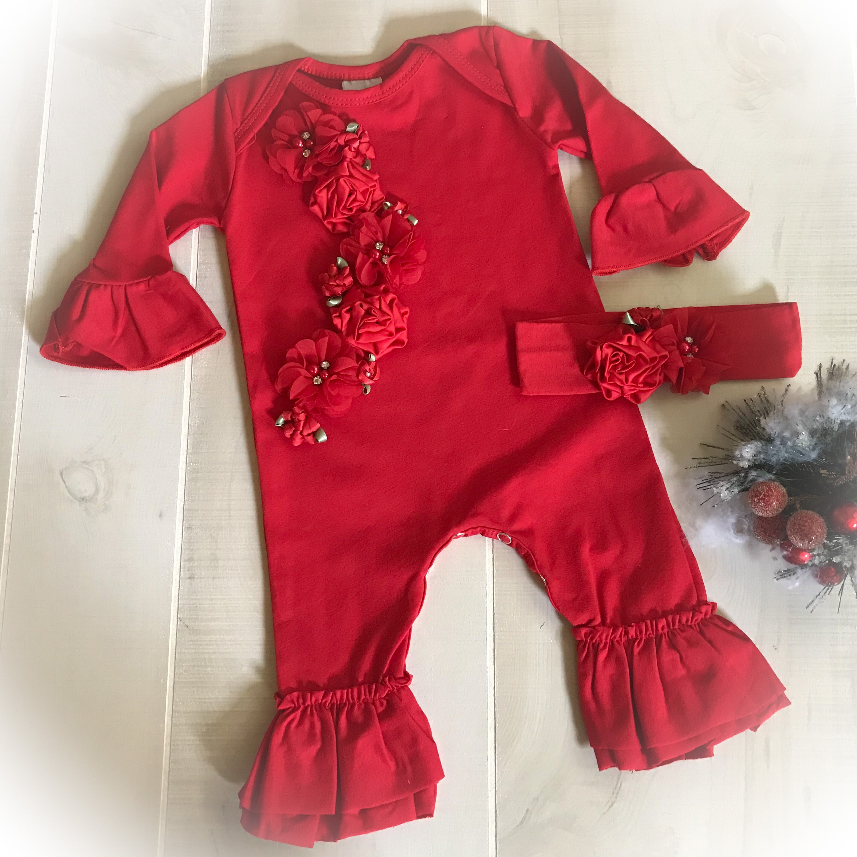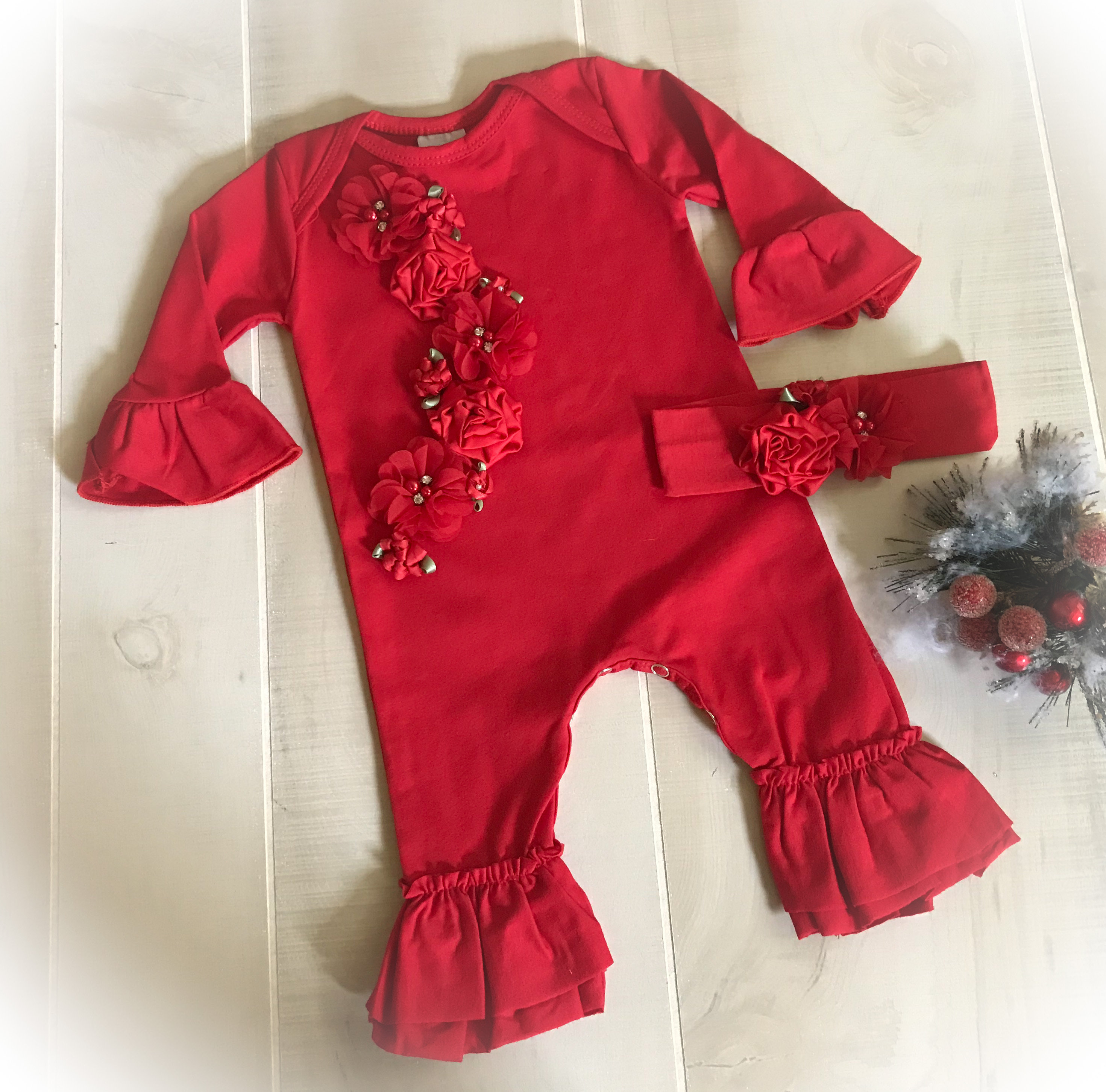 This adorable red baby girl romper will make the perfect Christmas outfit or special photo. The soft cotton romper features double ruffles on the legs with red chiffon and satin flowers cascading down the front.