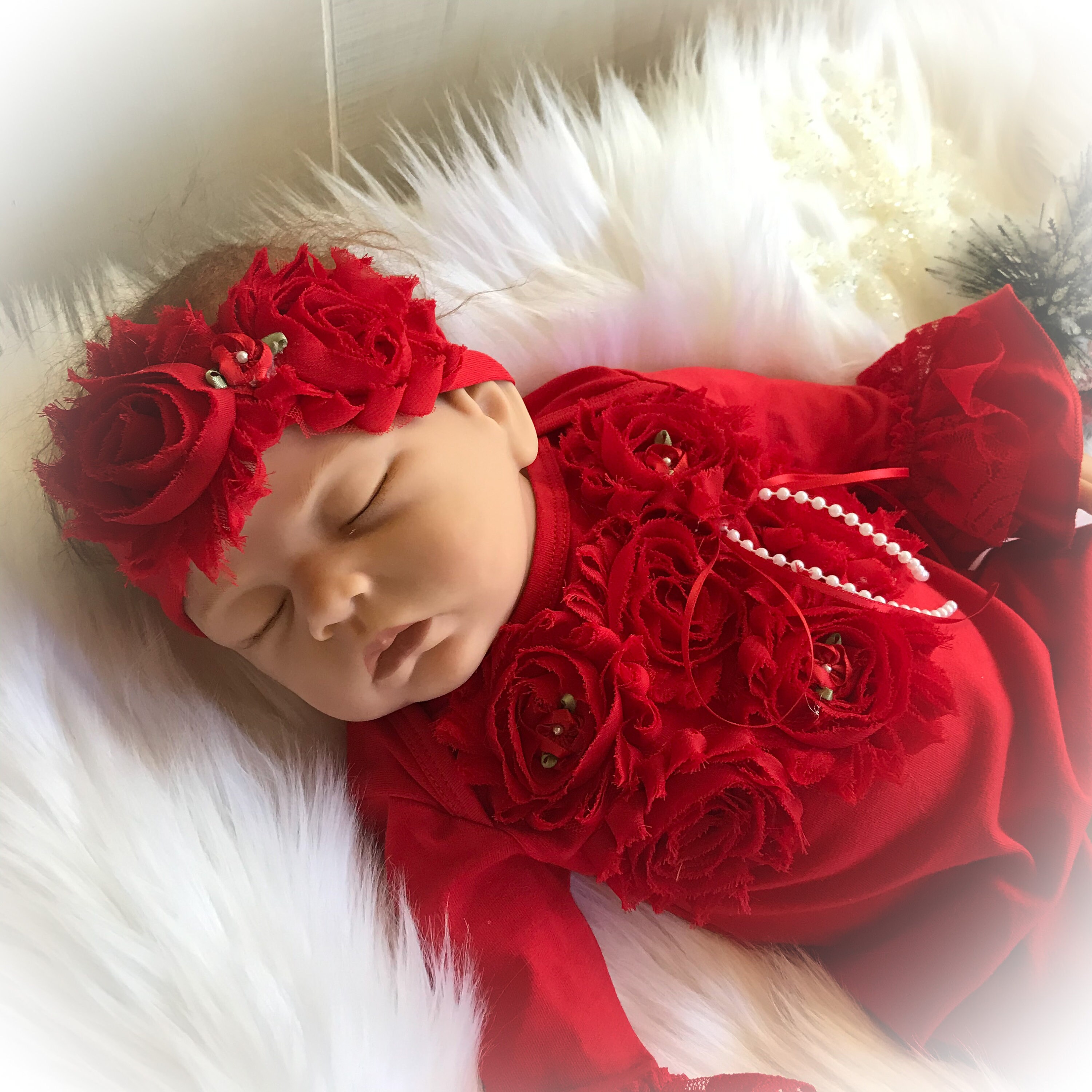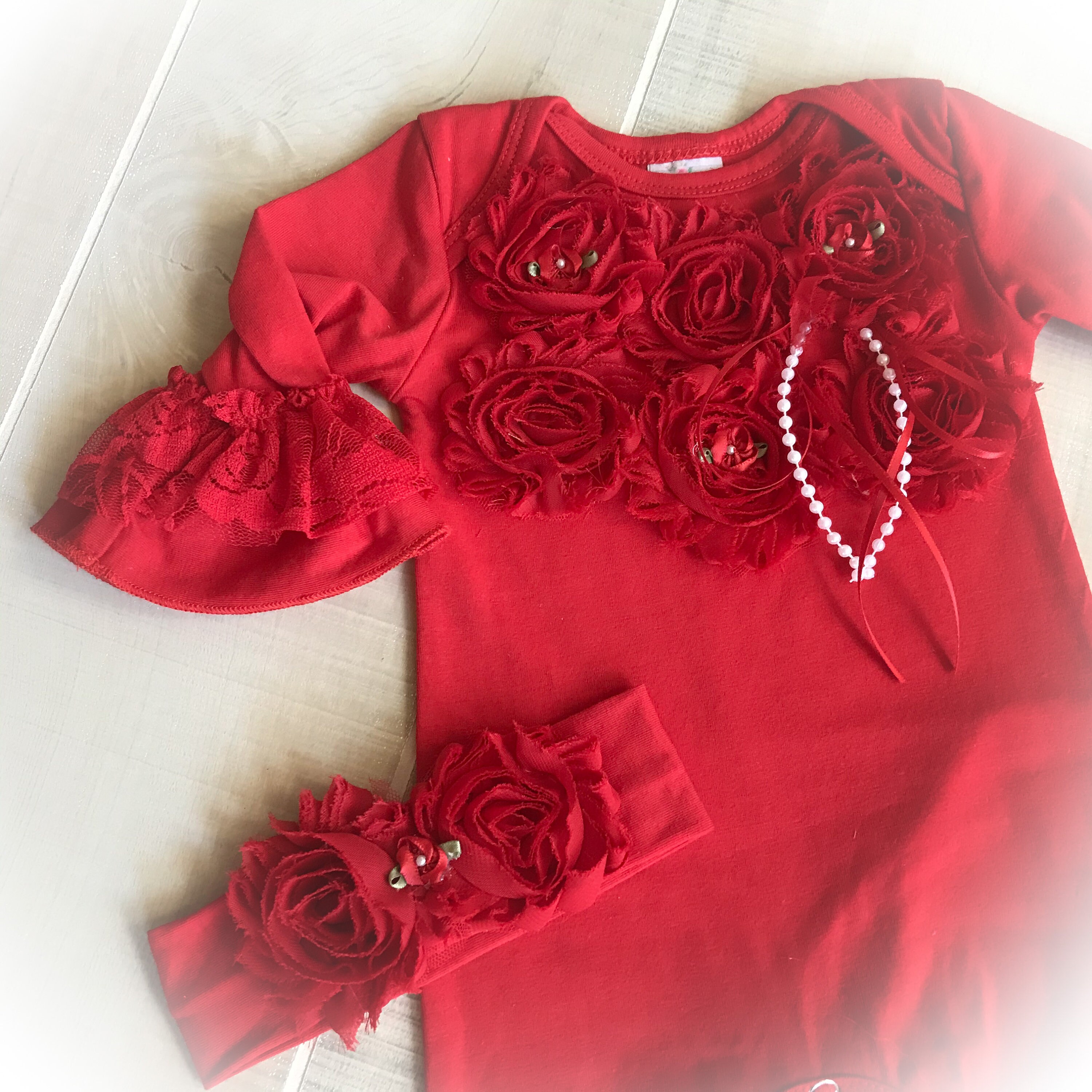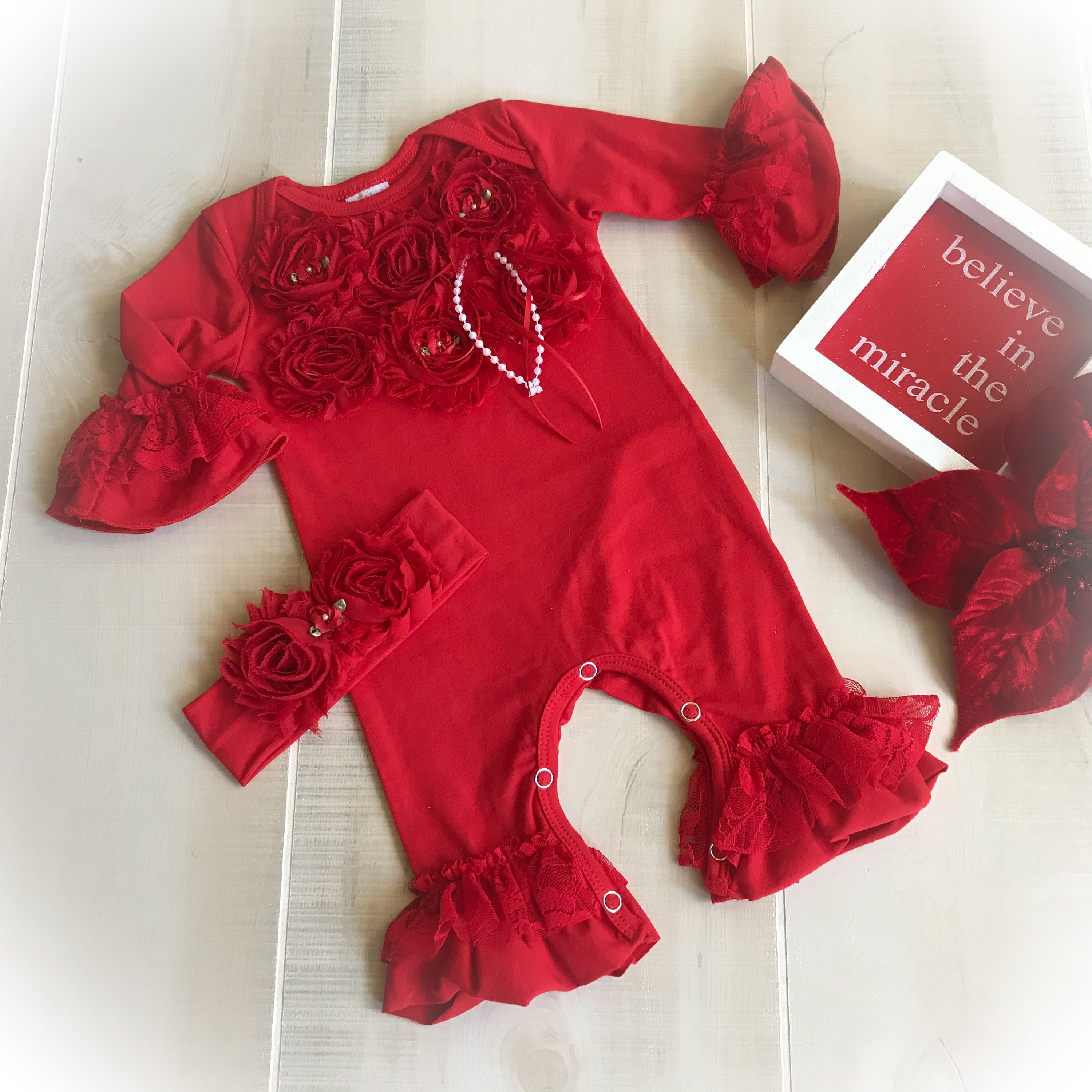 Welcome your little one home in this adorable lace ruffle romper. The romper features beautiful soft red lace on the legs and sleeves. The yoke is adorned with shabby chiffon flowers accented with delicate satin roses and bow.