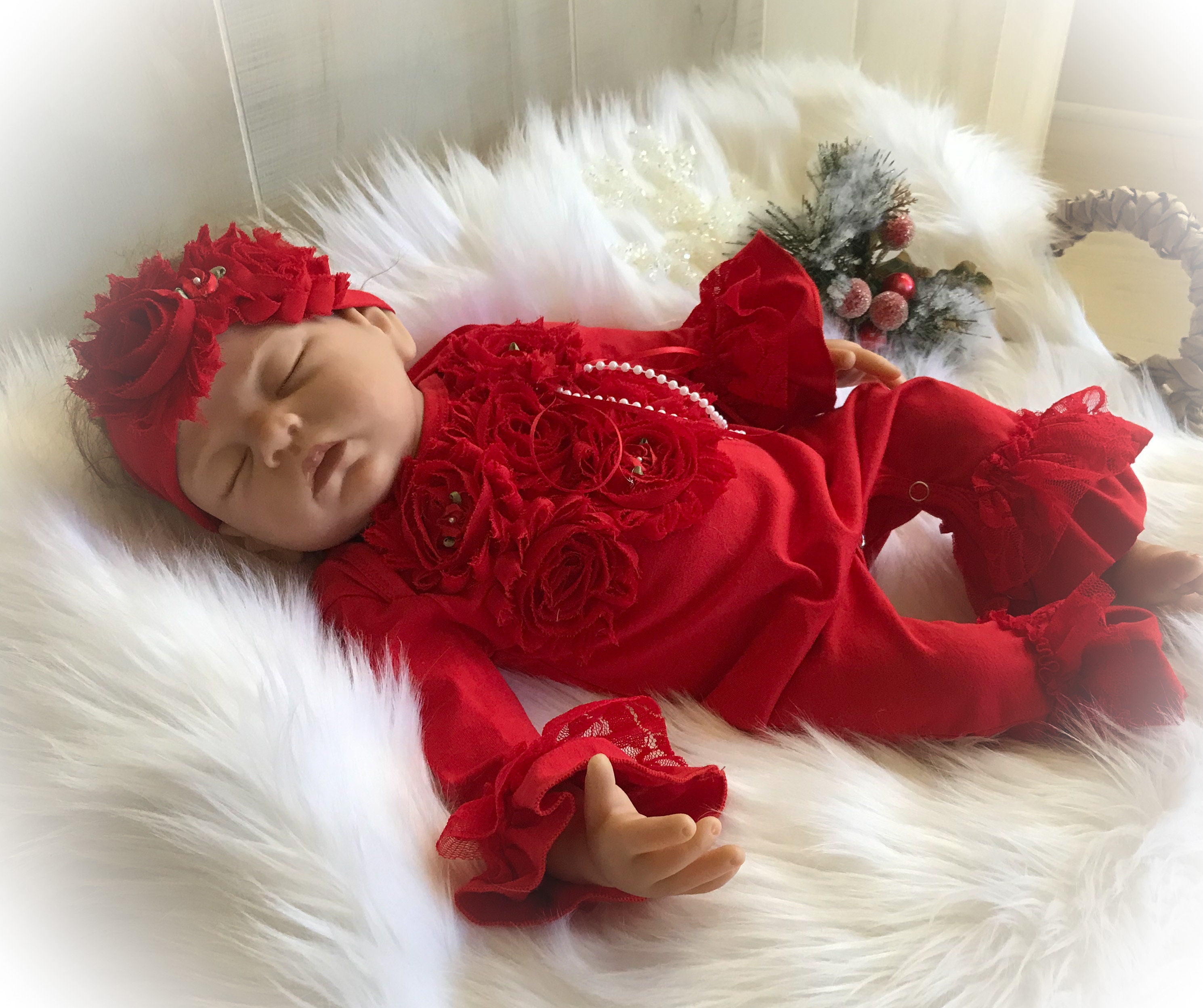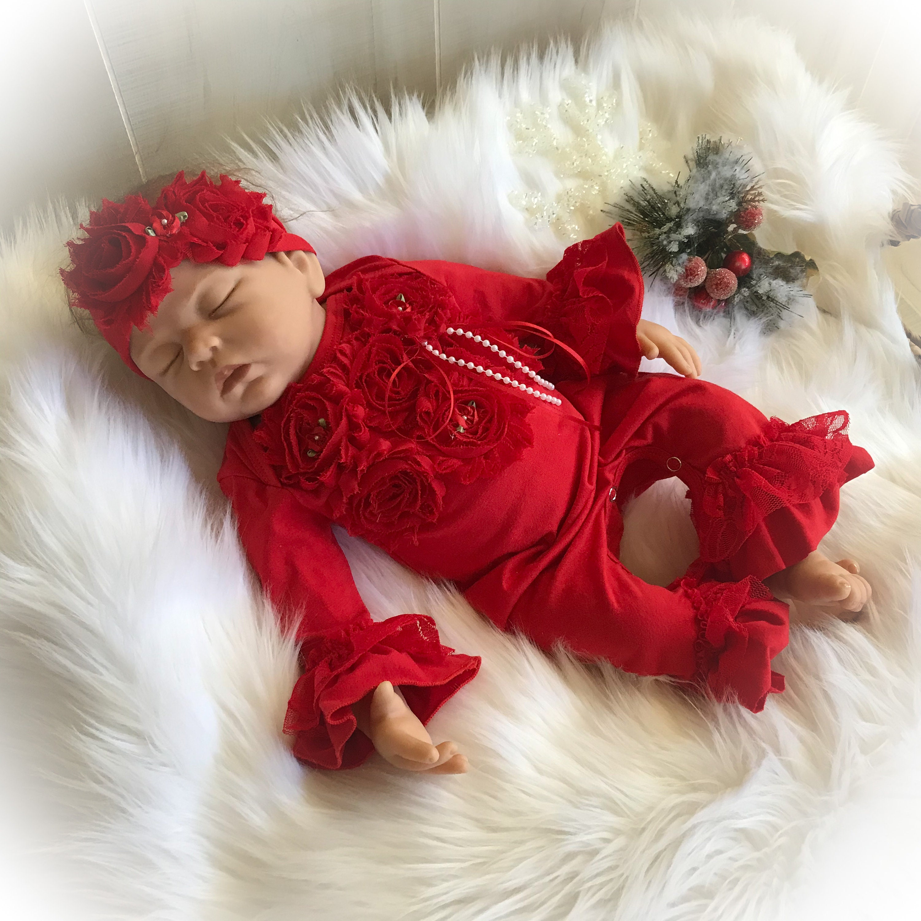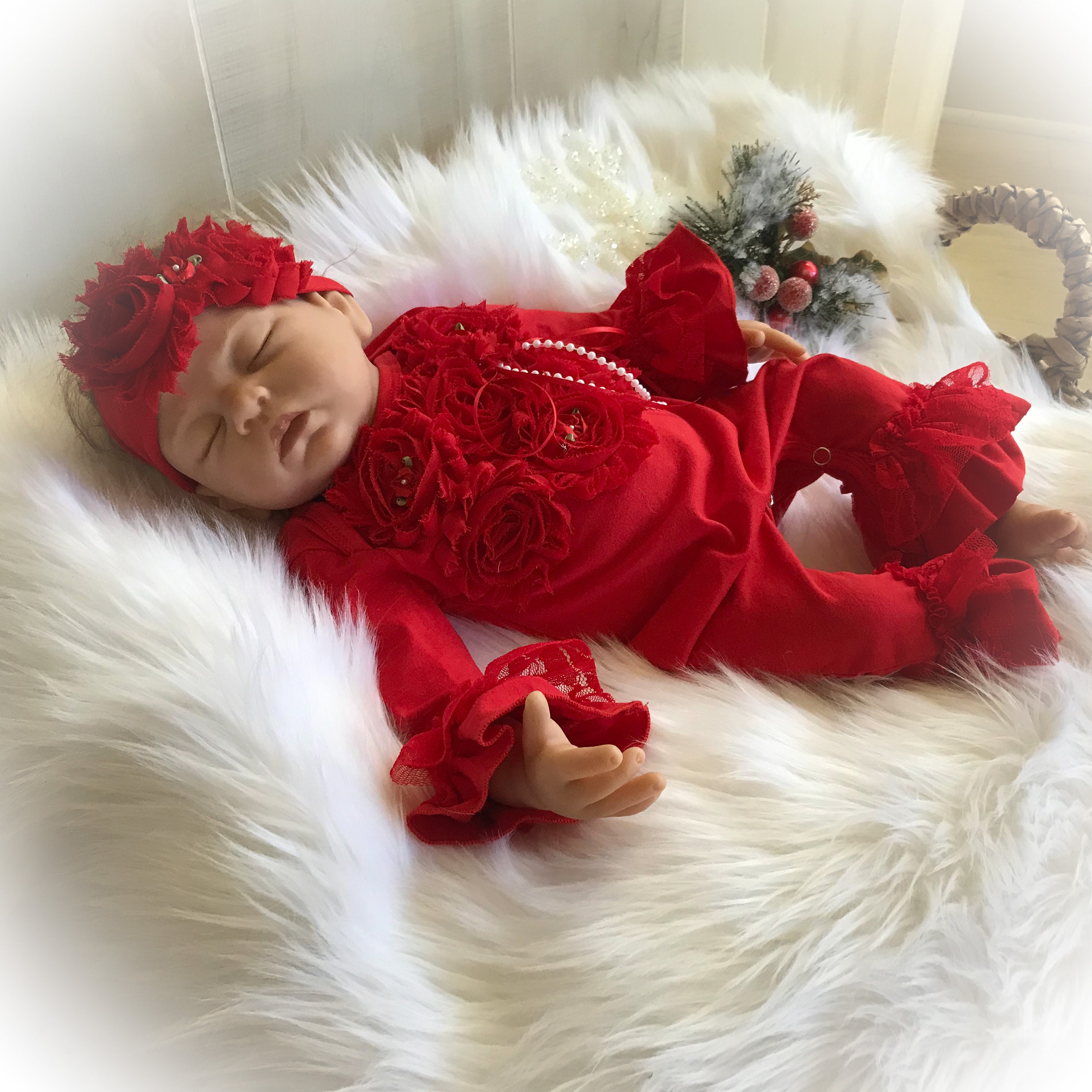 Welcome your little one home in this adorable lace ruffle romper. The romper features beautiful soft red lace on the legs and sleeves. The yoke is adorned with shabby chiffon flowers accented with delicate satin roses and bow.