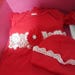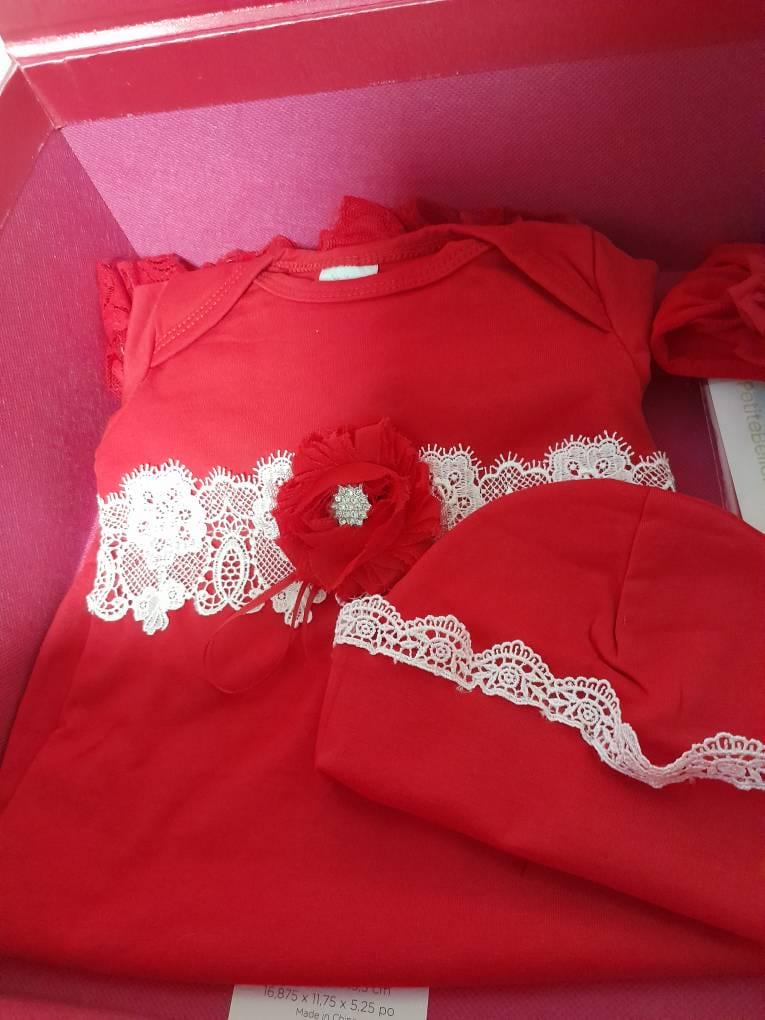 This adorable red baby girl lace gown will make the perfect first Christmas outfit or coming home set.  The soft cotton gown  features rows of lace and chiffon ruffles around the bottom and accented with a stunning white Venice trim across the yoke hi lighted with a red shabby flower and a touch of sparkle with the rhinestone center.