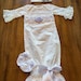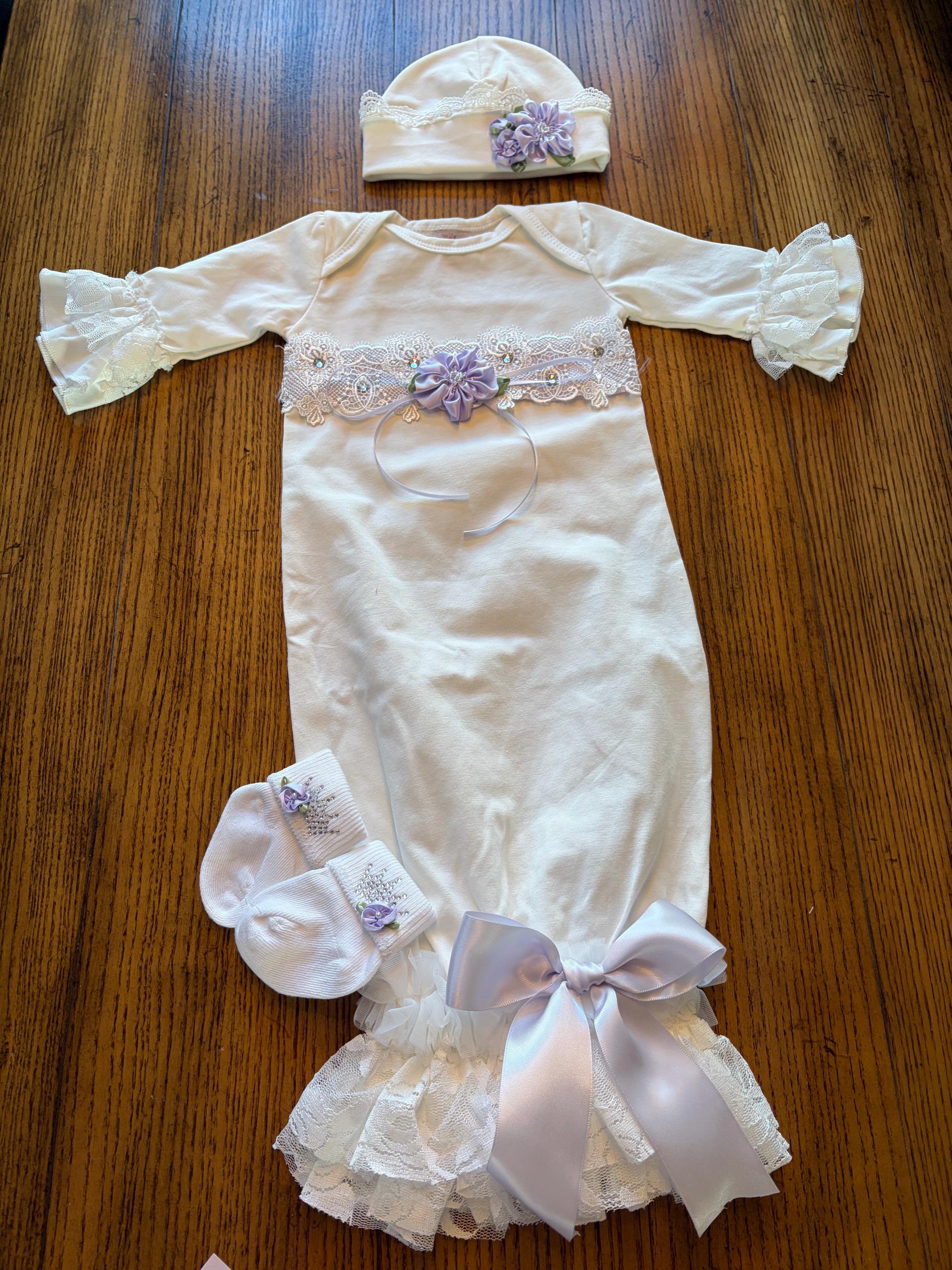 Lavender coming home gown. The stunning ivory gown features soft lace and chiffon trimmed bottom and Ruffle sleeves. A beautiful lavender satin and Venice trimmed yoke includes sparkling crystals and delicate flowers.